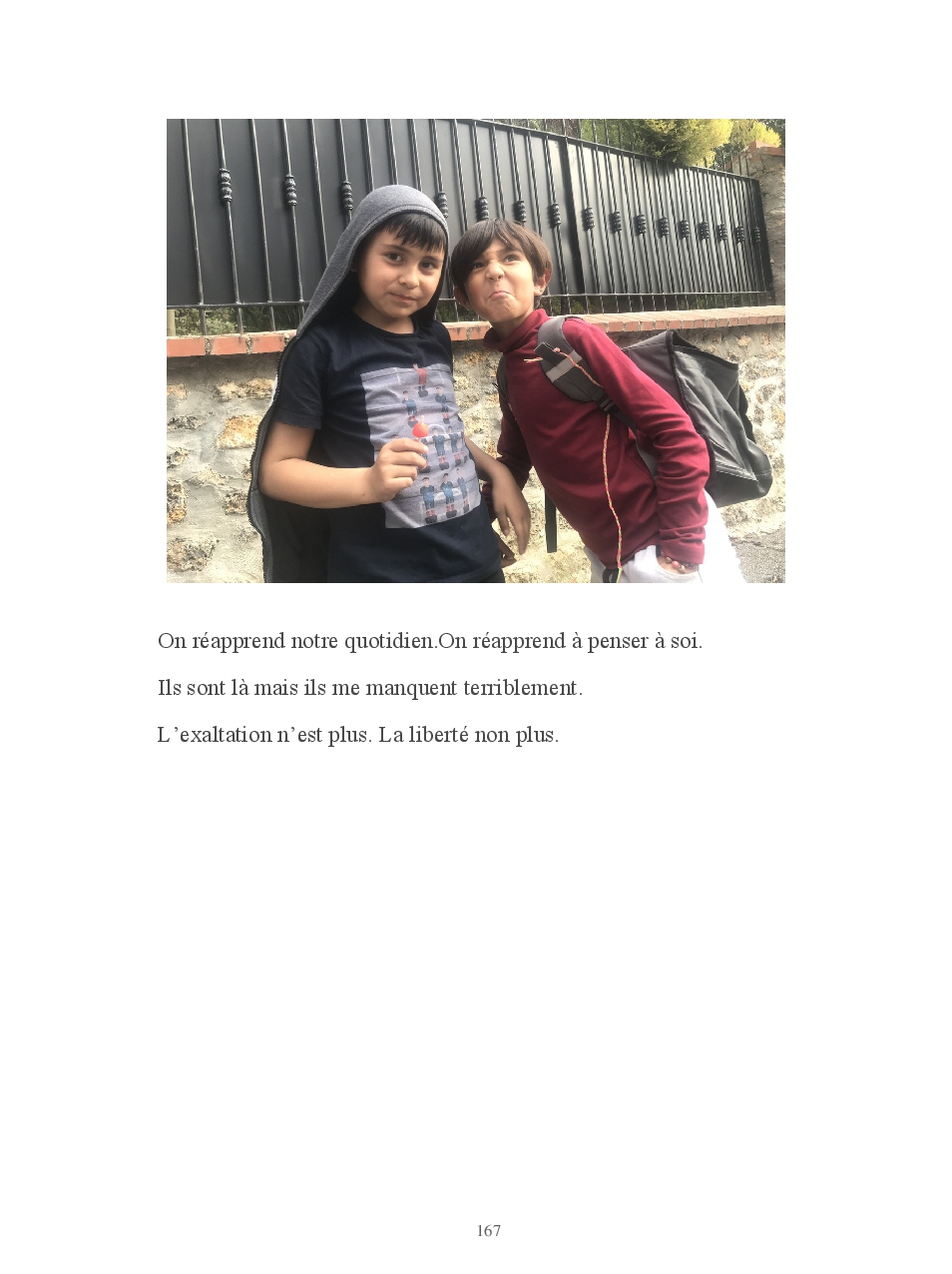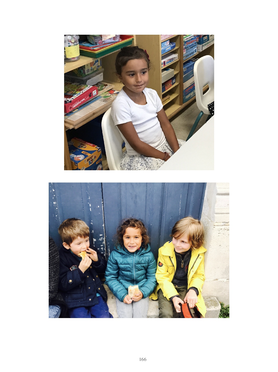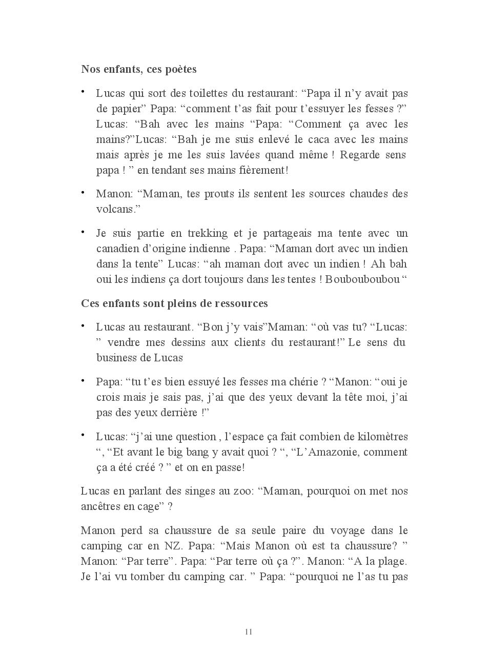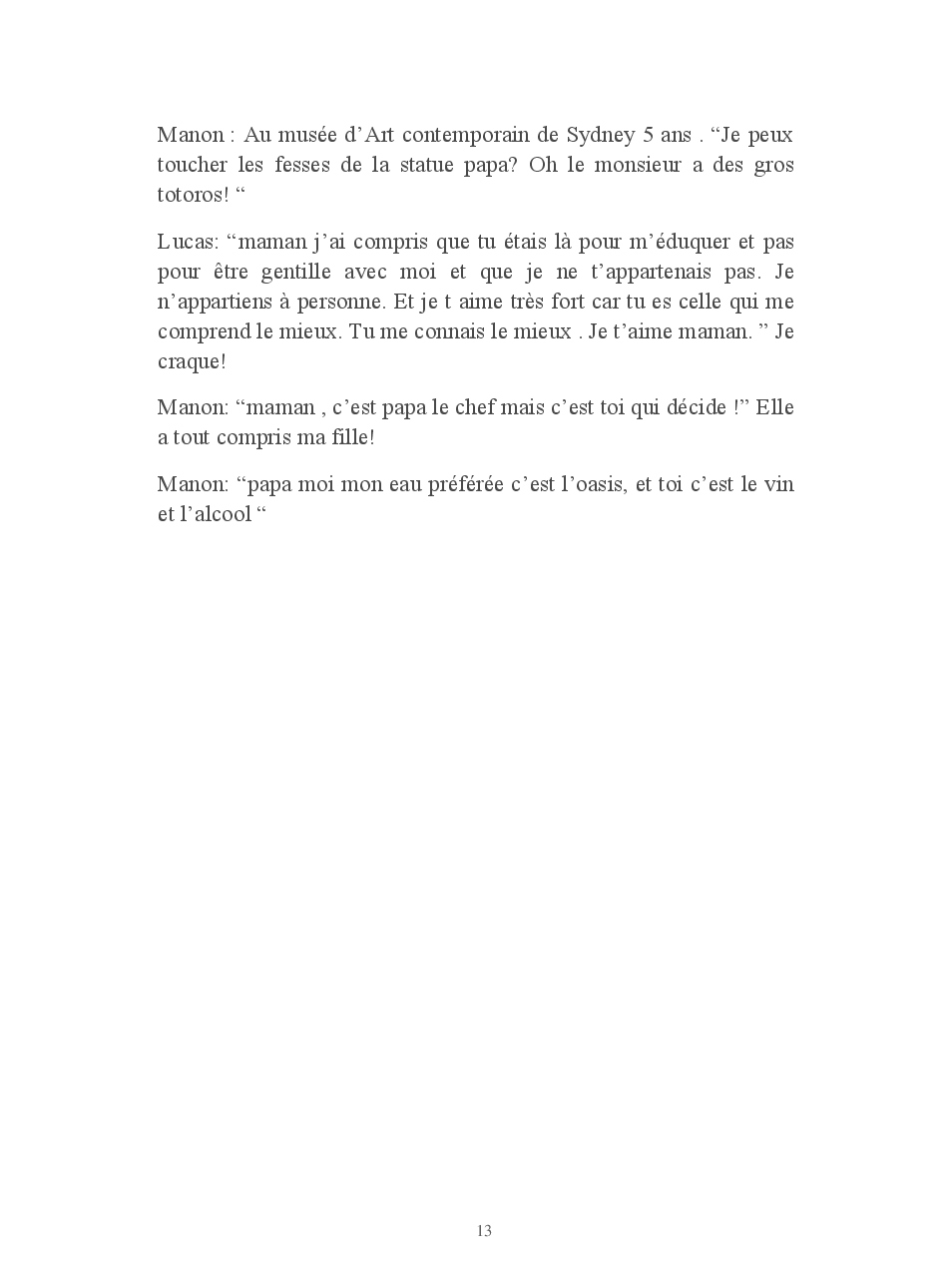 Lucas pose des questions inlassablement. Anodines, existentielles, philosophiques, il veut tout savoir. Il crée pour créer: des mètres qui ne mesurent pas, des tongs en carton, des pinceaux avec ses cheveux... des origamis. Manon sort une vanne avec un aplomb d'enfer puis s'éclate littéralement de rire. Elle aime que les choses soient rangées, précises. Regard intense et sauvage, droit dans les yeux. Pas un mot. Elle ne le montre pas mais Manon c'est une dure au cœur tendre.