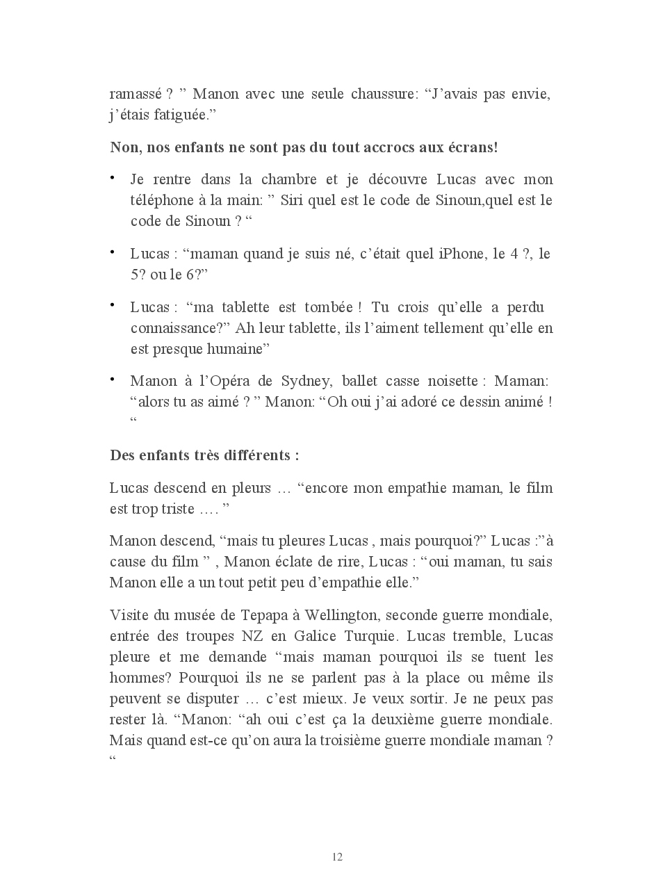 Lucas pose des questions inlassablement. Anodines, existentielles, philosophiques, il veut tout savoir. Il crée pour créer: des mètres qui ne mesurent pas, des tongs en carton, des pinceaux avec ses cheveux... des origamis. Manon sort une vanne avec un aplomb d'enfer puis s'éclate littéralement de rire. Elle aime que les choses soient rangées, précises. Regard intense et sauvage, droit dans les yeux. Pas un mot. Elle ne le montre pas mais Manon c'est une dure au cœur tendre.