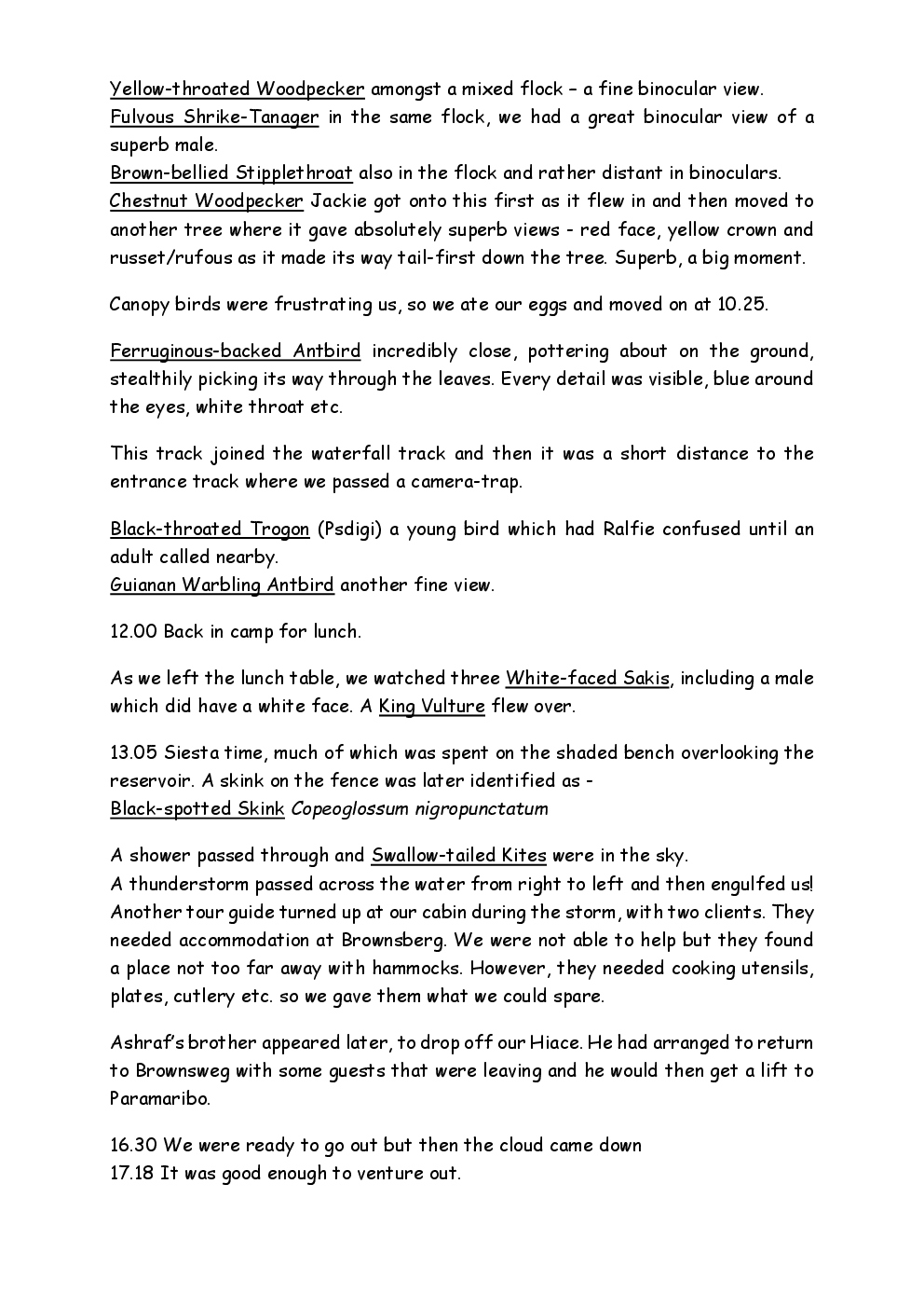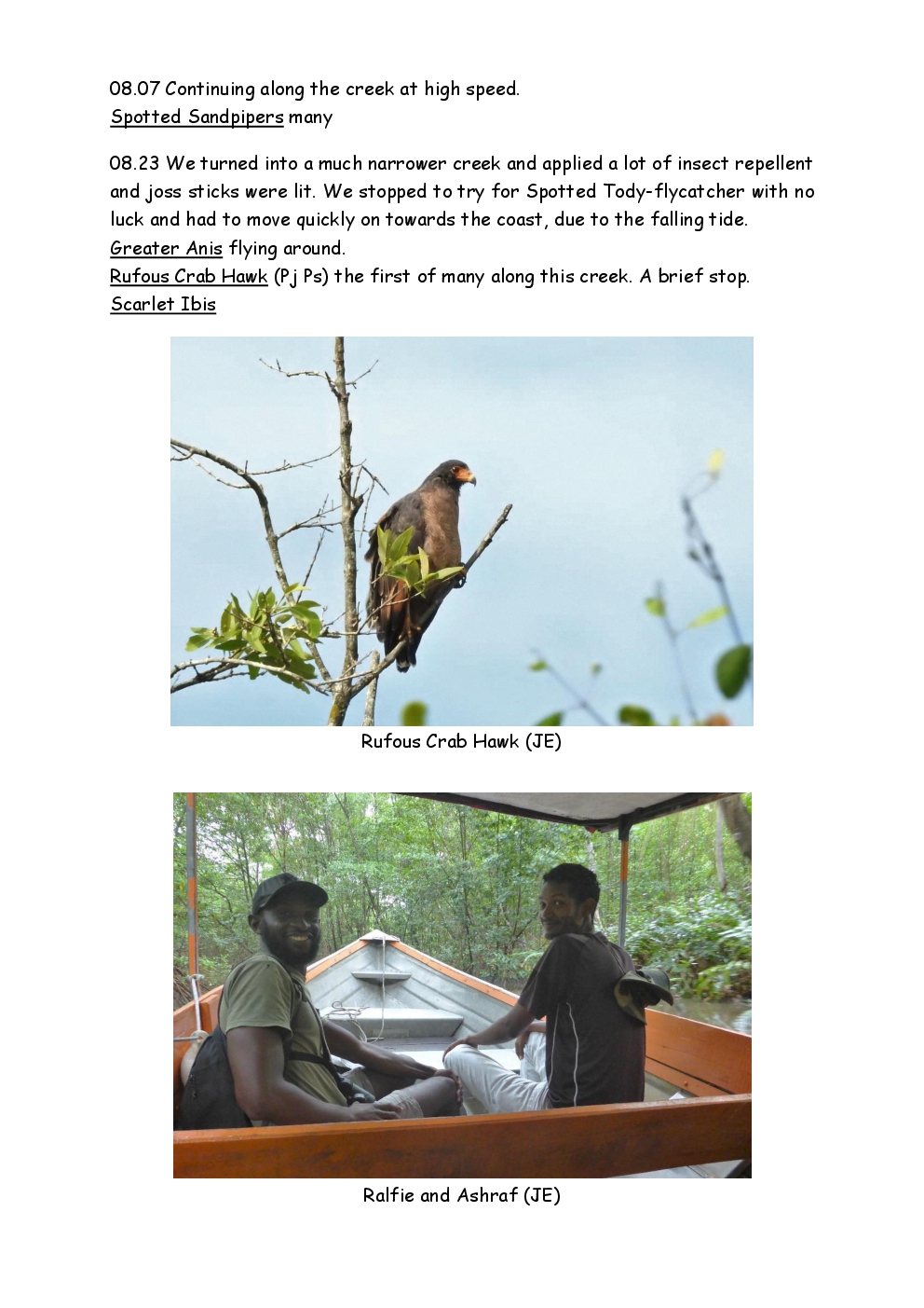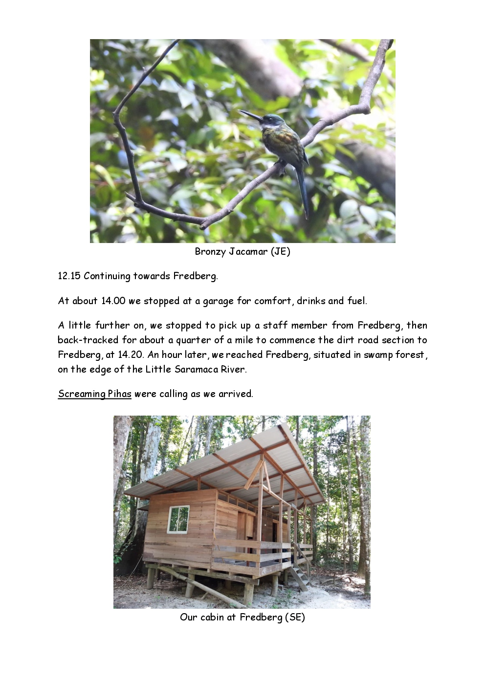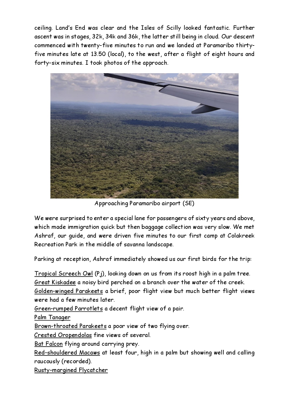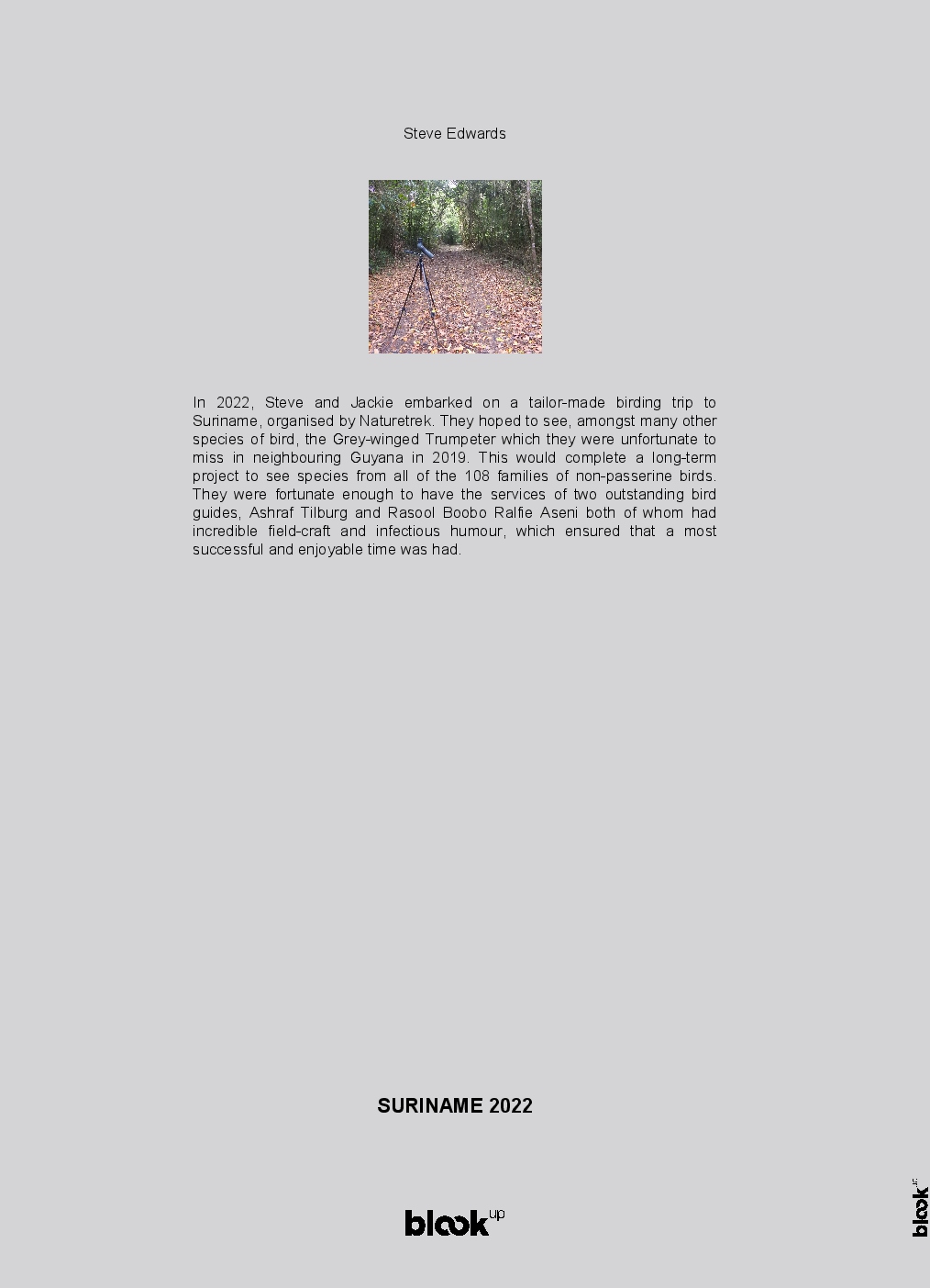 In 2022, Steve and Jackie embarked on a tailor-made birding trip to Suriname, organised by Naturetrek. They hoped to see, amongst many other species of bird, the Grey-winged Trumpeter which they were unfortunate to miss in neighbouring Guyana in 2019. This would complete a long-term project to see species from all of the 108 families of non-passerine birds. They were fortunate enough to have the services of two outstanding bird guides, Ashraf Tilburg and Rasool Boobo Ralfie Aseni both of whom had incredible field-craft and infectious humour, which ensured that a most successful and enjoyable time was had.