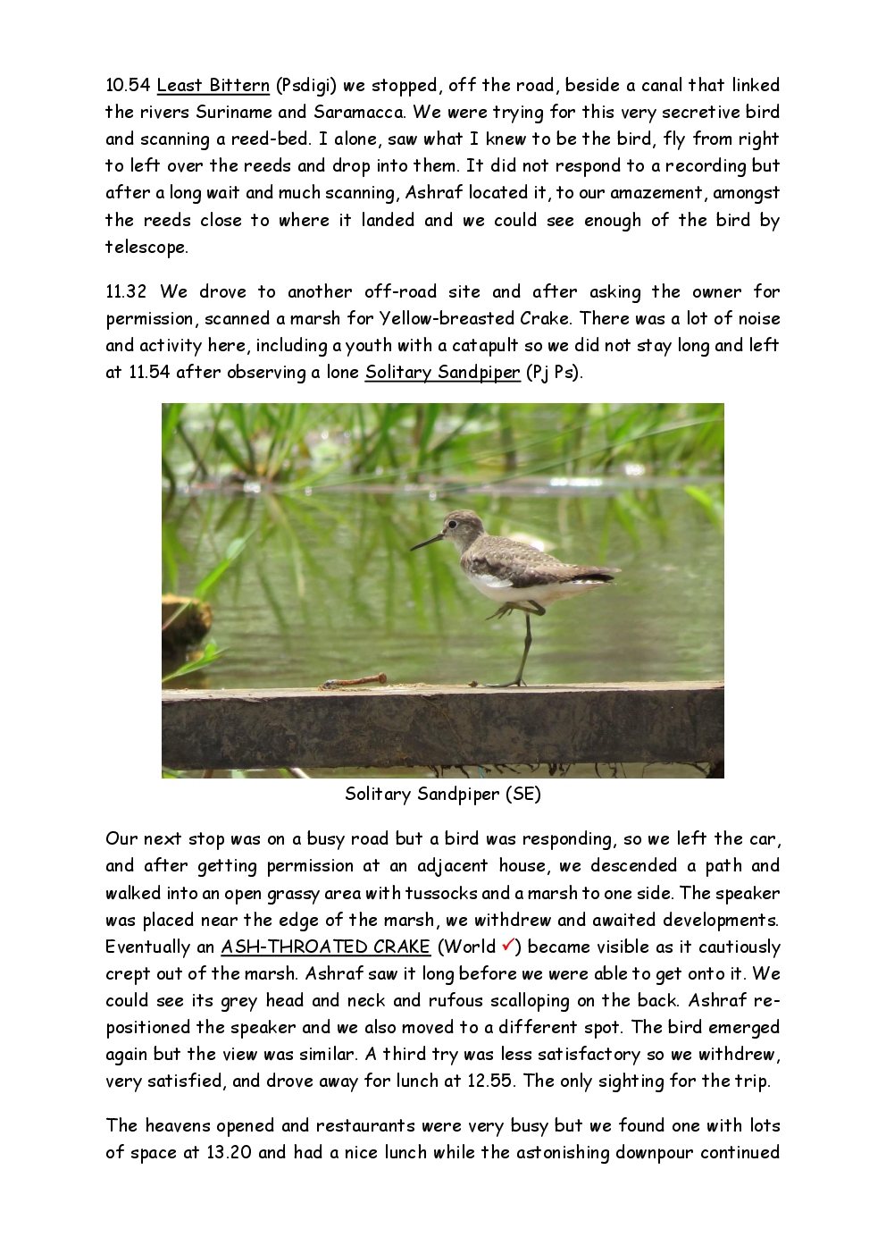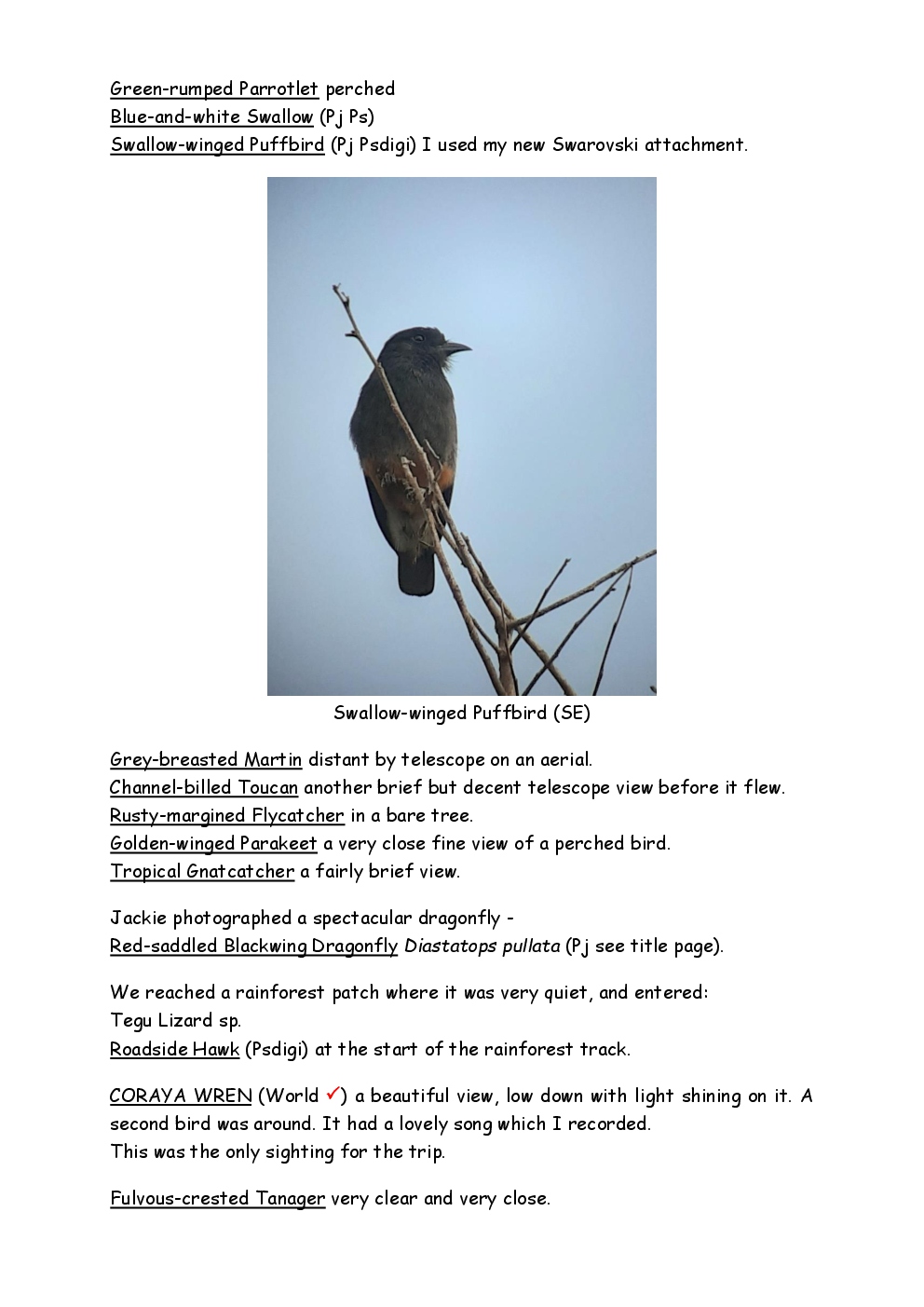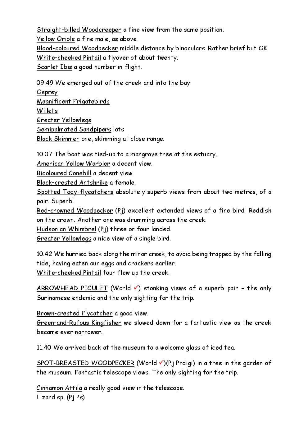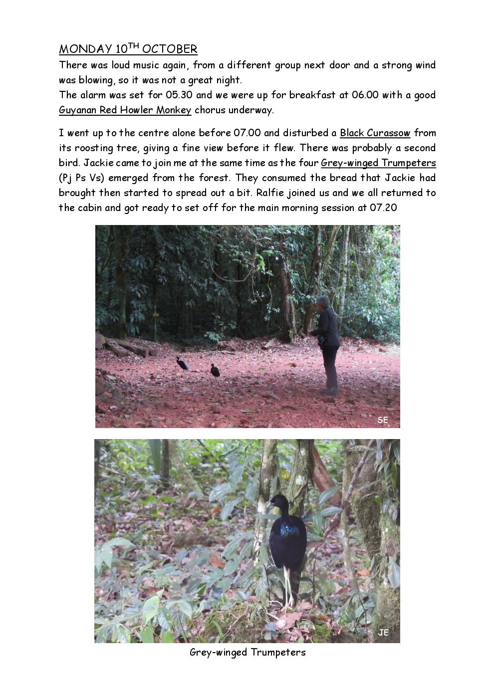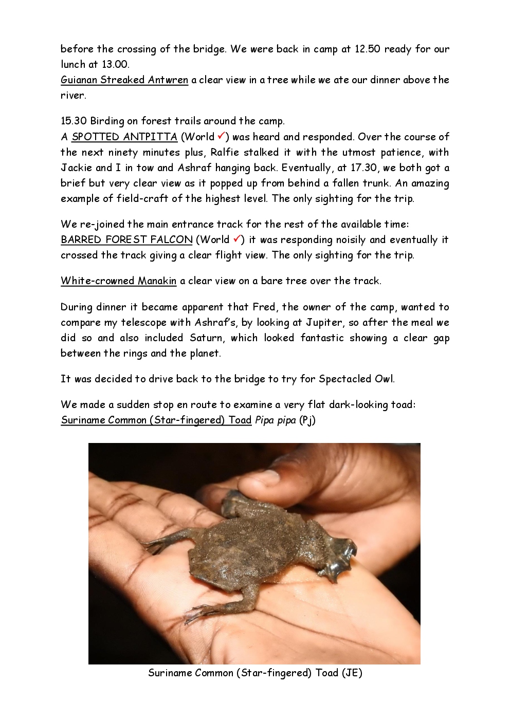 In 2022, Steve and Jackie embarked on a tailor-made birding trip to Suriname, organised by Naturetrek. They hoped to see, amongst many other species of bird, the Grey-winged Trumpeter which they were unfortunate to miss in neighbouring Guyana in 2019. This would complete a long-term project to see species from all of the 108 families of non-passerine birds. They were fortunate enough to have the services of two outstanding bird guides, Ashraf Tilburg and Rasool Boobo Ralfie Aseni both of whom had incredible field-craft and infectious humour, which ensured that a most successful and enjoyable time was had.