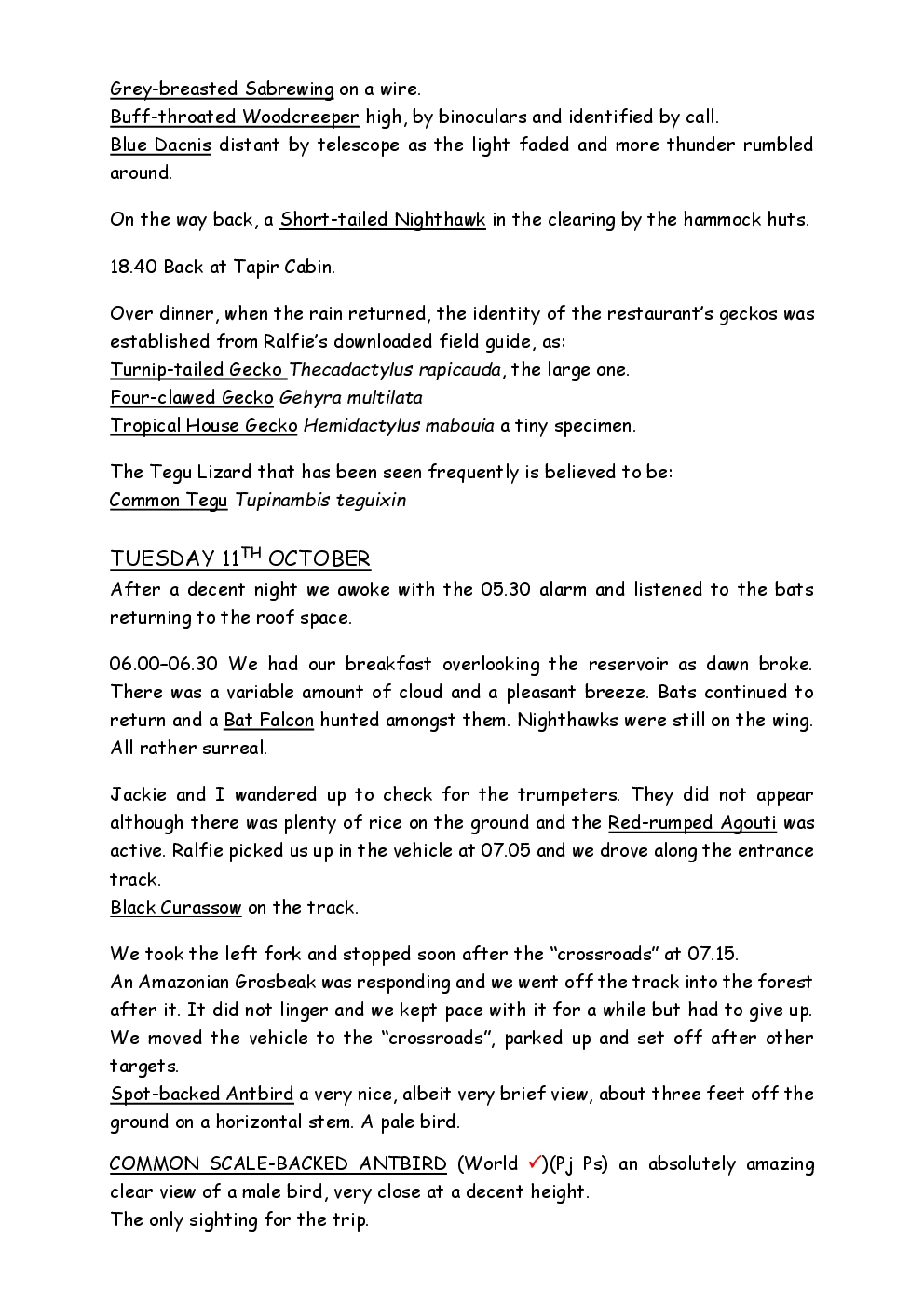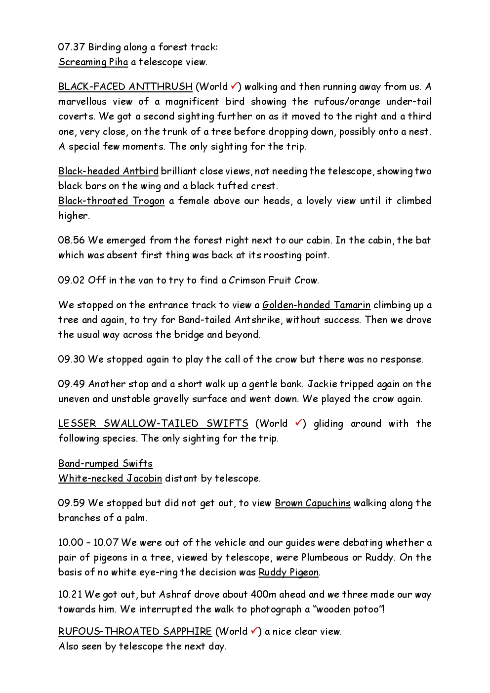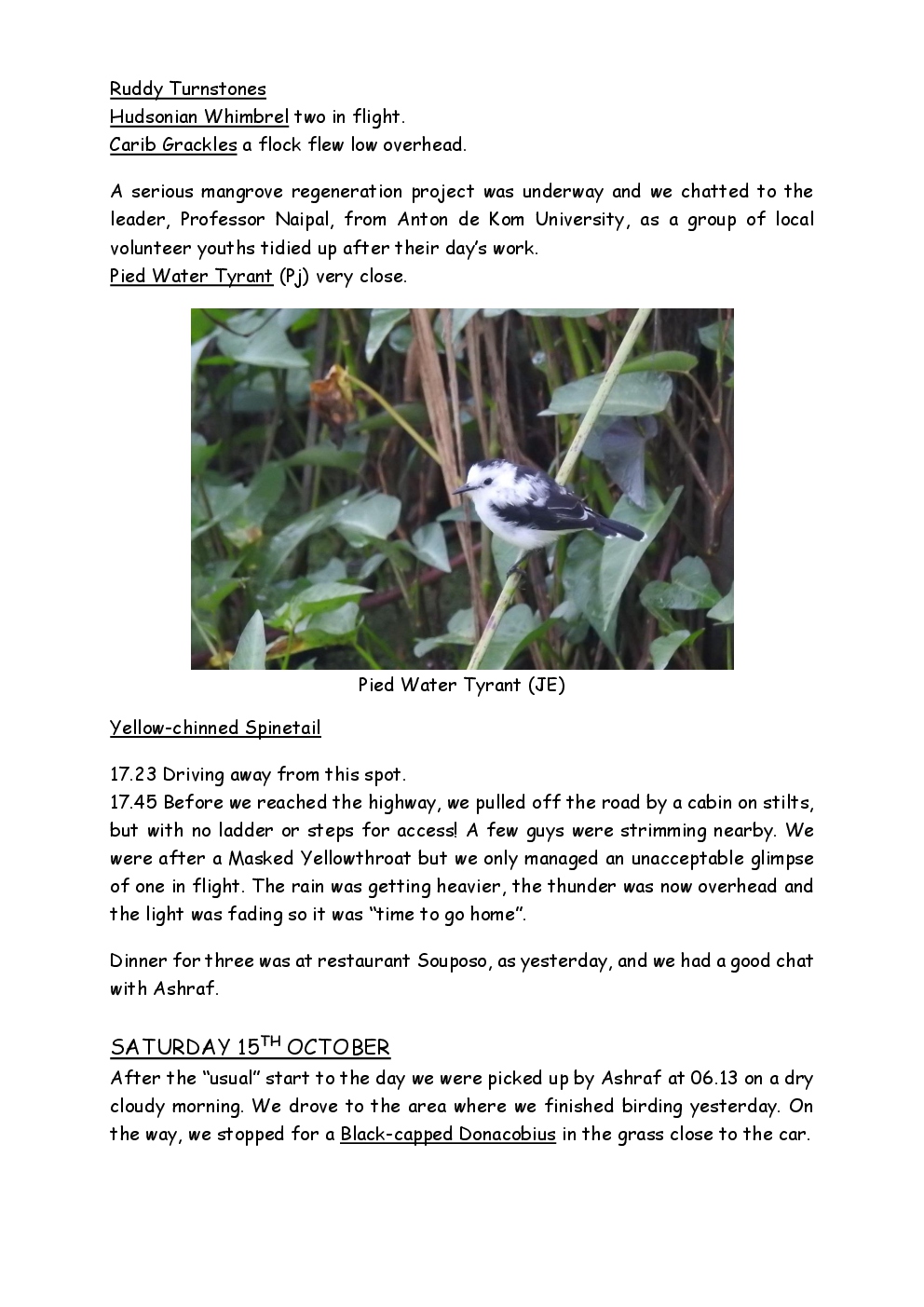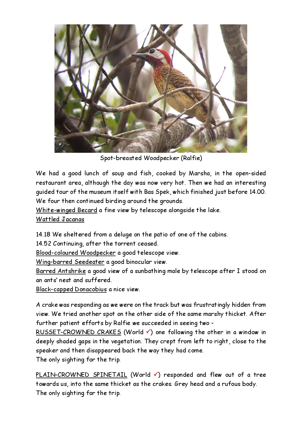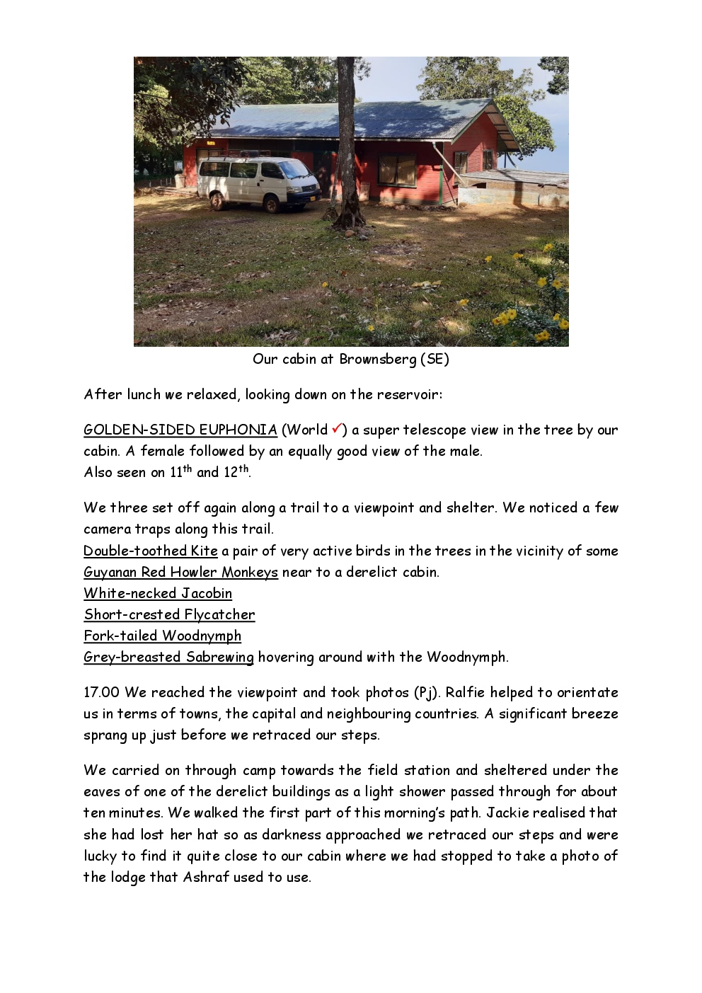 In 2022, Steve and Jackie embarked on a tailor-made birding trip to Suriname, organised by Naturetrek. They hoped to see, amongst many other species of bird, the Grey-winged Trumpeter which they were unfortunate to miss in neighbouring Guyana in 2019. This would complete a long-term project to see species from all of the 108 families of non-passerine birds. They were fortunate enough to have the services of two outstanding bird guides, Ashraf Tilburg and Rasool Boobo Ralfie Aseni both of whom had incredible field-craft and infectious humour, which ensured that a most successful and enjoyable time was had.