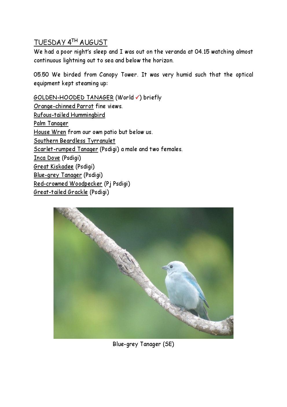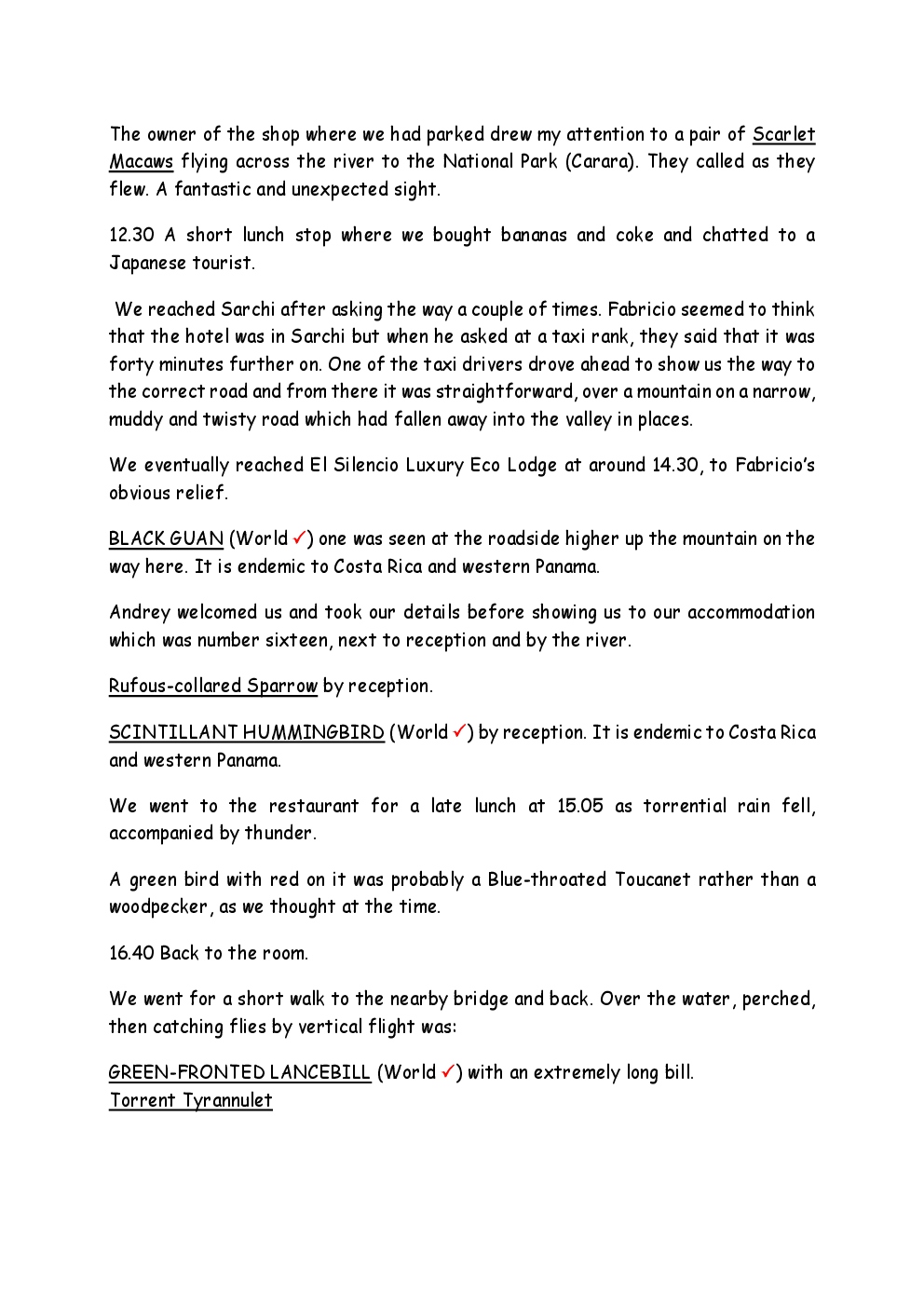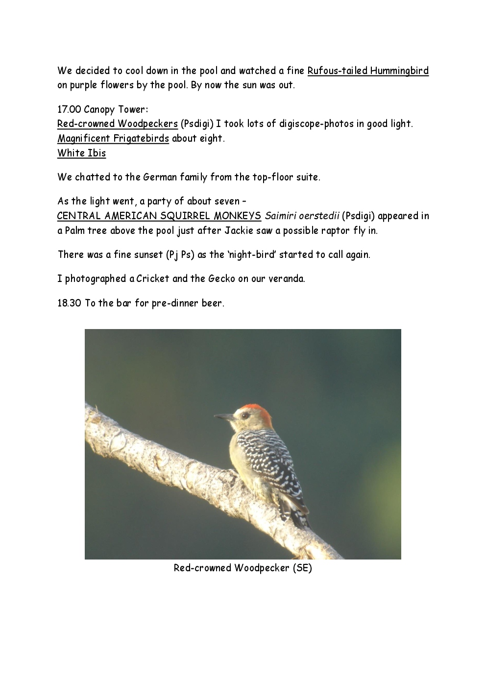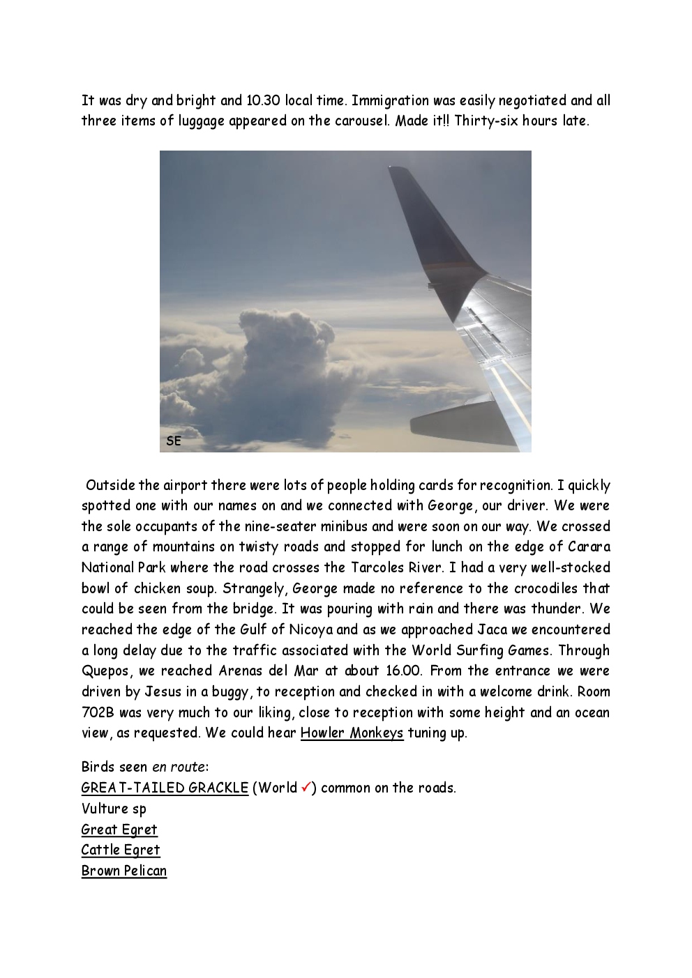 In 2009, Steve and Jackie visited Central America for the first time, with a trip to Costa Rica. They were delayed by thirty six hours on the outward journey due to bad weather in New York, so they missed their first night's accommodation in the capital, San Jose. They had a two-centre holiday, firstly on the Pacific coast close to Manuel Antonio National Park and then at an ecolodge in a 500-acre private cloud-forest reserve in the mountains.