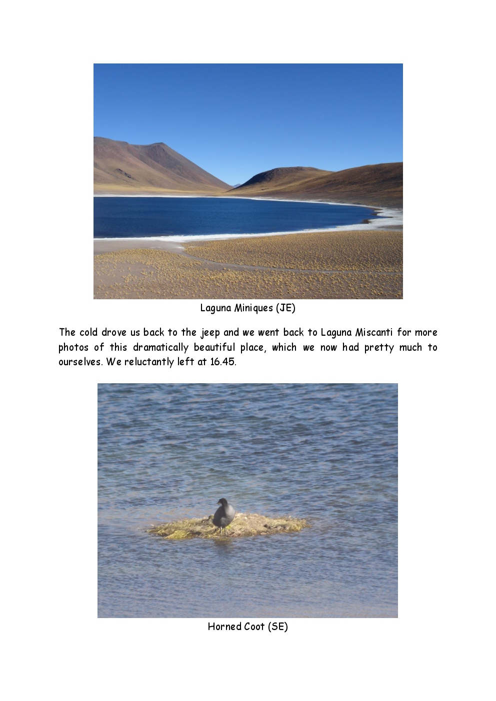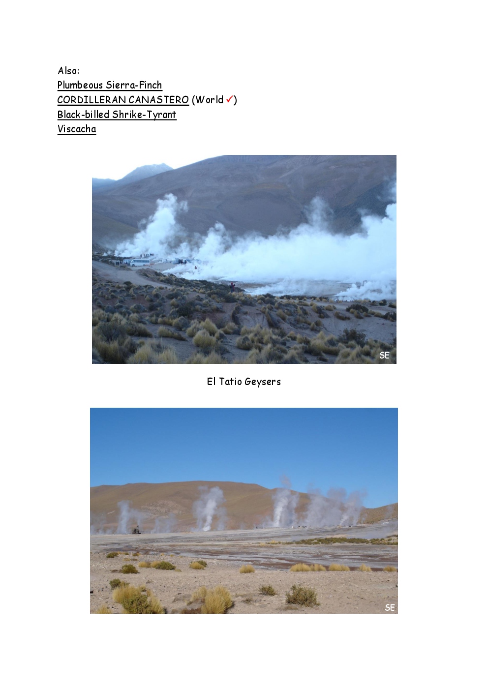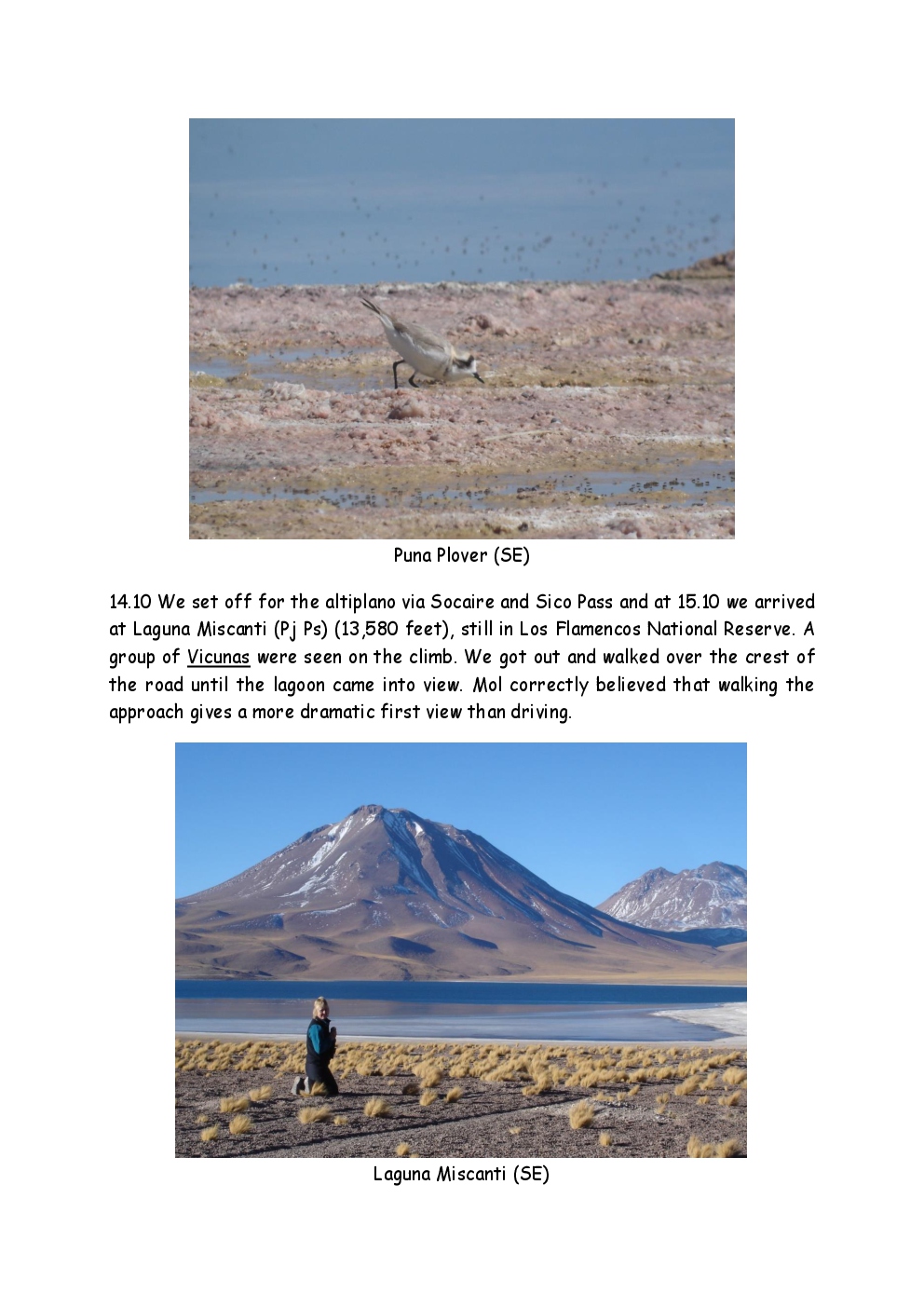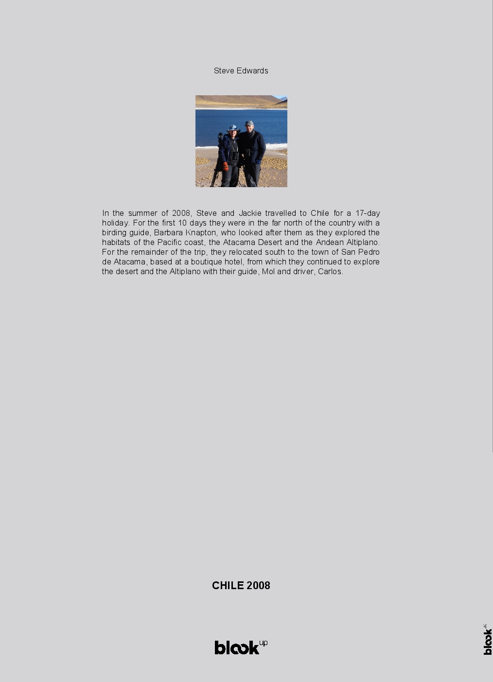 In the summer of 2008, Steve and Jackie travelled to Chile for a 17-day holiday. For the first 10 days they were in the far north of the country with a birding guide, Barbara Knapton, who looked after them as they explored the habitats of the Pacific coast, the Atacama Desert and the Andean Altiplano. For the remainder of the trip, they relocated south to the town of San Pedro de Atacama, based at a boutique hotel, from which they continued to explore the desert and the Altiplano with their guide, Mol and driver, Carlos.