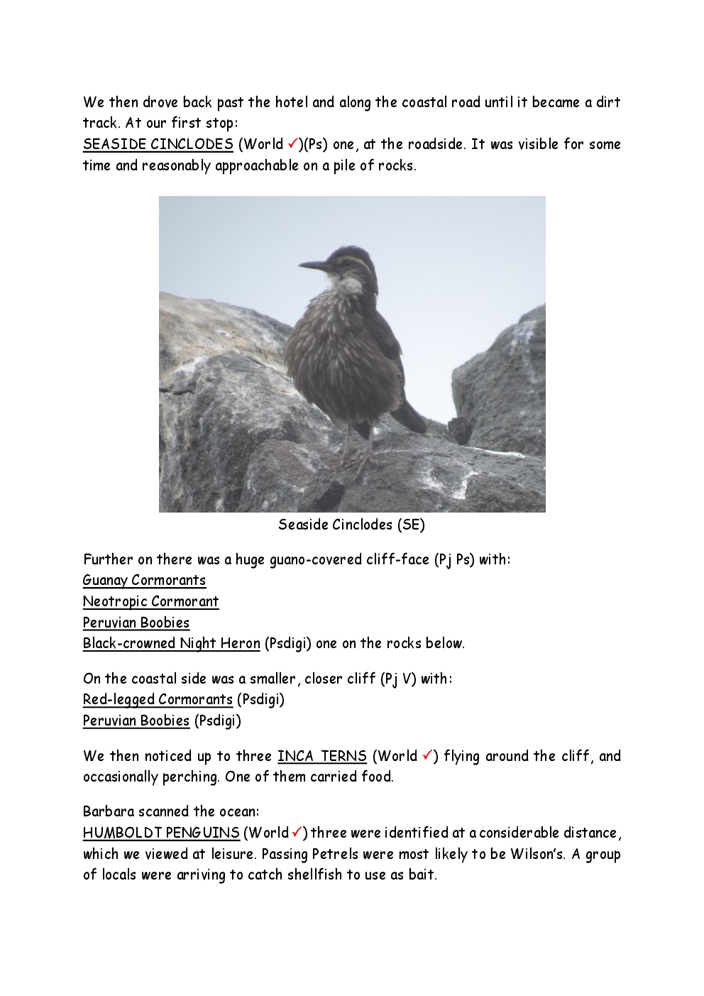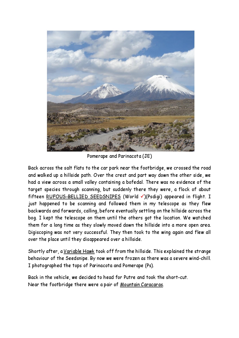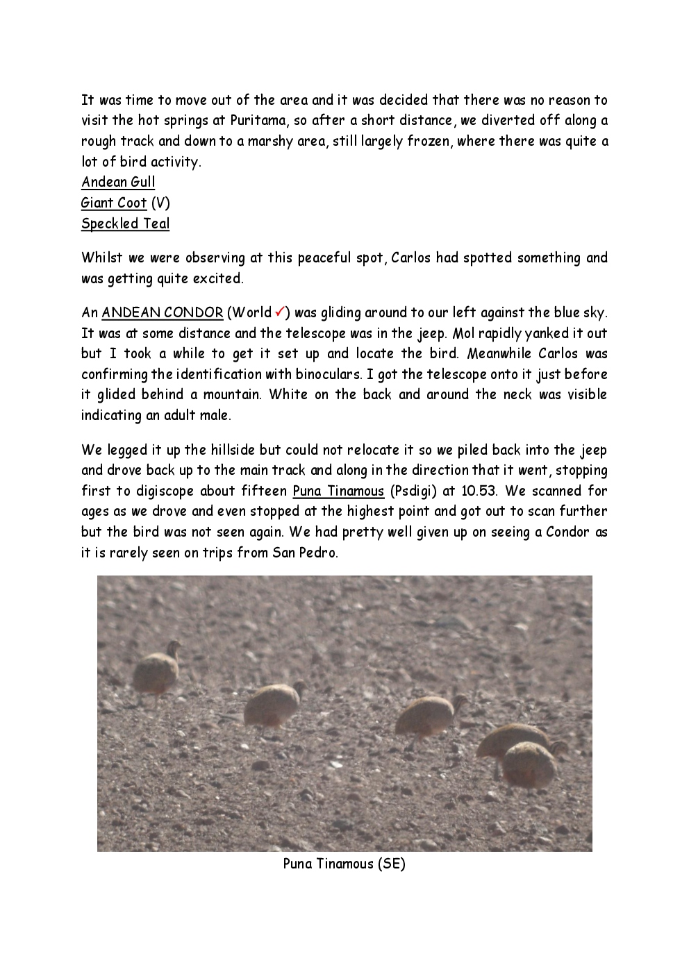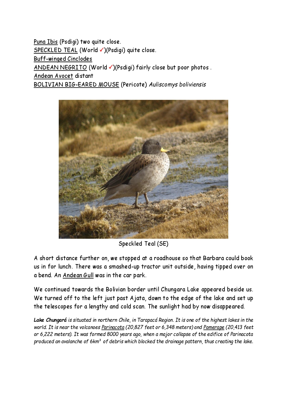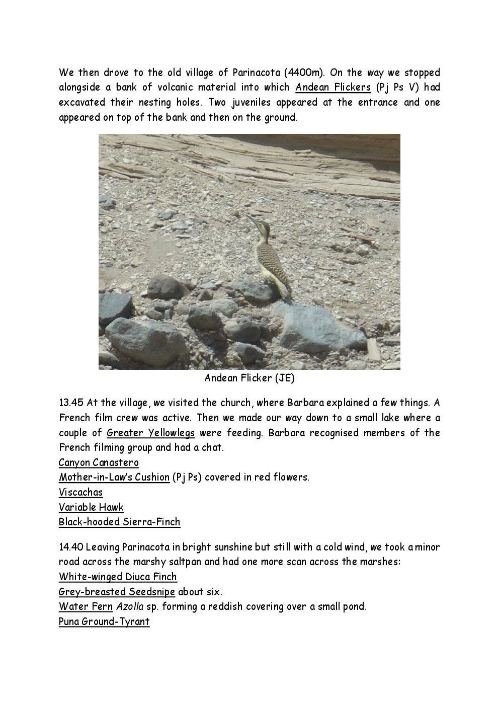 In the summer of 2008, Steve and Jackie travelled to Chile for a 17-day holiday. For the first 10 days they were in the far north of the country with a birding guide, Barbara Knapton, who looked after them as they explored the habitats of the Pacific coast, the Atacama Desert and the Andean Altiplano. For the remainder of the trip, they relocated south to the town of San Pedro de Atacama, based at a boutique hotel, from which they continued to explore the desert and the Altiplano with their guide, Mol and driver, Carlos.