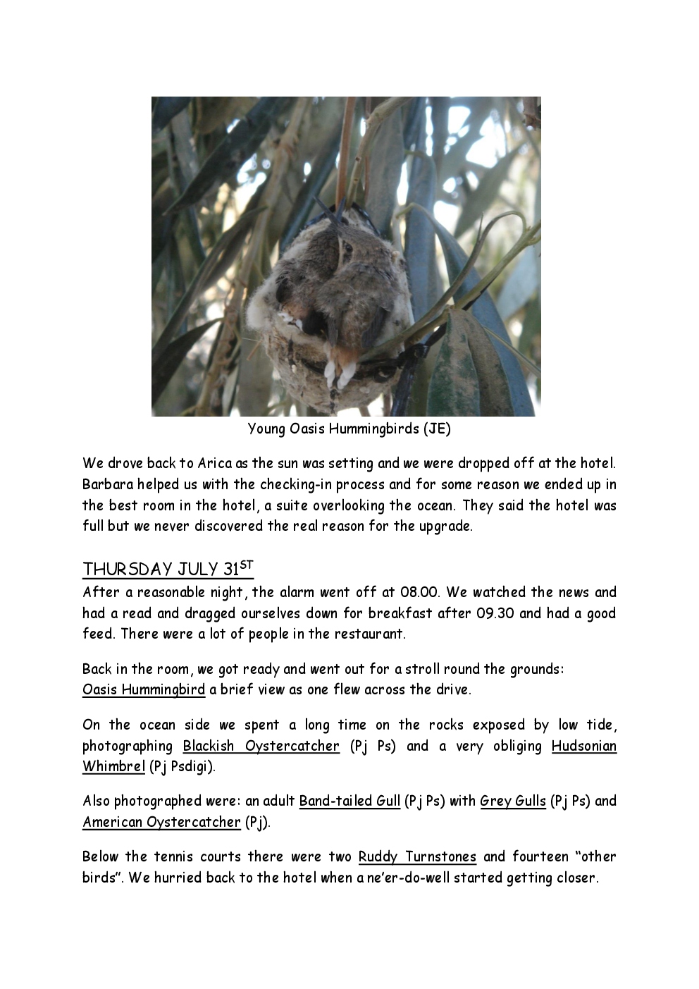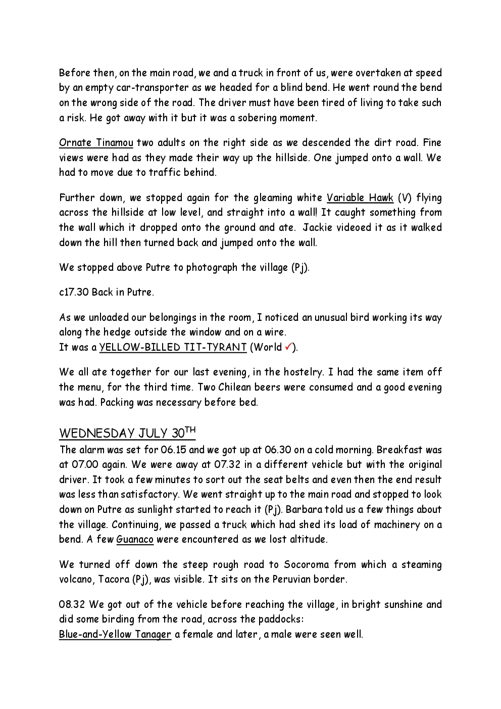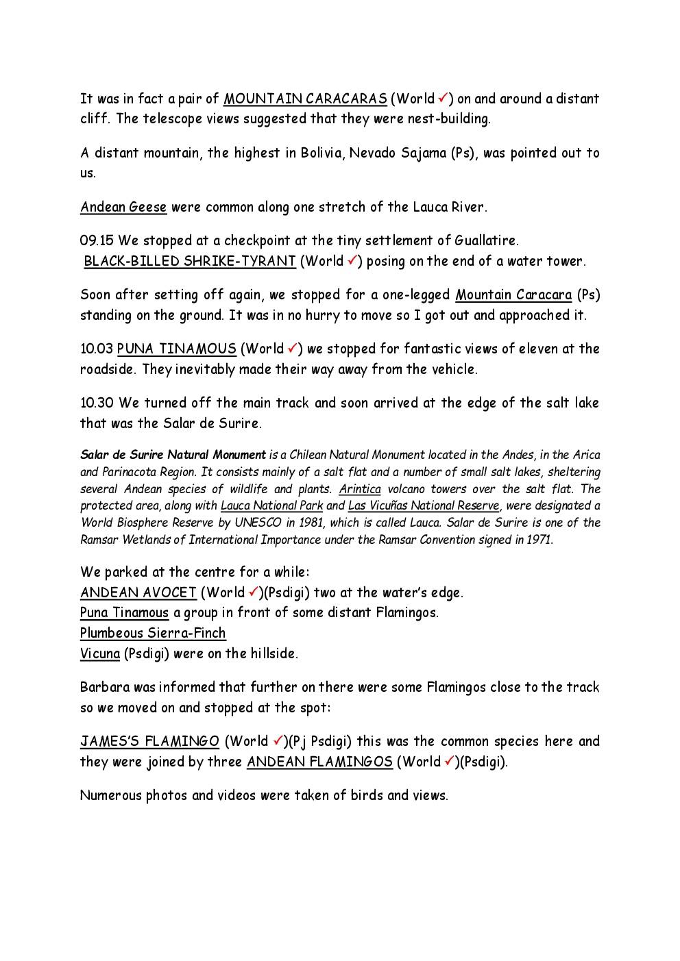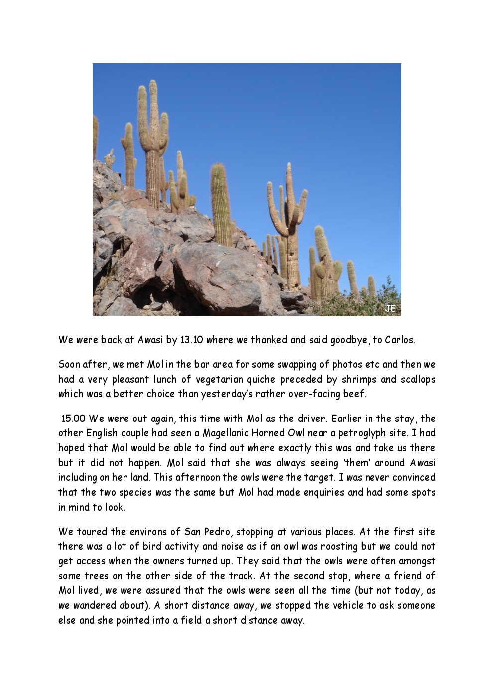 In the summer of 2008, Steve and Jackie travelled to Chile for a 17-day holiday. For the first 10 days they were in the far north of the country with a birding guide, Barbara Knapton, who looked after them as they explored the habitats of the Pacific coast, the Atacama Desert and the Andean Altiplano. For the remainder of the trip, they relocated south to the town of San Pedro de Atacama, based at a boutique hotel, from which they continued to explore the desert and the Altiplano with their guide, Mol and driver, Carlos.