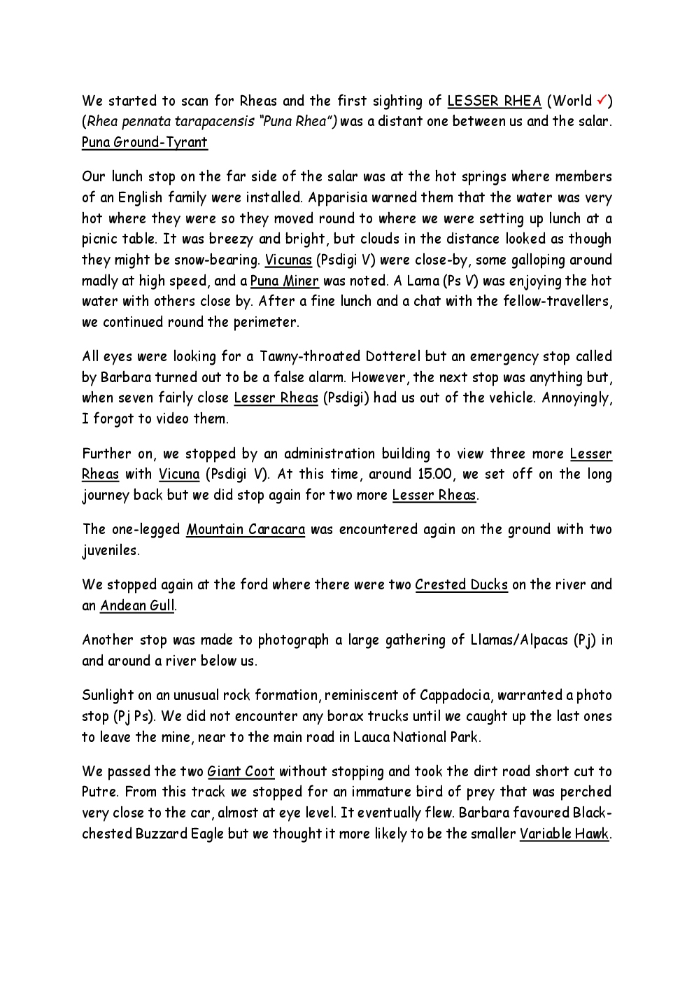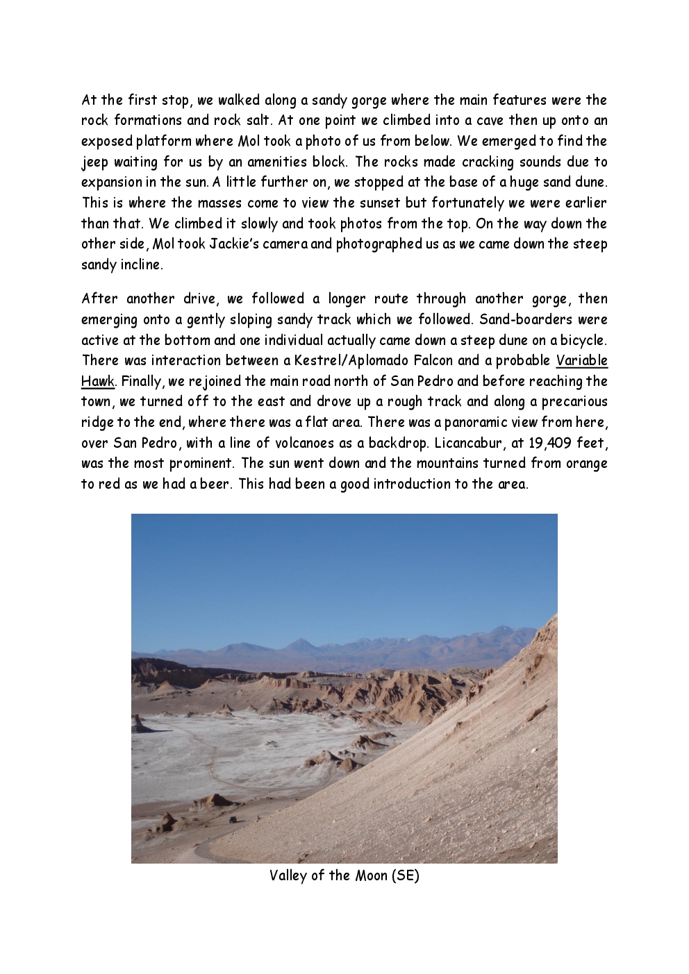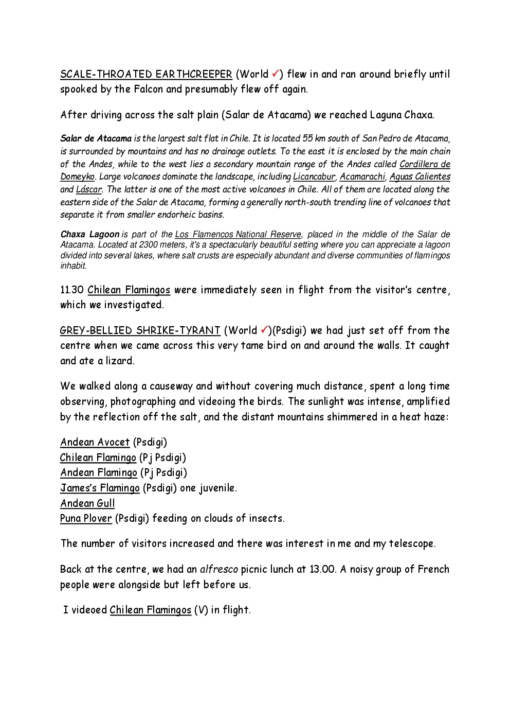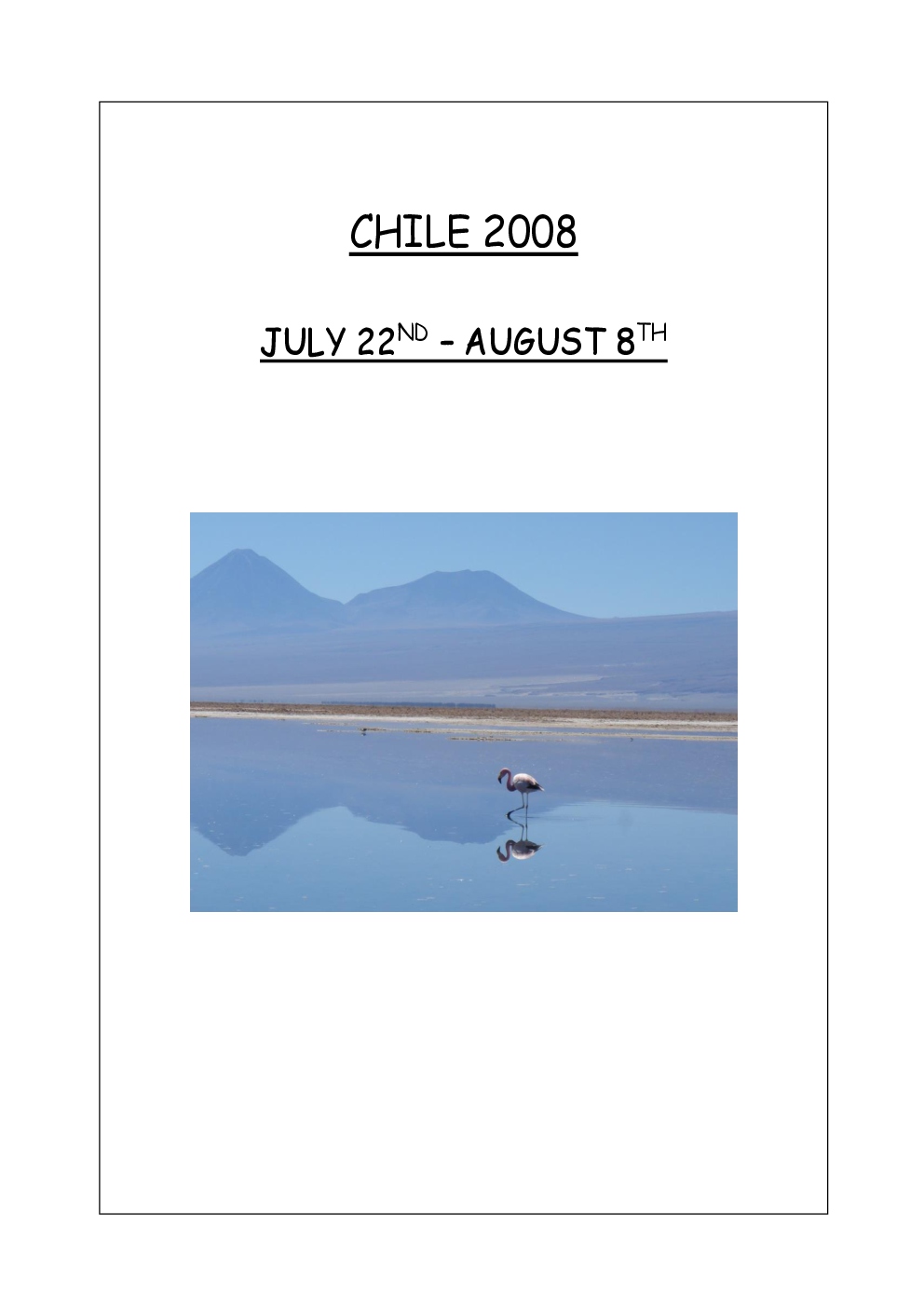 In the summer of 2008, Steve and Jackie travelled to Chile for a 17-day holiday. For the first 10 days they were in the far north of the country with a birding guide, Barbara Knapton, who looked after them as they explored the habitats of the Pacific coast, the Atacama Desert and the Andean Altiplano. For the remainder of the trip, they relocated south to the town of San Pedro de Atacama, based at a boutique hotel, from which they continued to explore the desert and the Altiplano with their guide, Mol and driver, Carlos.