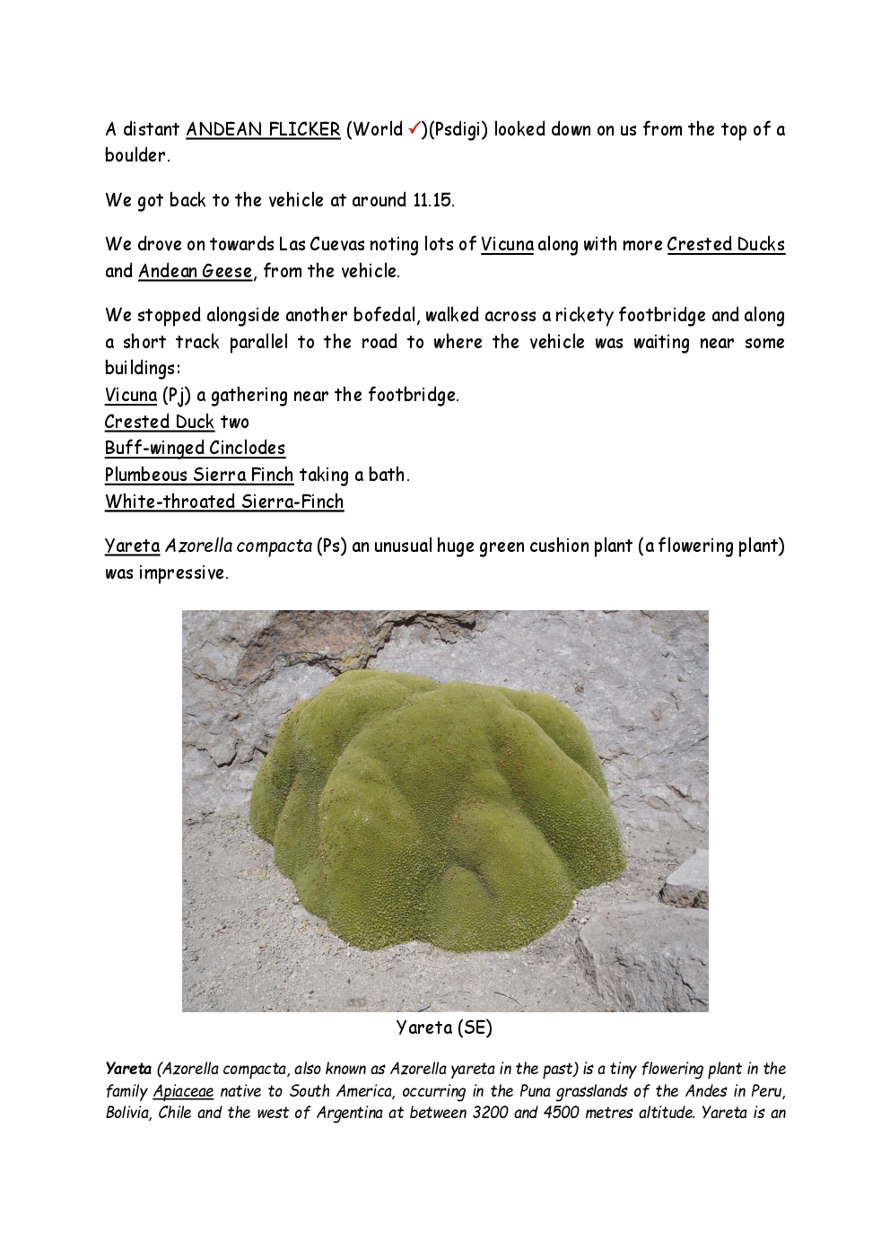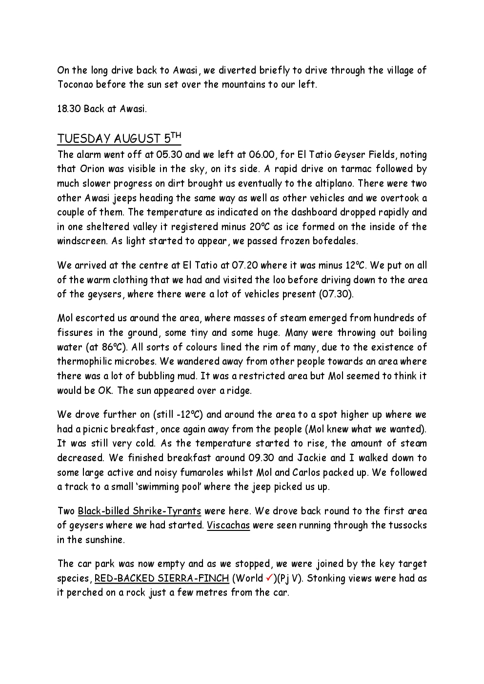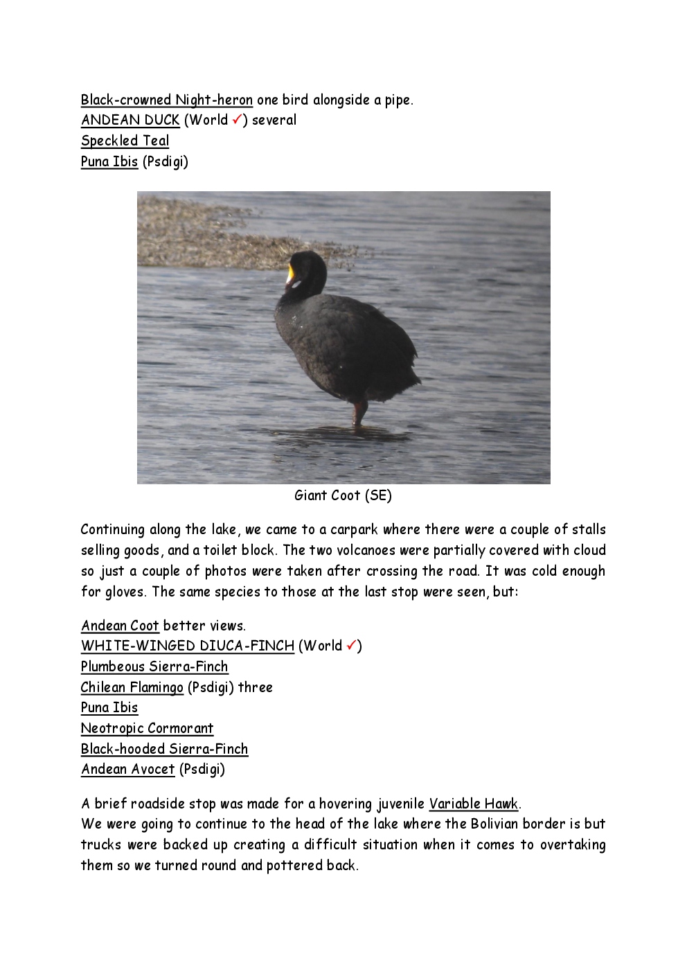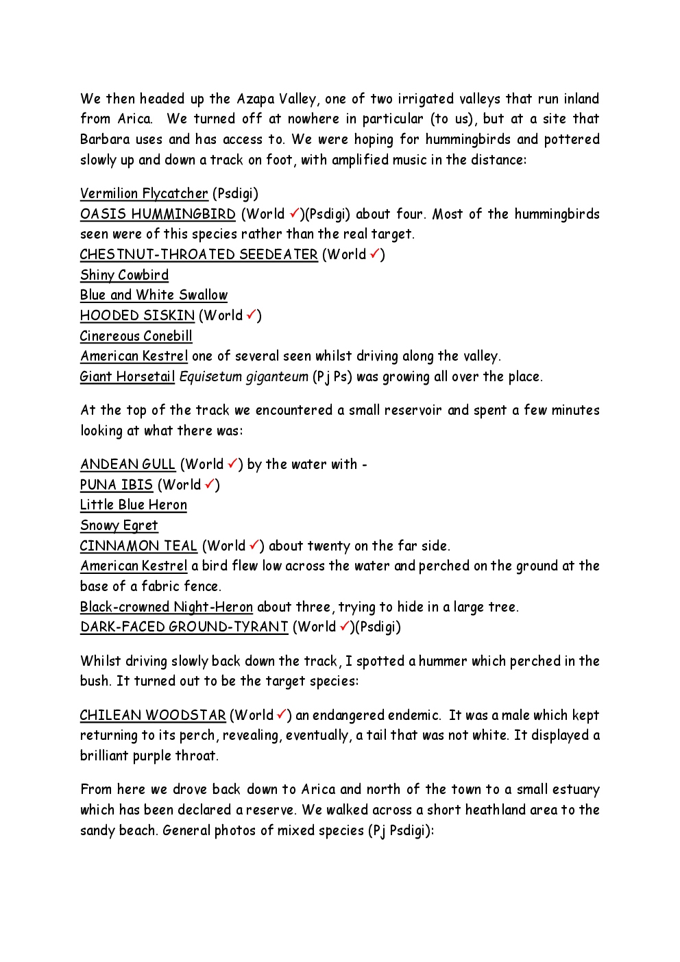 In the summer of 2008, Steve and Jackie travelled to Chile for a 17-day holiday. For the first 10 days they were in the far north of the country with a birding guide, Barbara Knapton, who looked after them as they explored the habitats of the Pacific coast, the Atacama Desert and the Andean Altiplano. For the remainder of the trip, they relocated south to the town of San Pedro de Atacama, based at a boutique hotel, from which they continued to explore the desert and the Altiplano with their guide, Mol and driver, Carlos.
