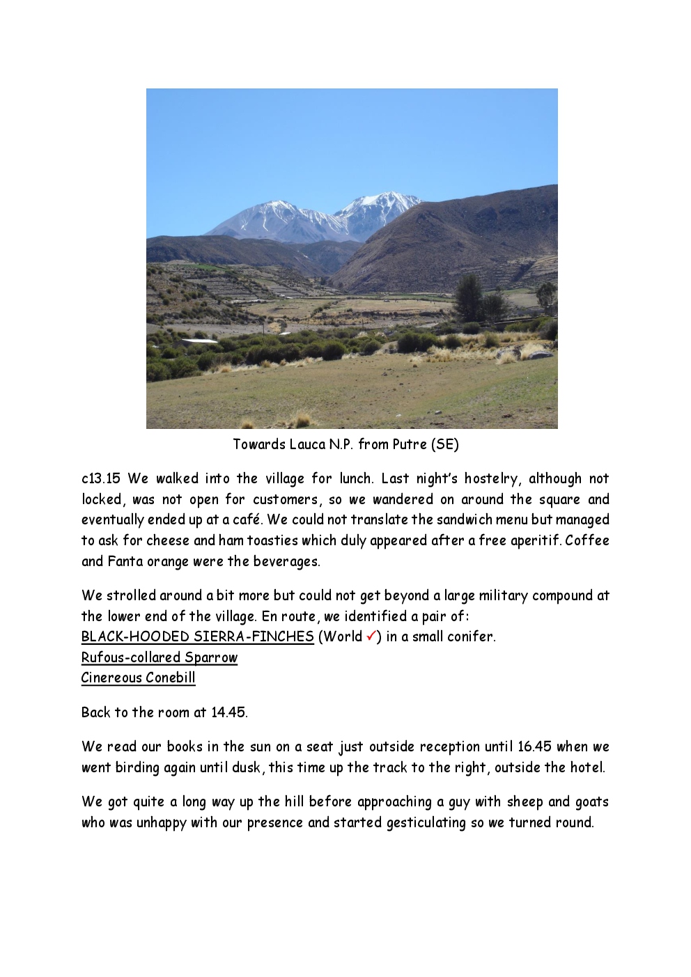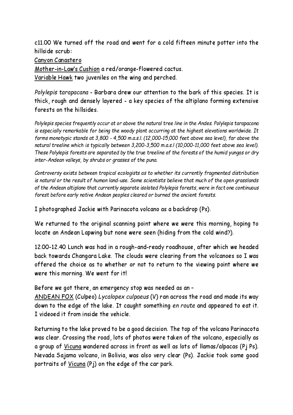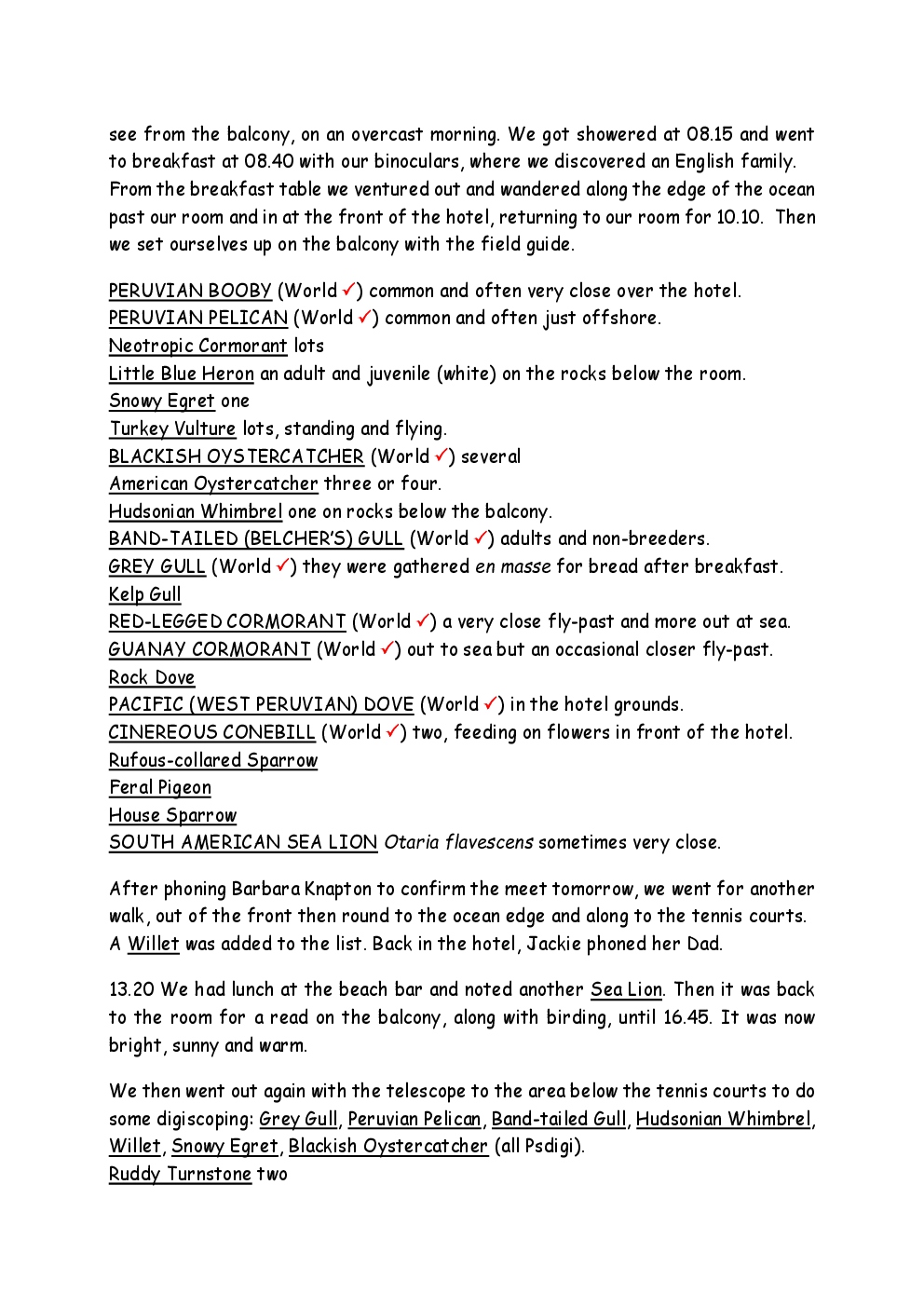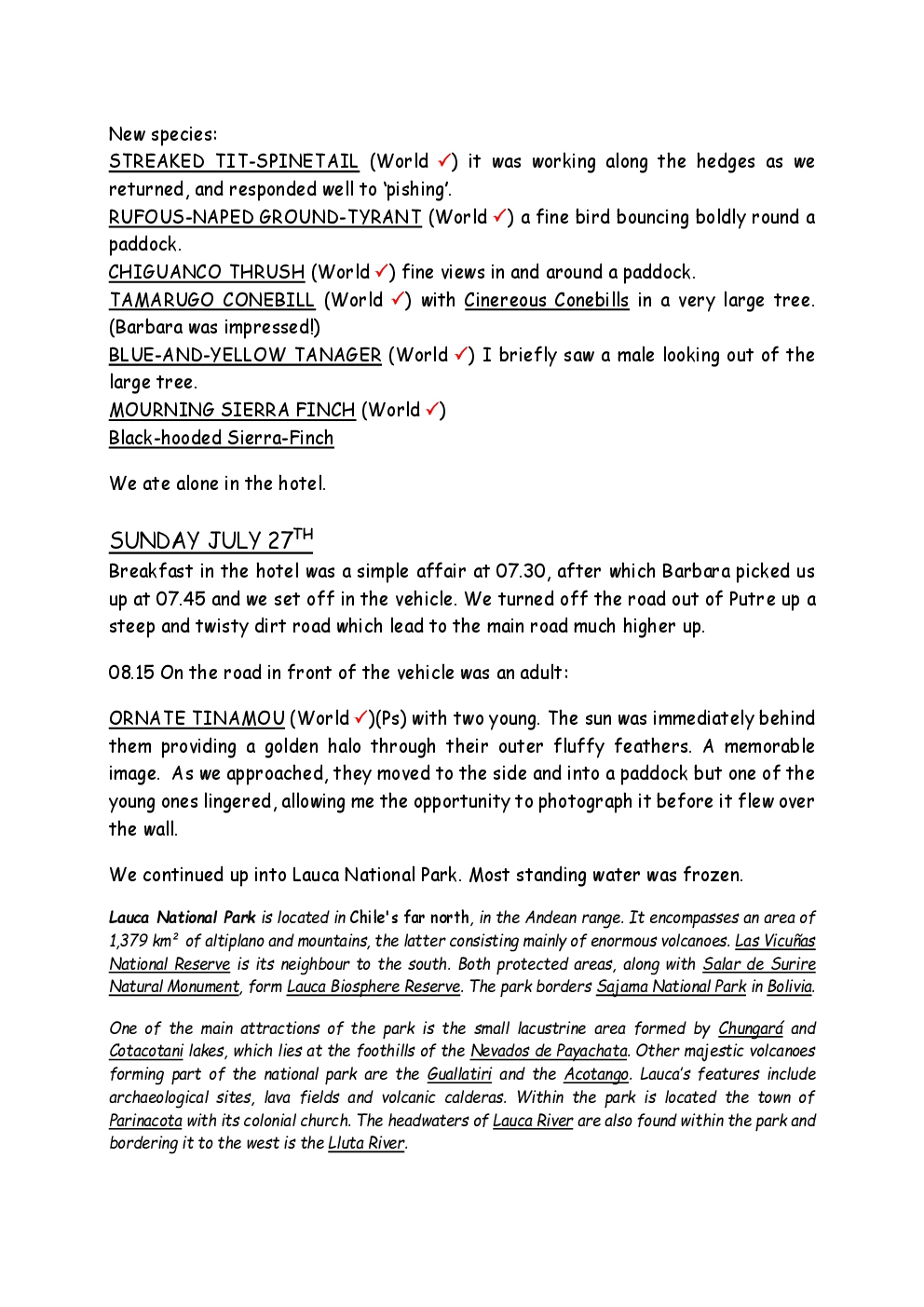 In the summer of 2008, Steve and Jackie travelled to Chile for a 17-day holiday. For the first 10 days they were in the far north of the country with a birding guide, Barbara Knapton, who looked after them as they explored the habitats of the Pacific coast, the Atacama Desert and the Andean Altiplano. For the remainder of the trip, they relocated south to the town of San Pedro de Atacama, based at a boutique hotel, from which they continued to explore the desert and the Altiplano with their guide, Mol and driver, Carlos.