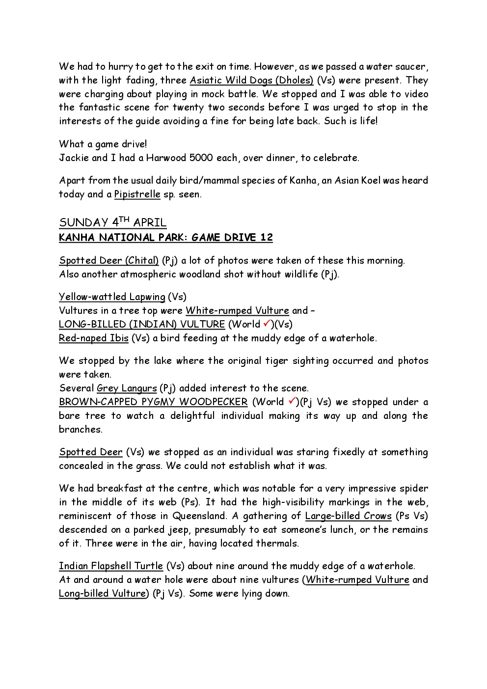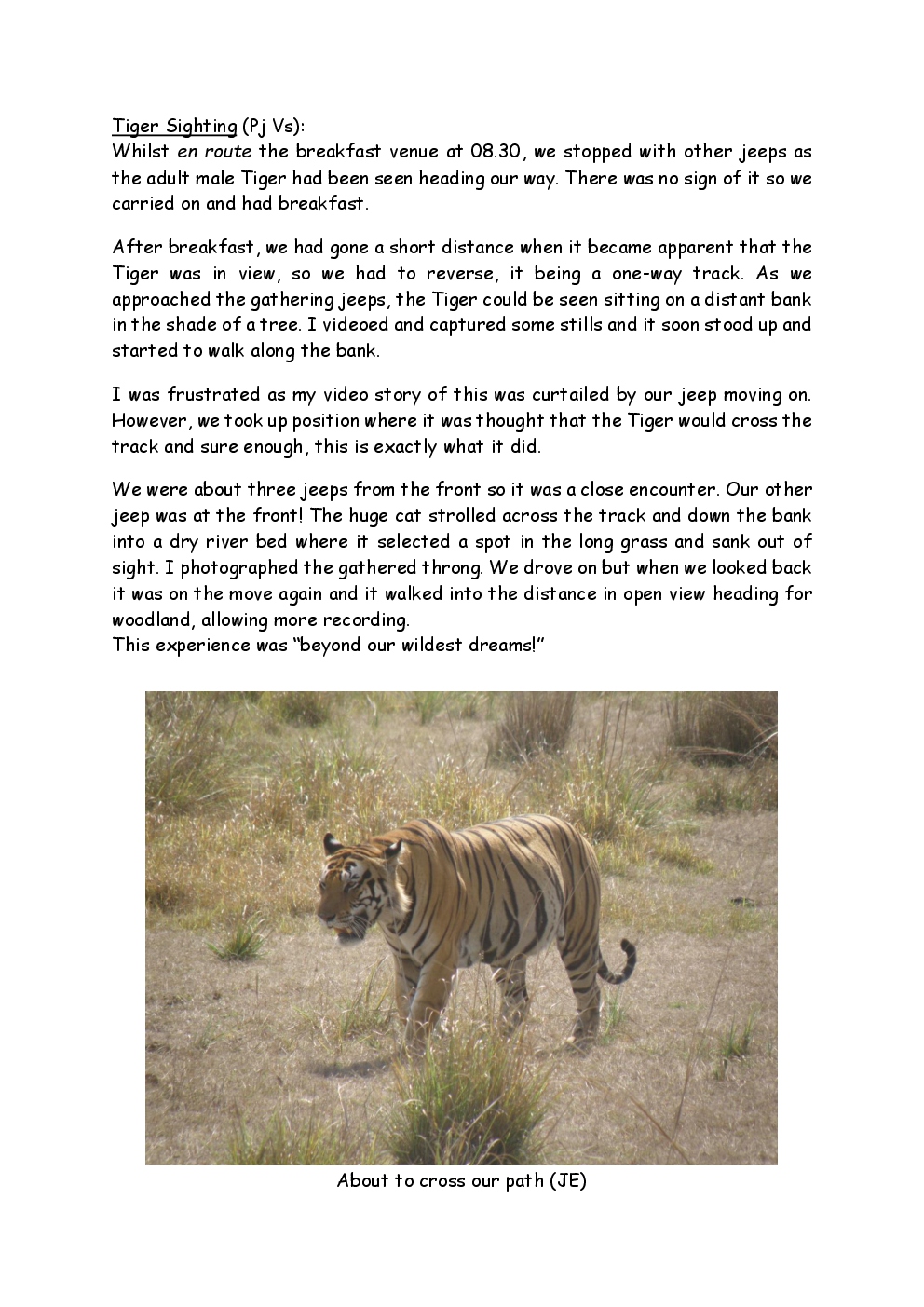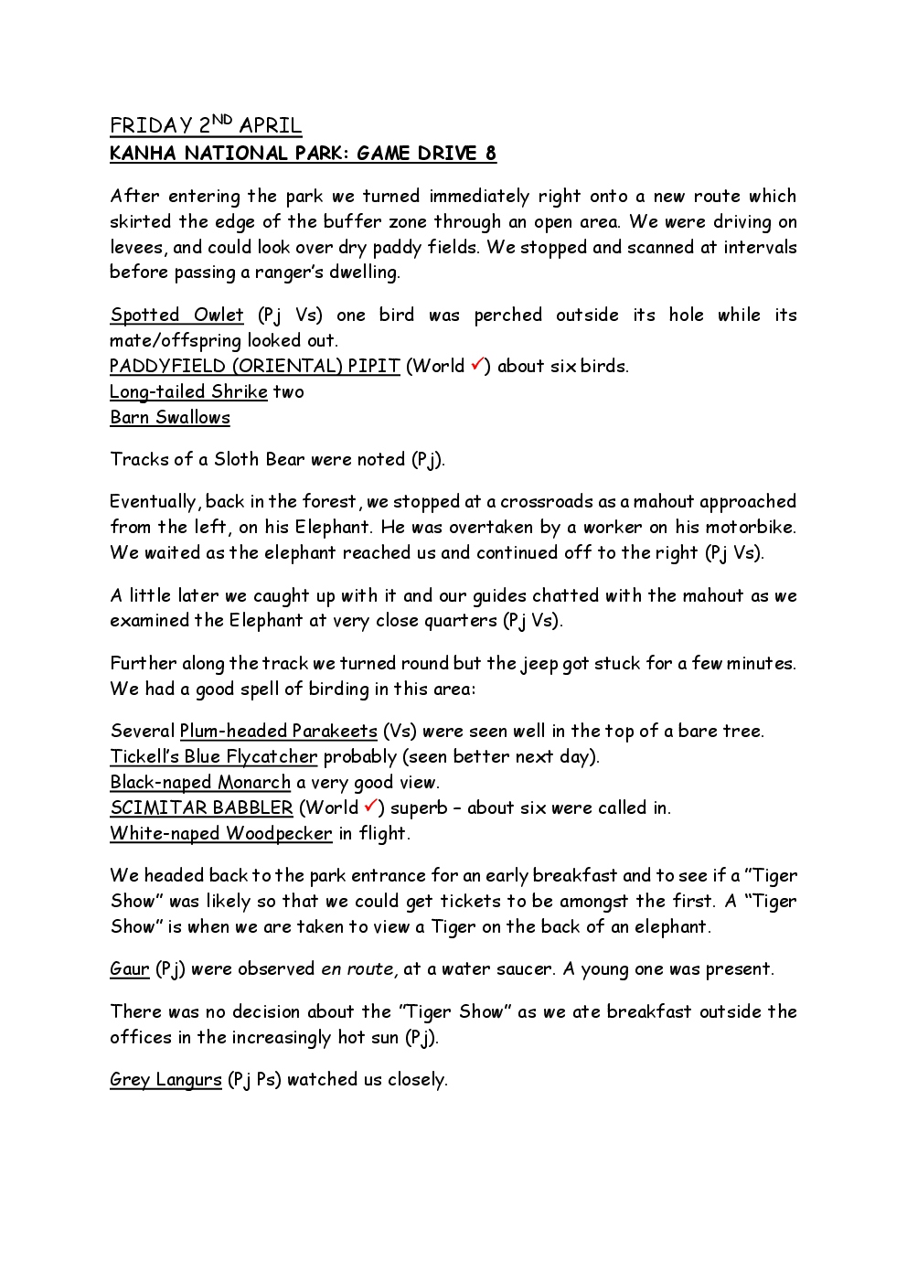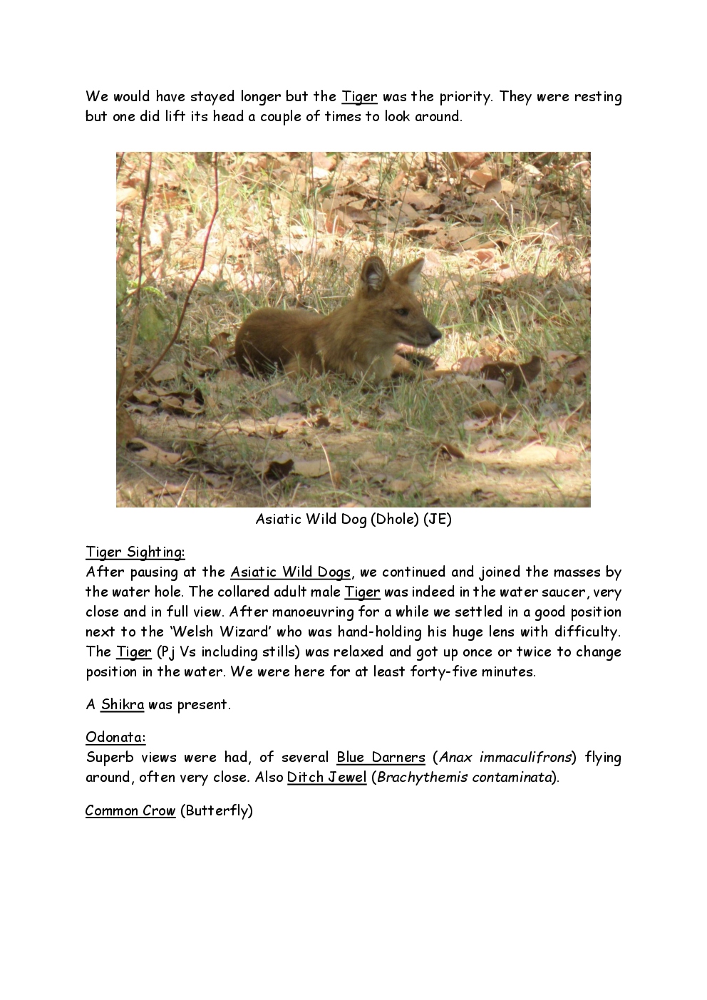 In 2010, Steve and Jackie travelled to India on a two-week group trip, organised by Naturetrek. The tour was entitled "Just Tigers" and there were six participants plus Dhanya, their guide. In Kanha National Park, they had twelve separate sightings of seven different tigers, two of which were from the back of an elephant. They also visited the Taj Mahal, spent time birding in Bharatpur Bird Sanctuary and had a memorable safari on the Chambal River.