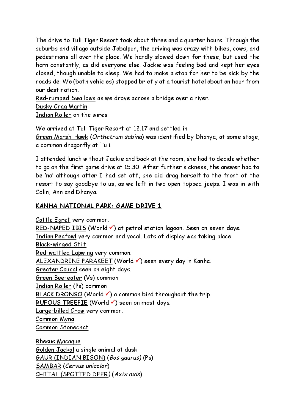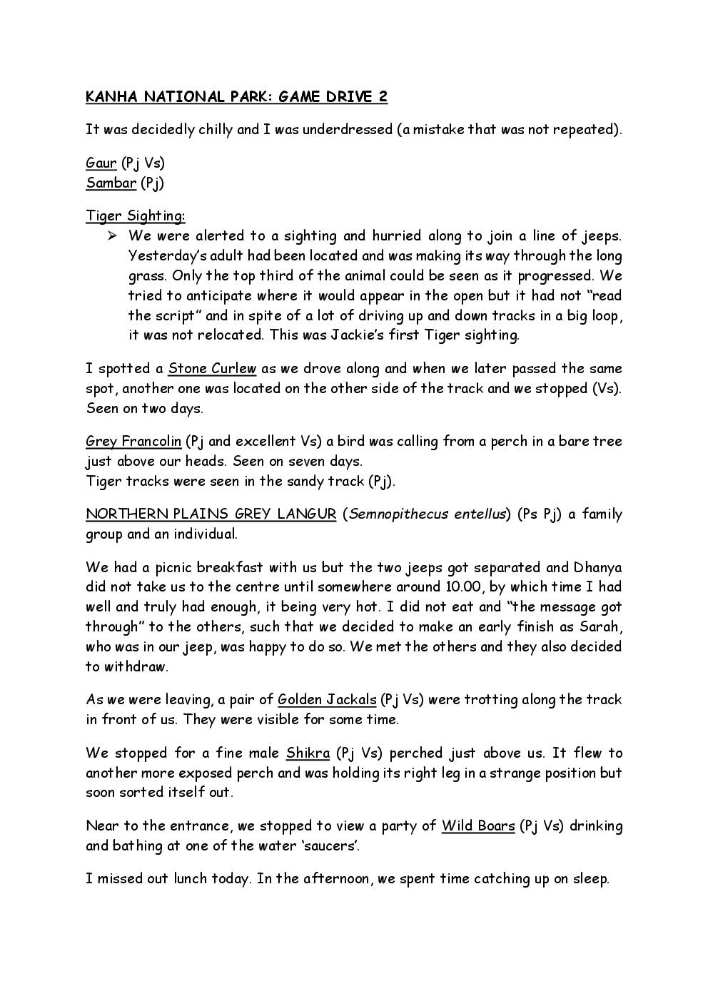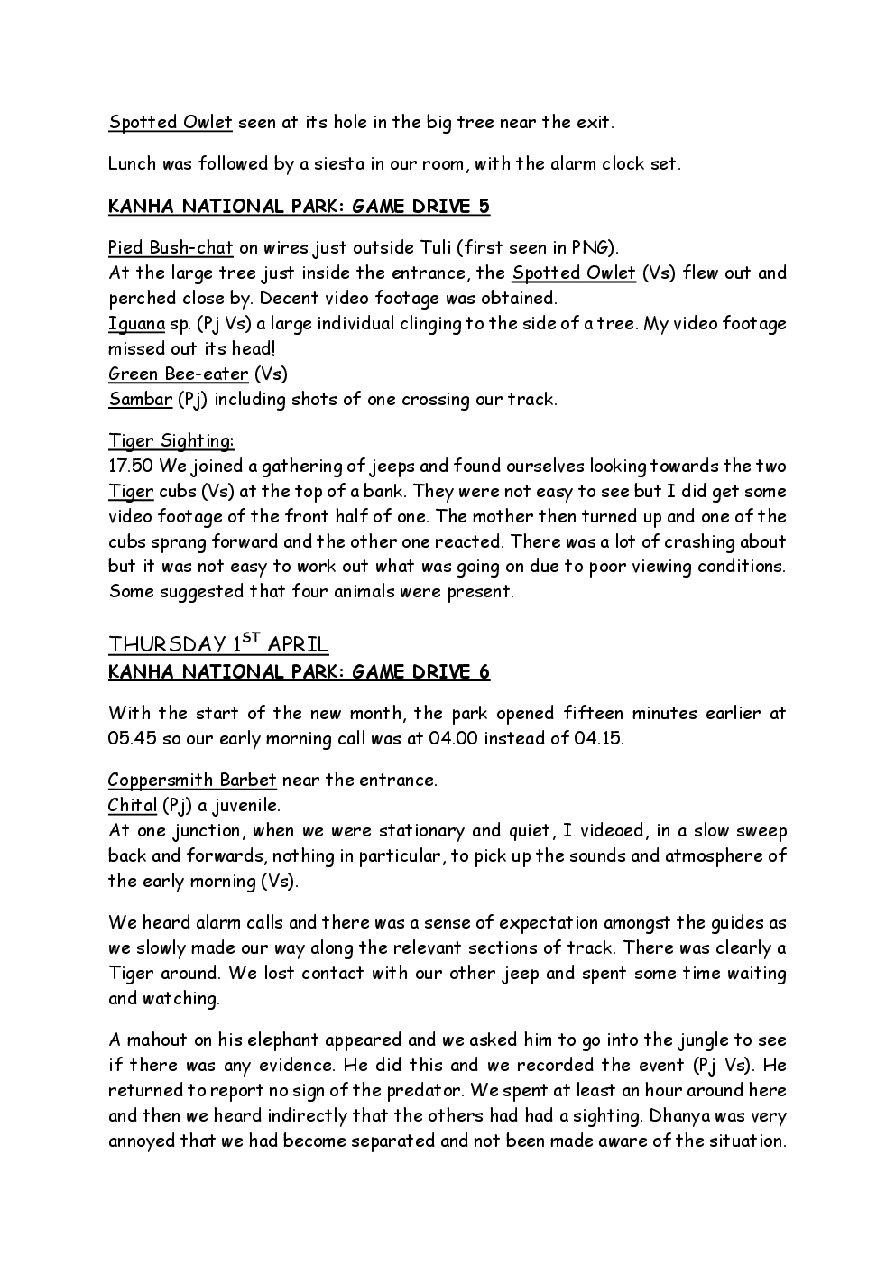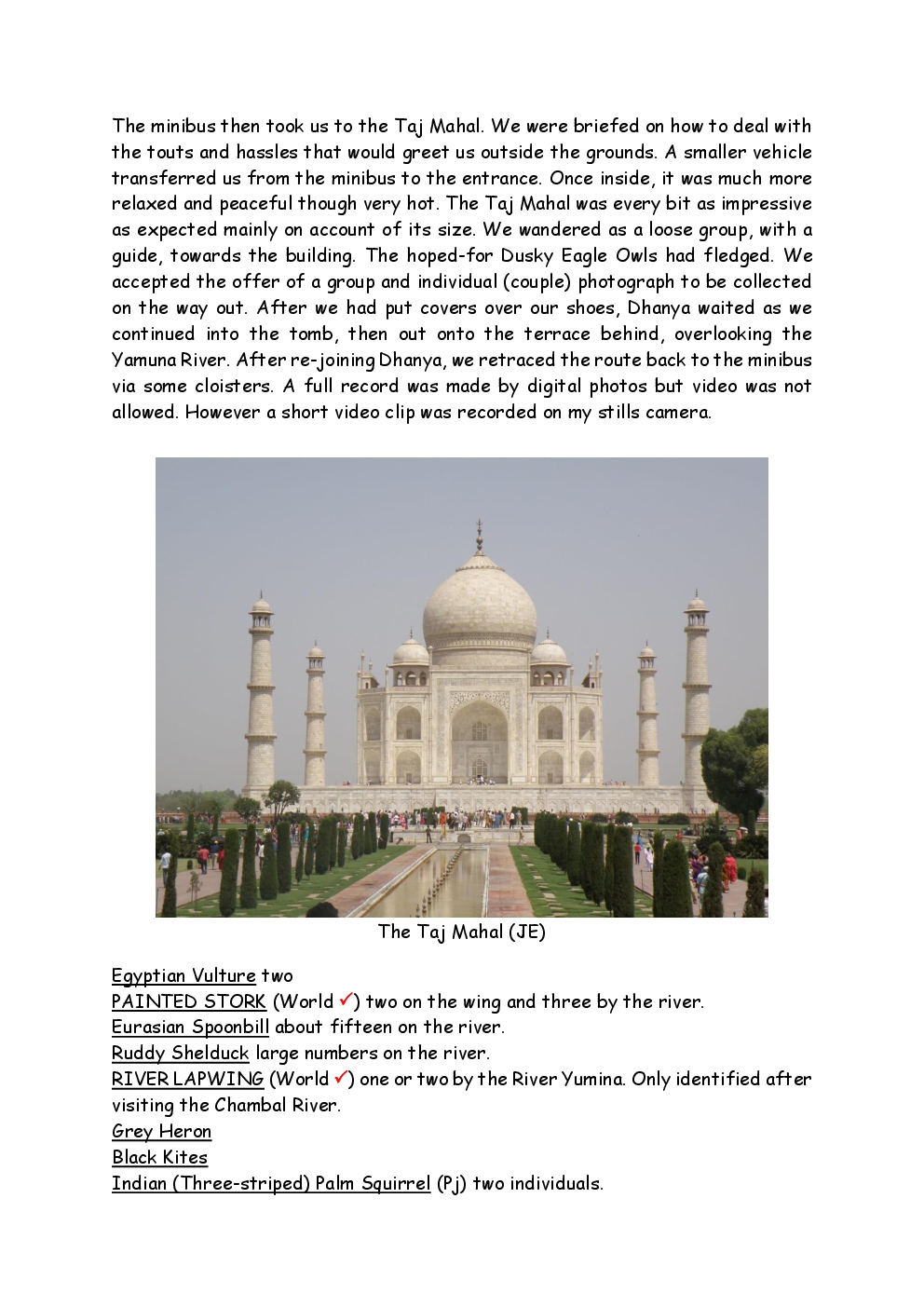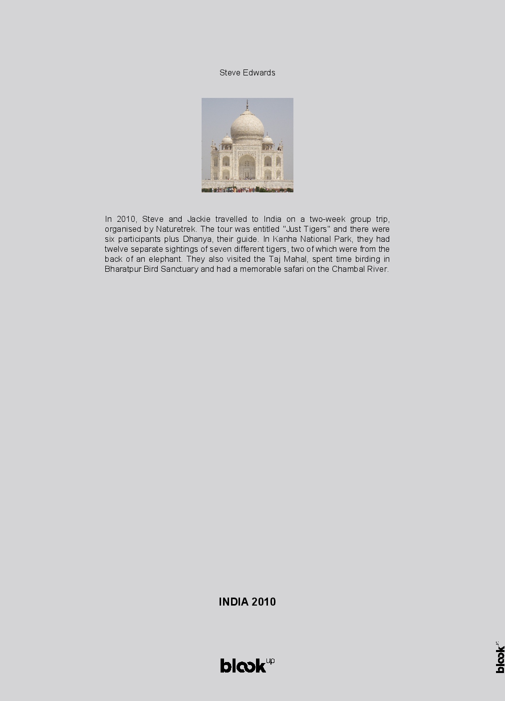 In 2010, Steve and Jackie travelled to India on a two-week group trip, organised by Naturetrek. The tour was entitled "Just Tigers" and there were six participants plus Dhanya, their guide. In Kanha National Park, they had twelve separate sightings of seven different tigers, two of which were from the back of an elephant. They also visited the Taj Mahal, spent time birding in Bharatpur Bird Sanctuary and had a memorable safari on the Chambal River.