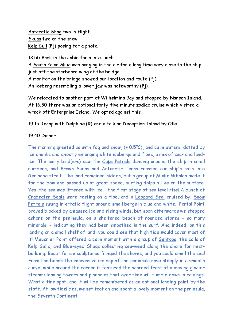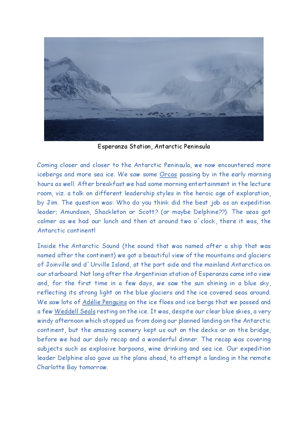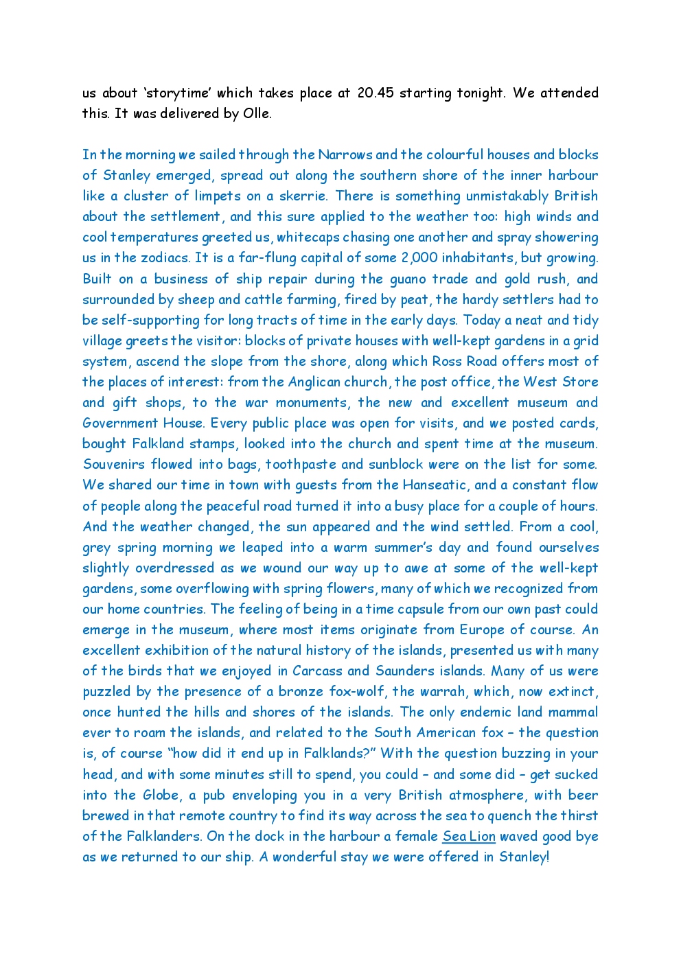 In November 2014, Steve and Jackie embarked upon a trip to the Antarctic, run by the company Oceanwide Expeditions, on the ship Ortelius. They left from Puerto Madryn on the coast of Argentina, and headed for the Falklands. From there, they continued to South Georgia, before reaching the Antarctic Peninsula, where the ice was sufficiently forgiving to allow them to set foot on the continent. After visiting Deception Island and Half Moon Island, they crossed the Drake Passage to Ushuaia, where the trip ended. Before and after the trip, they took the opportunity to explore parts of Patagonia, as well as spending a short period in Buenos Aires.