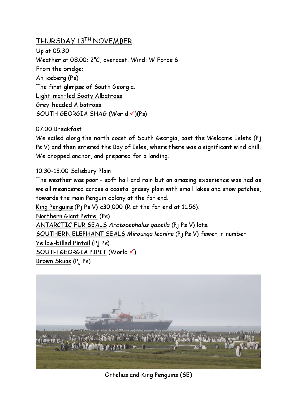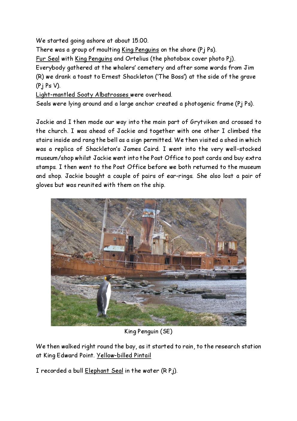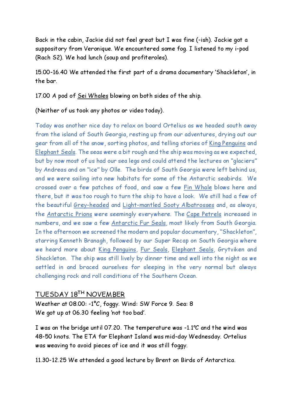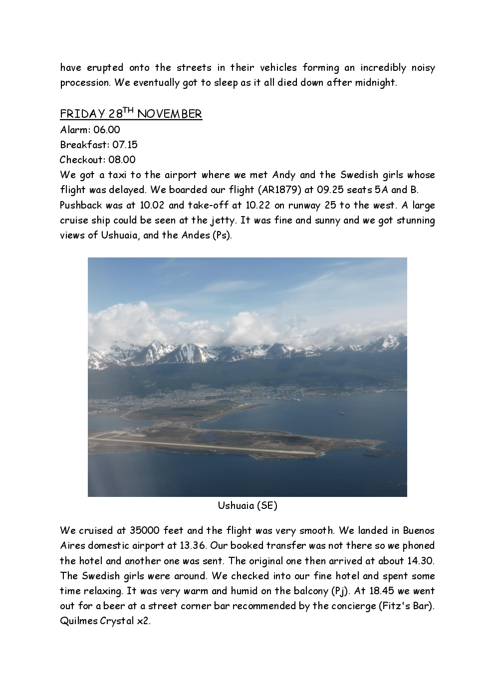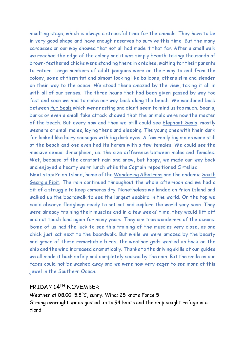 In November 2014, Steve and Jackie embarked upon a trip to the Antarctic, run by the company Oceanwide Expeditions, on the ship Ortelius. They left from Puerto Madryn on the coast of Argentina, and headed for the Falklands. From there, they continued to South Georgia, before reaching the Antarctic Peninsula, where the ice was sufficiently forgiving to allow them to set foot on the continent. After visiting Deception Island and Half Moon Island, they crossed the Drake Passage to Ushuaia, where the trip ended. Before and after the trip, they took the opportunity to explore parts of Patagonia, as well as spending a short period in Buenos Aires.