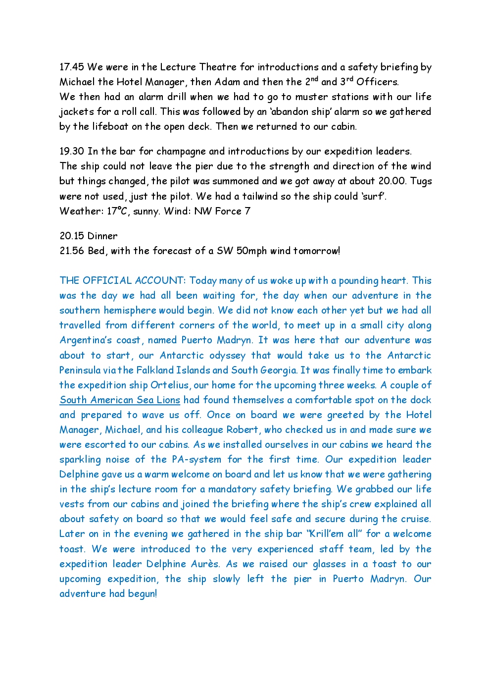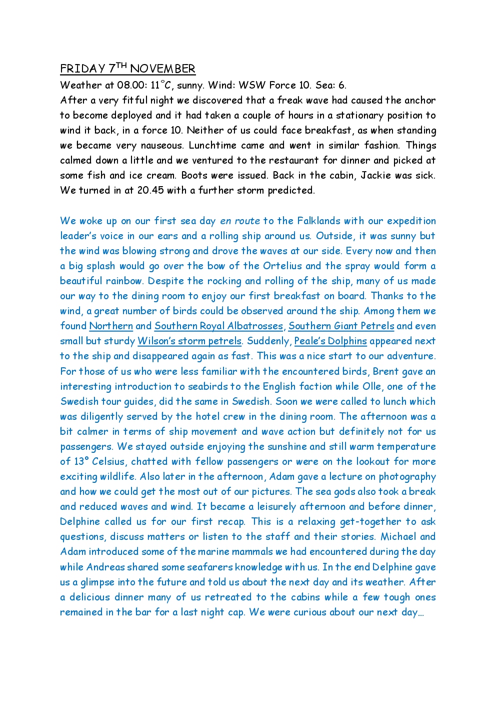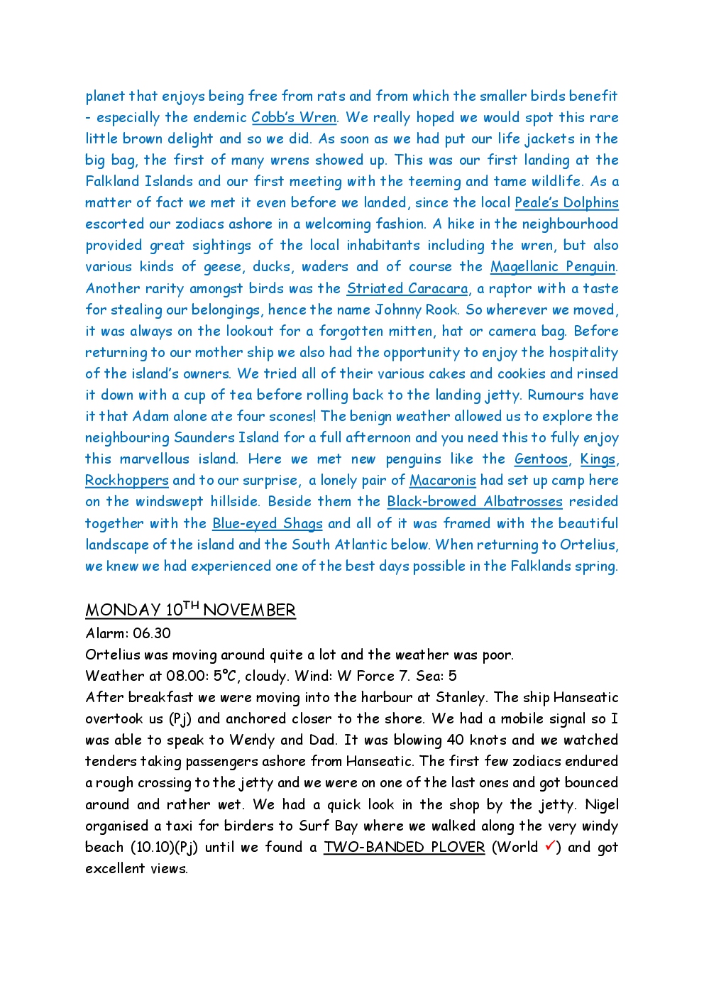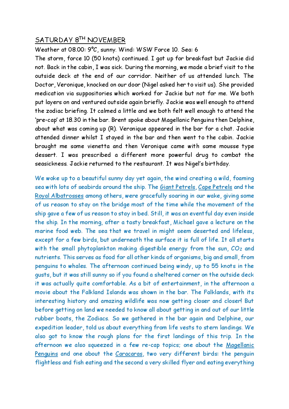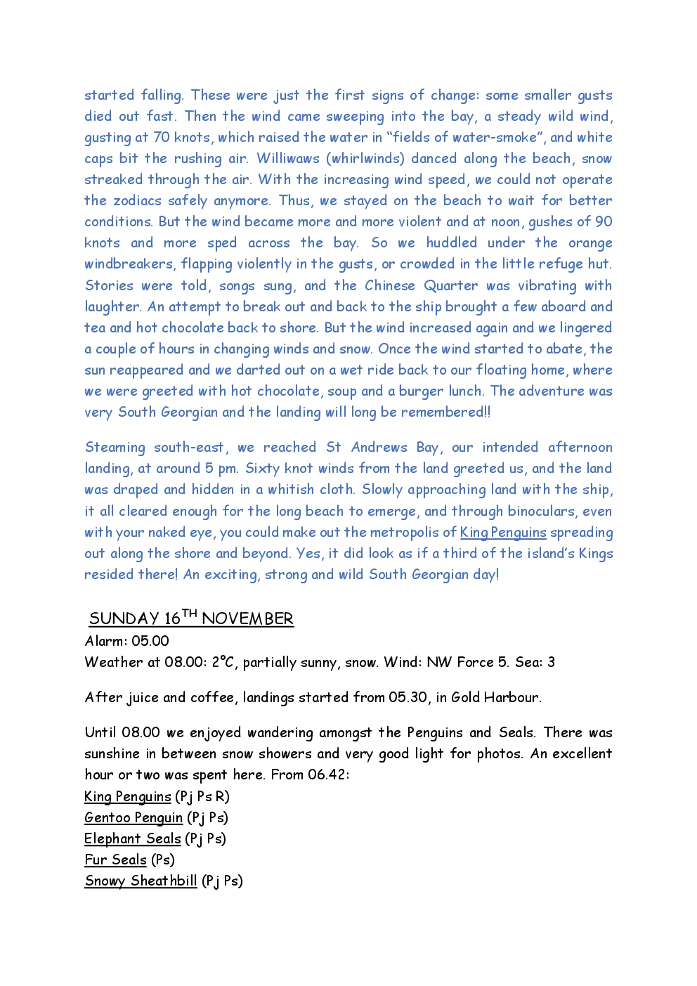 In November 2014, Steve and Jackie embarked upon a trip to the Antarctic, run by the company Oceanwide Expeditions, on the ship Ortelius. They left from Puerto Madryn on the coast of Argentina, and headed for the Falklands. From there, they continued to South Georgia, before reaching the Antarctic Peninsula, where the ice was sufficiently forgiving to allow them to set foot on the continent. After visiting Deception Island and Half Moon Island, they crossed the Drake Passage to Ushuaia, where the trip ended. Before and after the trip, they took the opportunity to explore parts of Patagonia, as well as spending a short period in Buenos Aires.