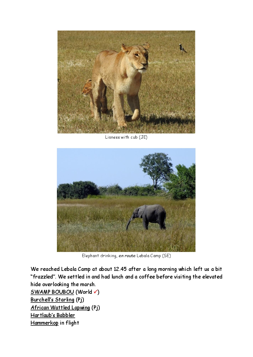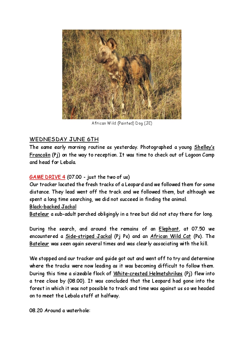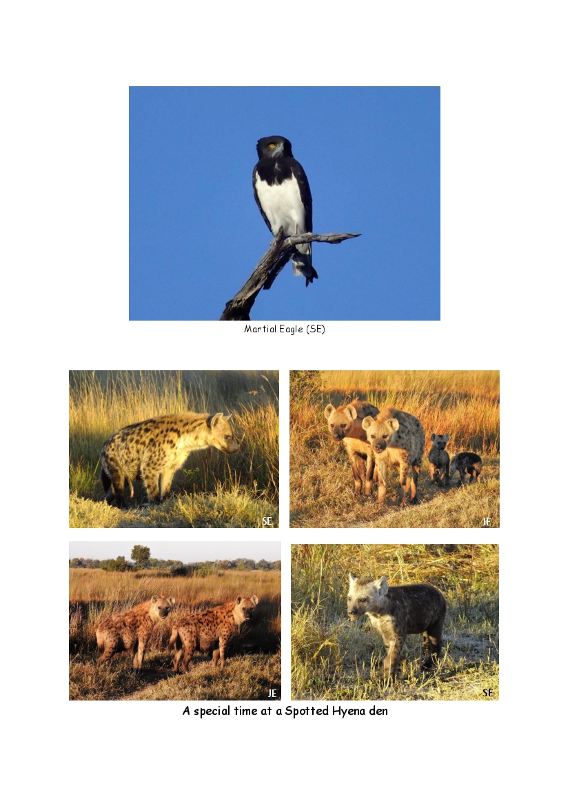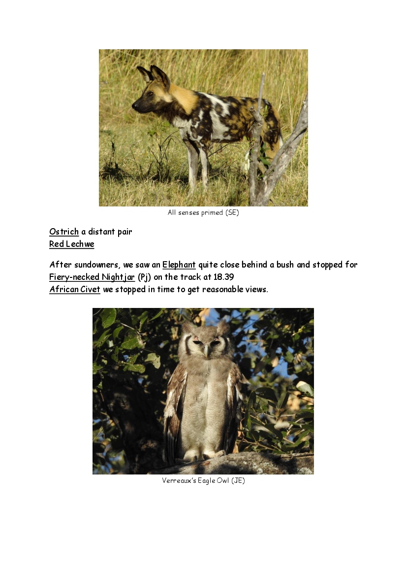 In June 2018, Steve and Jackie returned to Africa. After a visit to Victoria Falls and Zimbabwe National Park, they crossed into northern Botswana and spent time at three tented camps. The first two were close to the border with Namibia and the third was further south, in the Okavango Delta. Transport between the camps was by chartered light aircraft. Two of their most sought-after species were the Painted Wolf (aka African Hunting Dog) and the Secretary Bird. After fifteen game drives and one boat trip, these hopes had been well and truly fulfilled but they did, of course, see much more besides. This is an illustrated account of the trip.