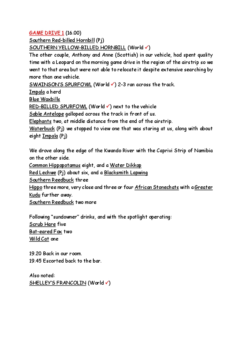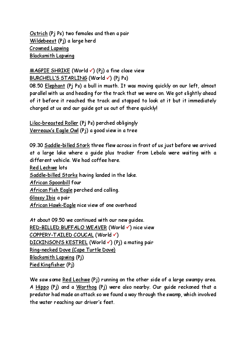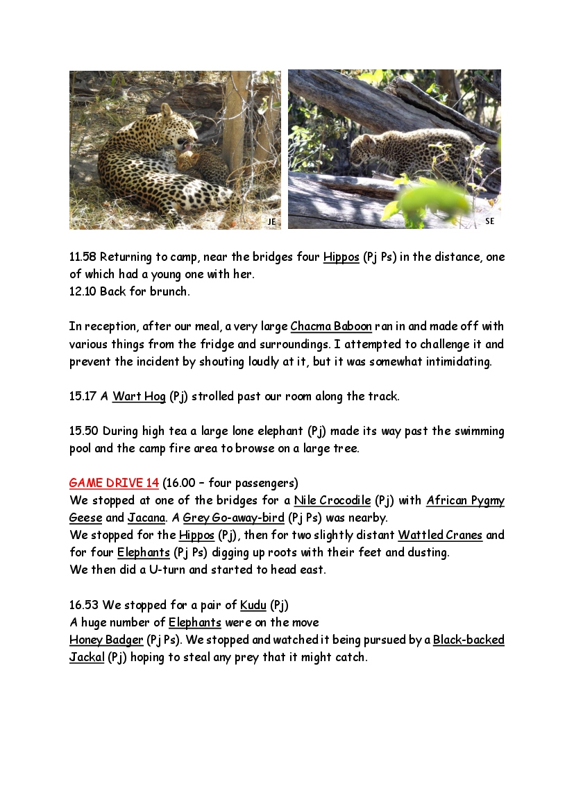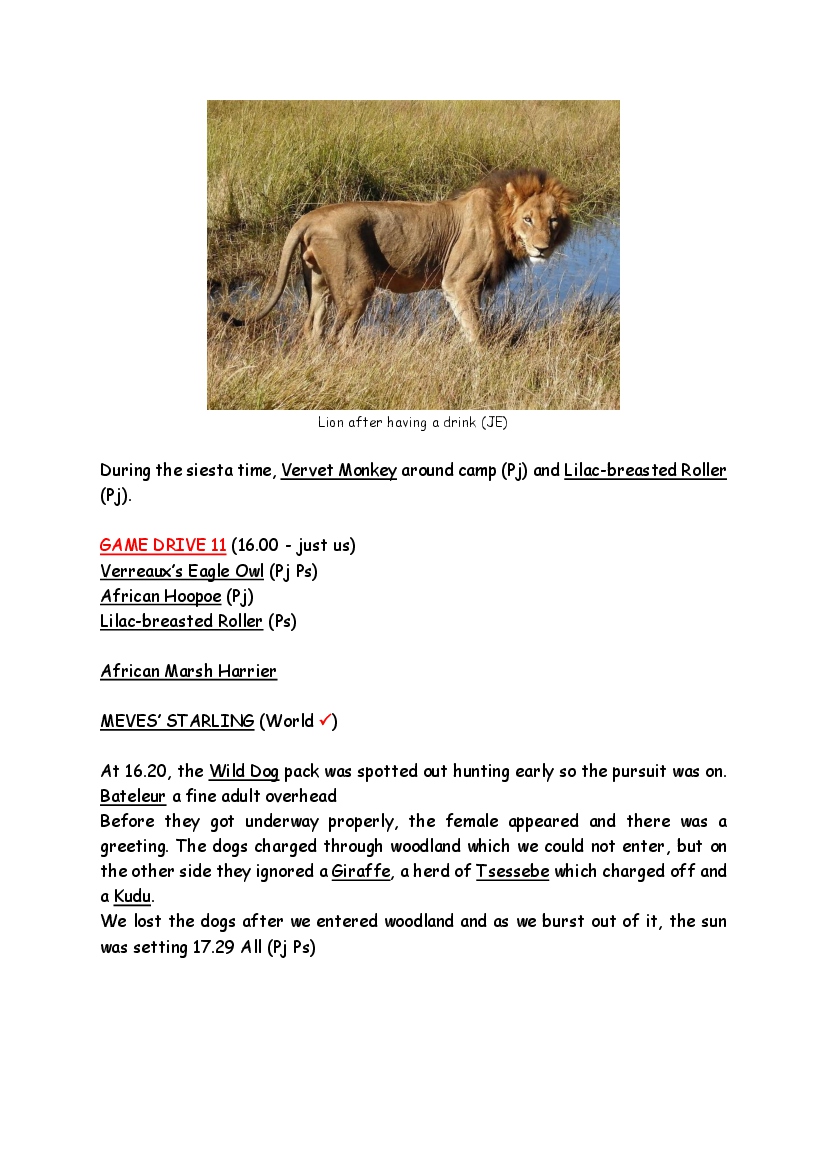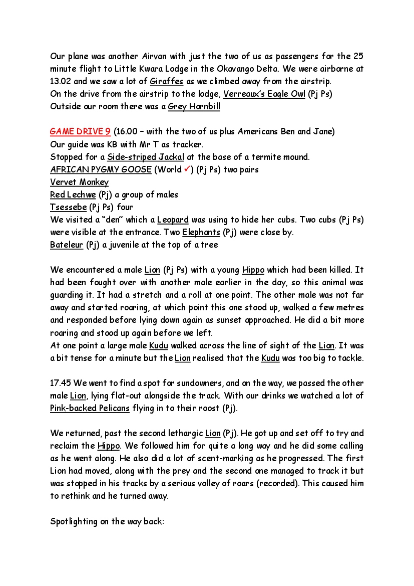 In June 2018, Steve and Jackie returned to Africa. After a visit to Victoria Falls and Zimbabwe National Park, they crossed into northern Botswana and spent time at three tented camps. The first two were close to the border with Namibia and the third was further south, in the Okavango Delta. Transport between the camps was by chartered light aircraft. Two of their most sought-after species were the Painted Wolf (aka African Hunting Dog) and the Secretary Bird. After fifteen game drives and one boat trip, these hopes had been well and truly fulfilled but they did, of course, see much more besides. This is an illustrated account of the trip.