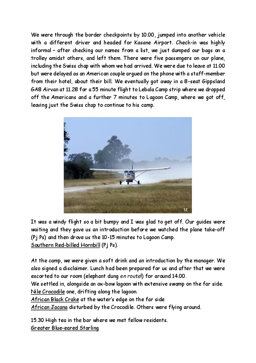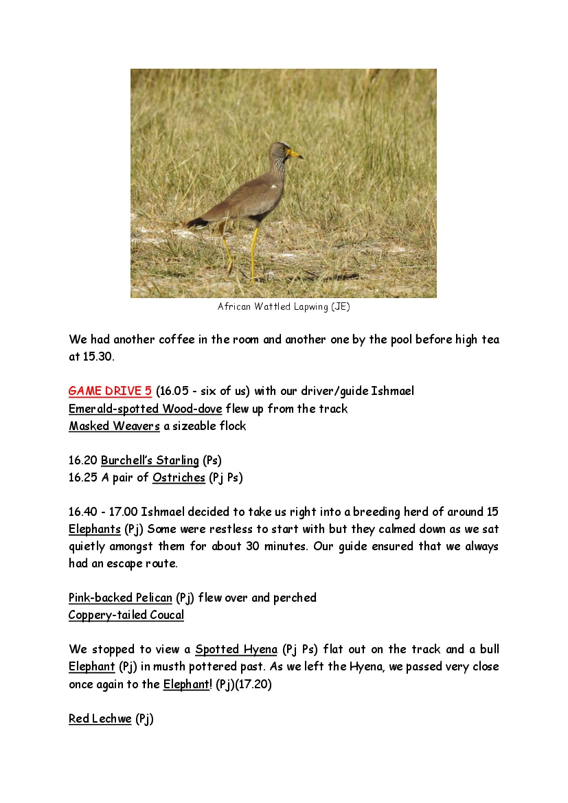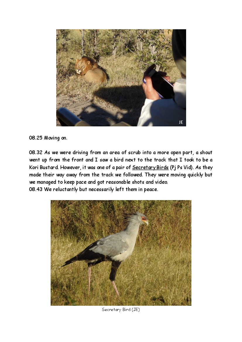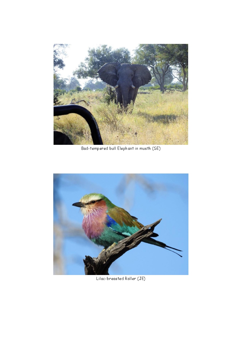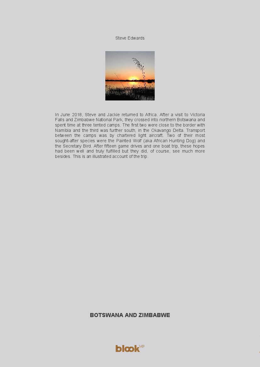 In June 2018, Steve and Jackie returned to Africa. After a visit to Victoria Falls and Zimbabwe National Park, they crossed into northern Botswana and spent time at three tented camps. The first two were close to the border with Namibia and the third was further south, in the Okavango Delta. Transport between the camps was by chartered light aircraft. Two of their most sought-after species were the Painted Wolf (aka African Hunting Dog) and the Secretary Bird. After fifteen game drives and one boat trip, these hopes had been well and truly fulfilled but they did, of course, see much more besides. This is an illustrated account of the trip.