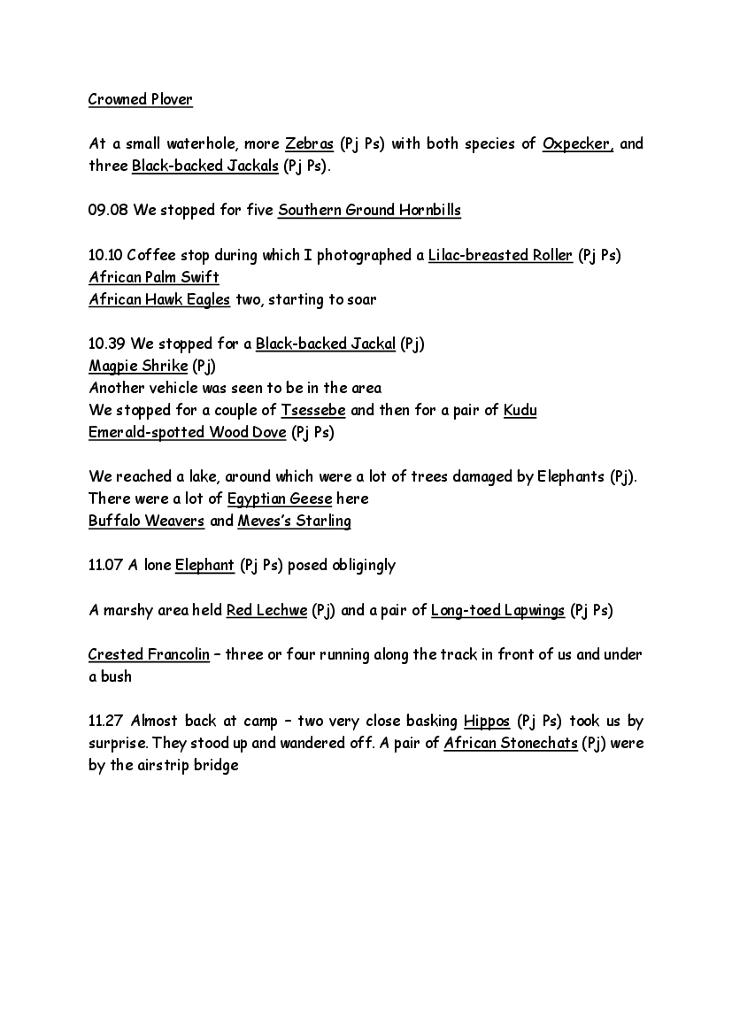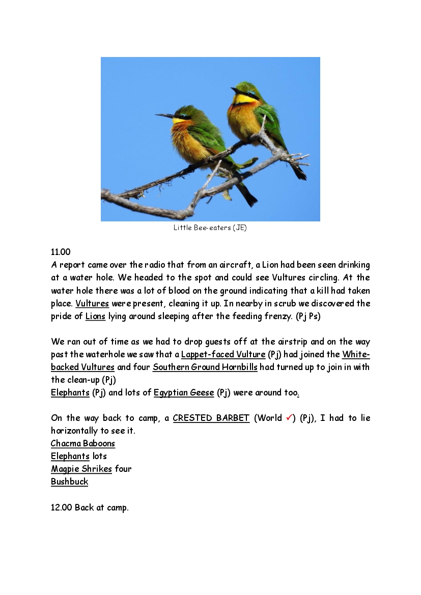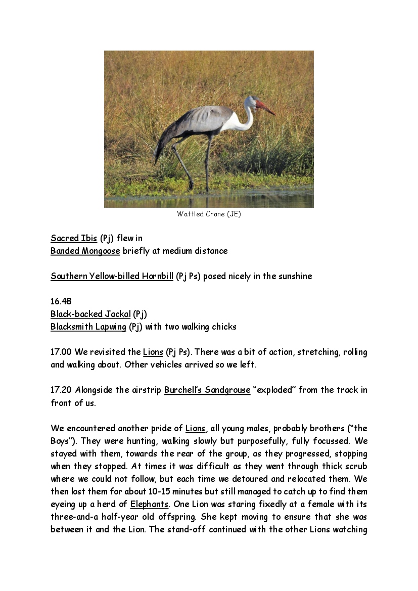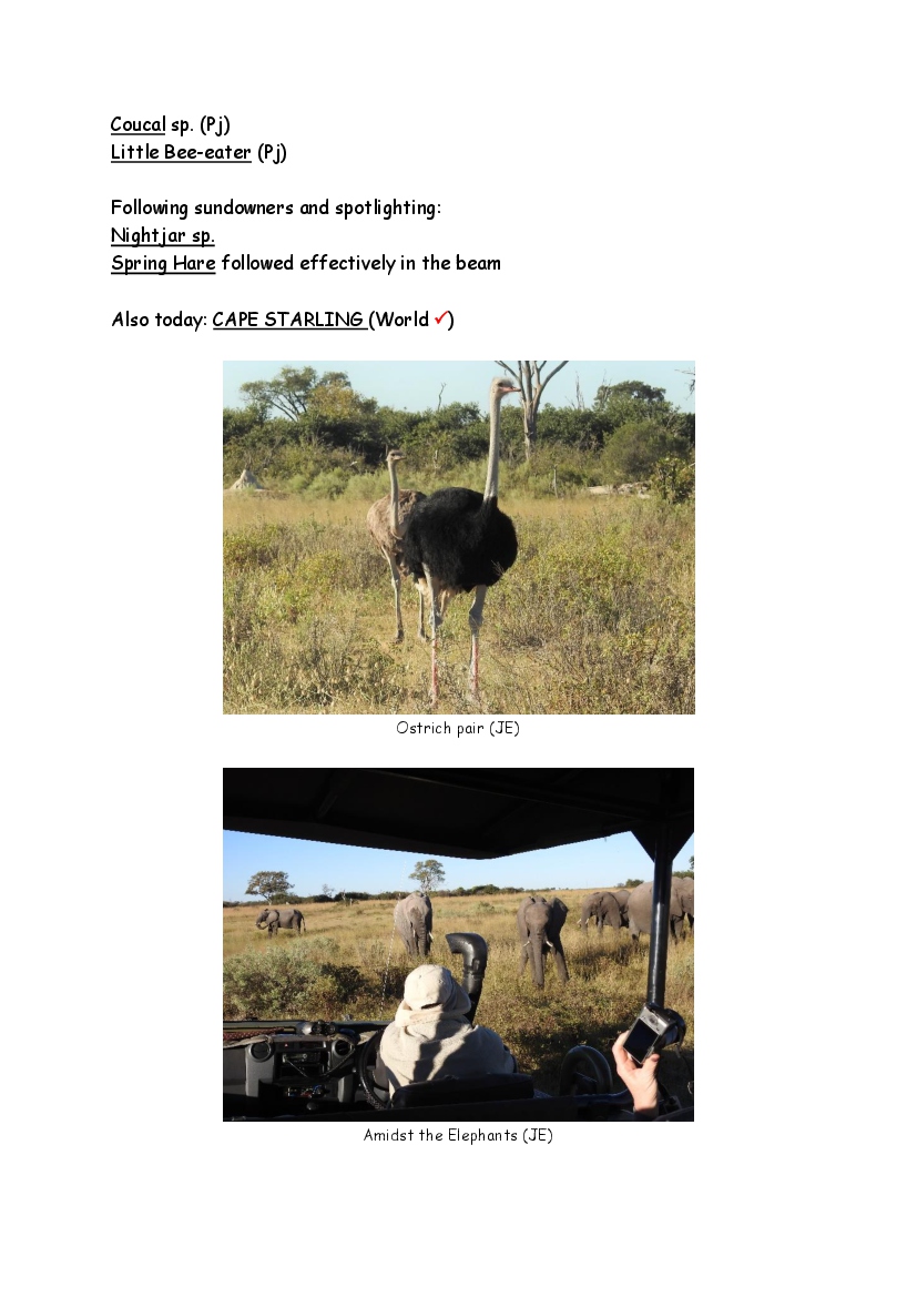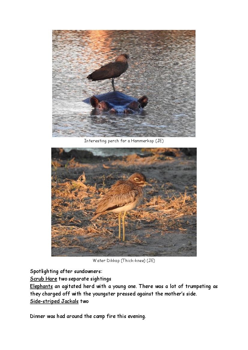 In June 2018, Steve and Jackie returned to Africa. After a visit to Victoria Falls and Zimbabwe National Park, they crossed into northern Botswana and spent time at three tented camps. The first two were close to the border with Namibia and the third was further south, in the Okavango Delta. Transport between the camps was by chartered light aircraft. Two of their most sought-after species were the Painted Wolf (aka African Hunting Dog) and the Secretary Bird. After fifteen game drives and one boat trip, these hopes had been well and truly fulfilled but they did, of course, see much more besides. This is an illustrated account of the trip.