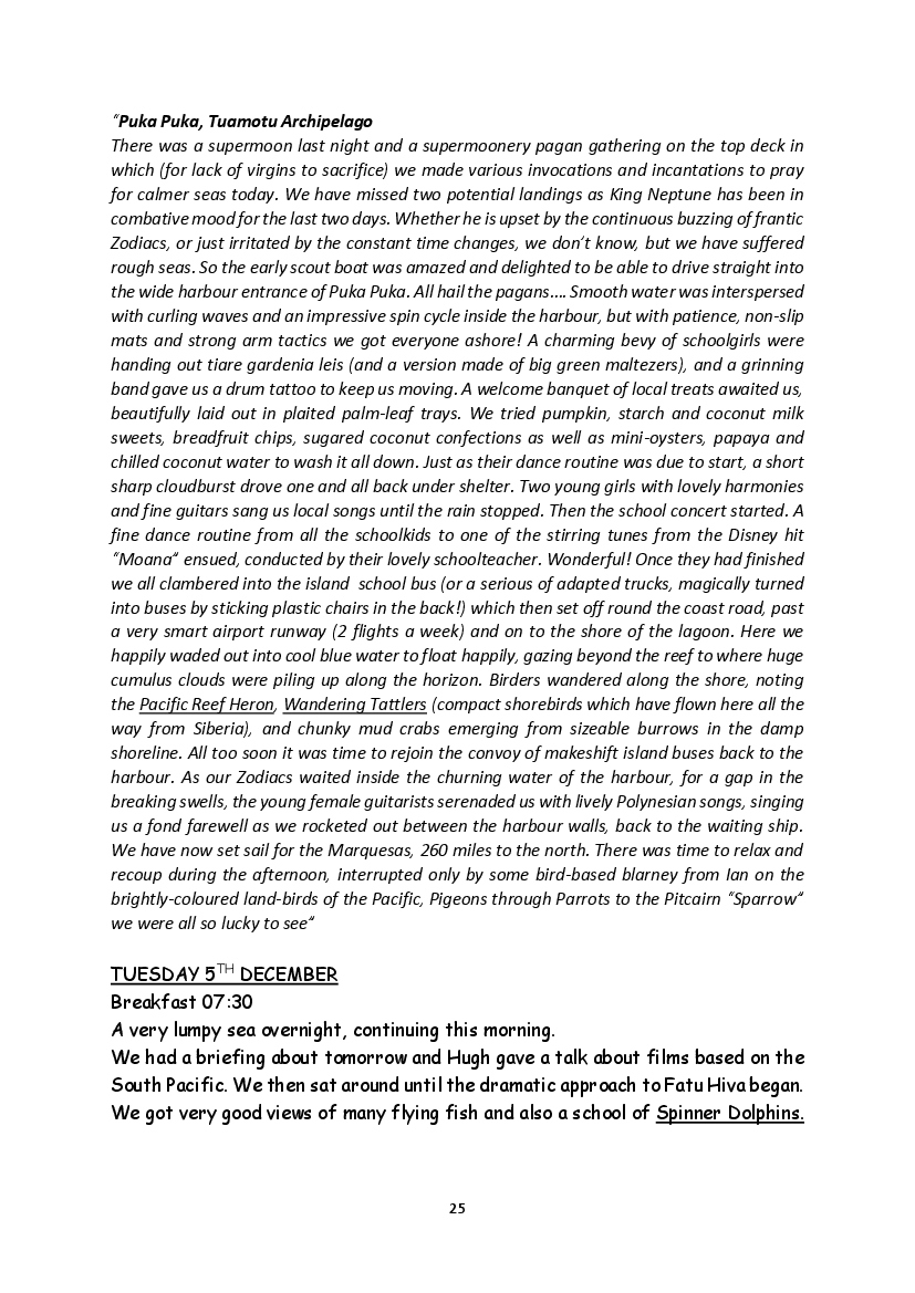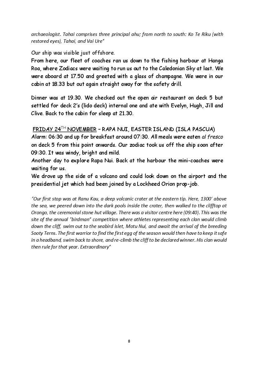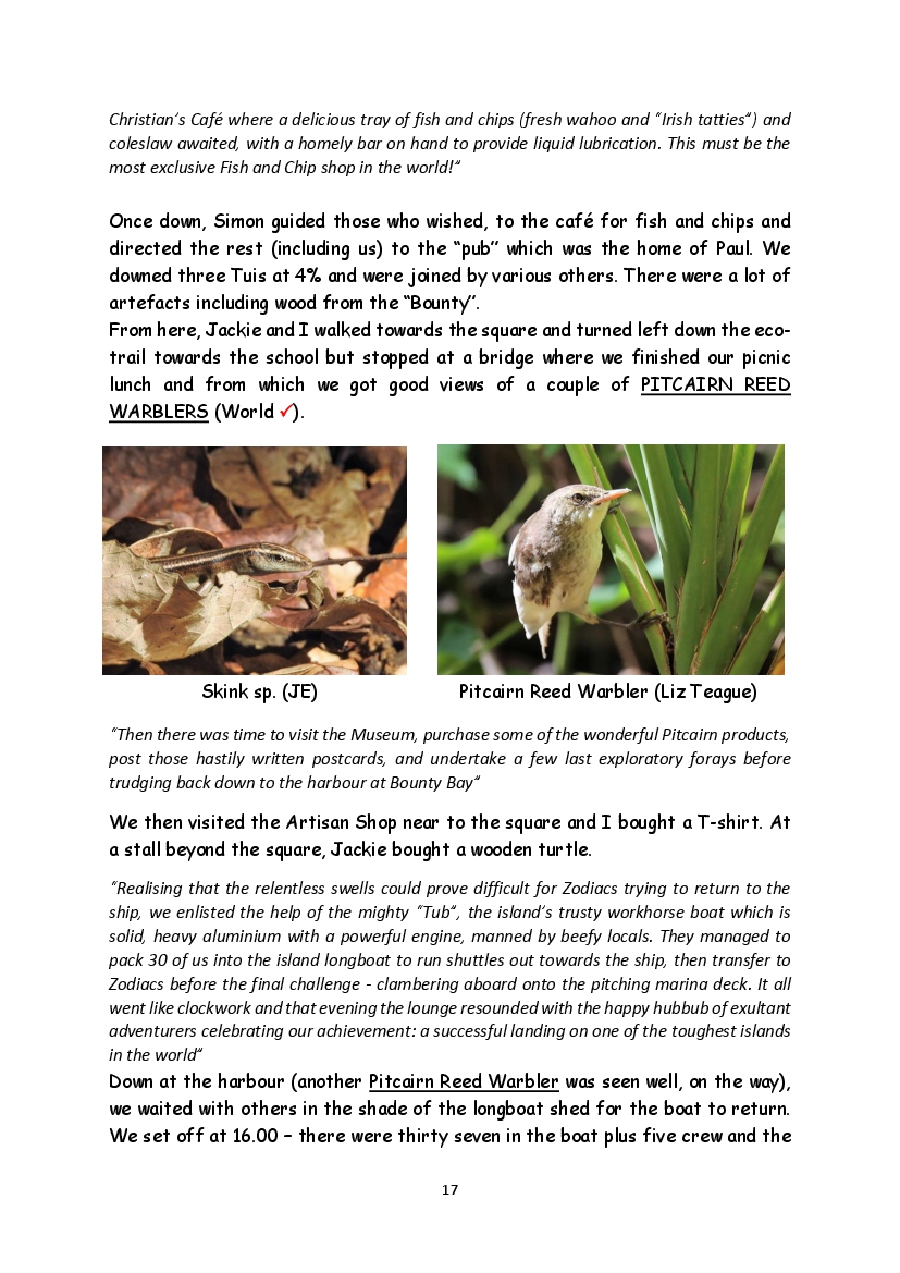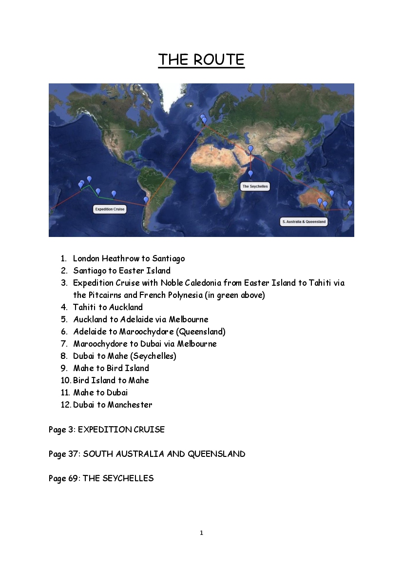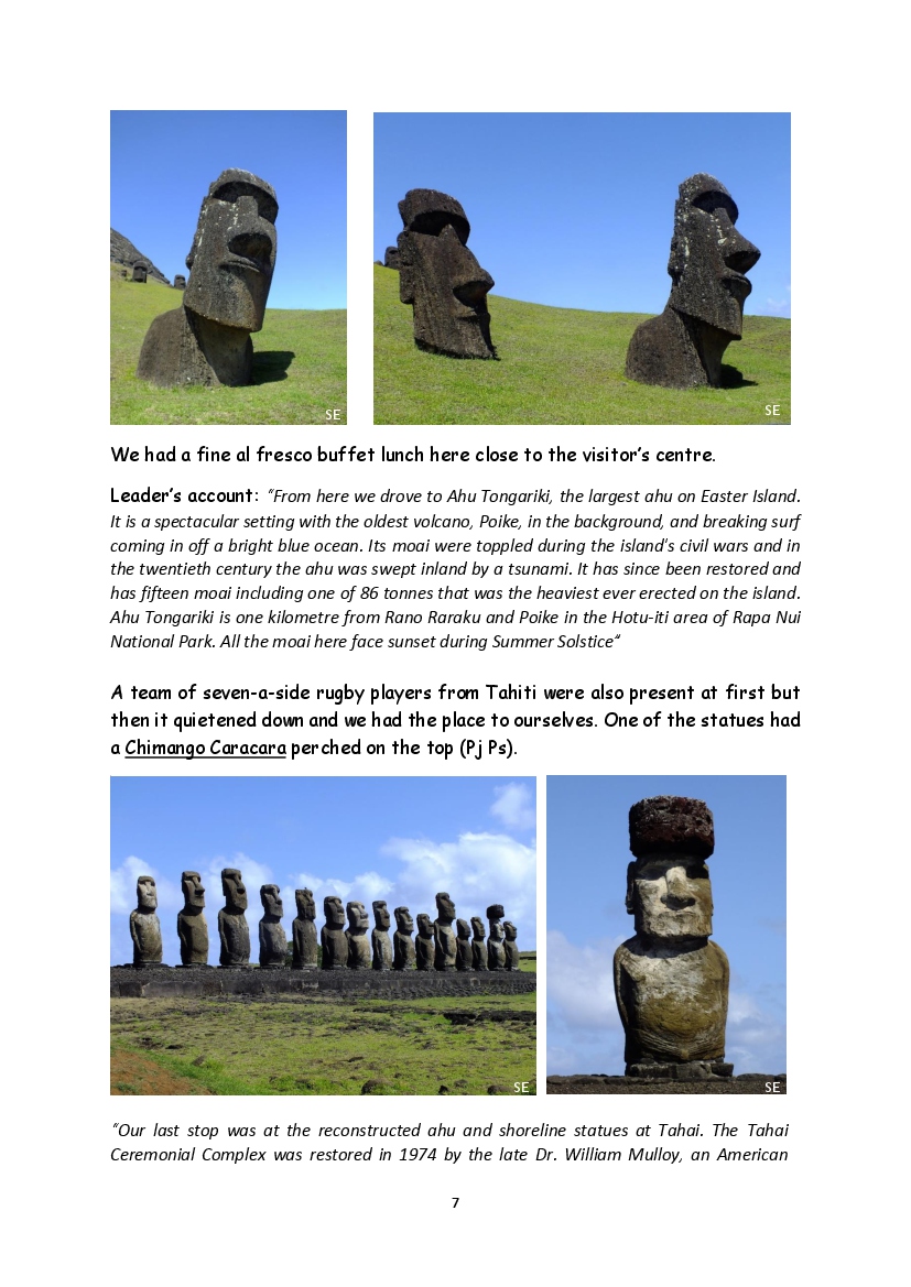 Steve and Jackie first flew to Santiago, Chile, and after a couple of days there, continued to Easter Island where they joined an expedition cruise, run by Nobel Caledonia. Over the next three weeks, they crossed the South Pacific to Tahiti, via the Pitcairns and various islands of French Polynesia. After saying goodbye to their fellow travellers, they continued to South Australia, spending time on Kangaroo Island, at Victor Harbour and at a Bird and Bushland Retreat. After a week with friends on the Sunshine Coast of Queensland, they then visited their much-loved bolt-hole of Bird Island in the Seychelles, for a week, before returning to the UK to complete the circle.