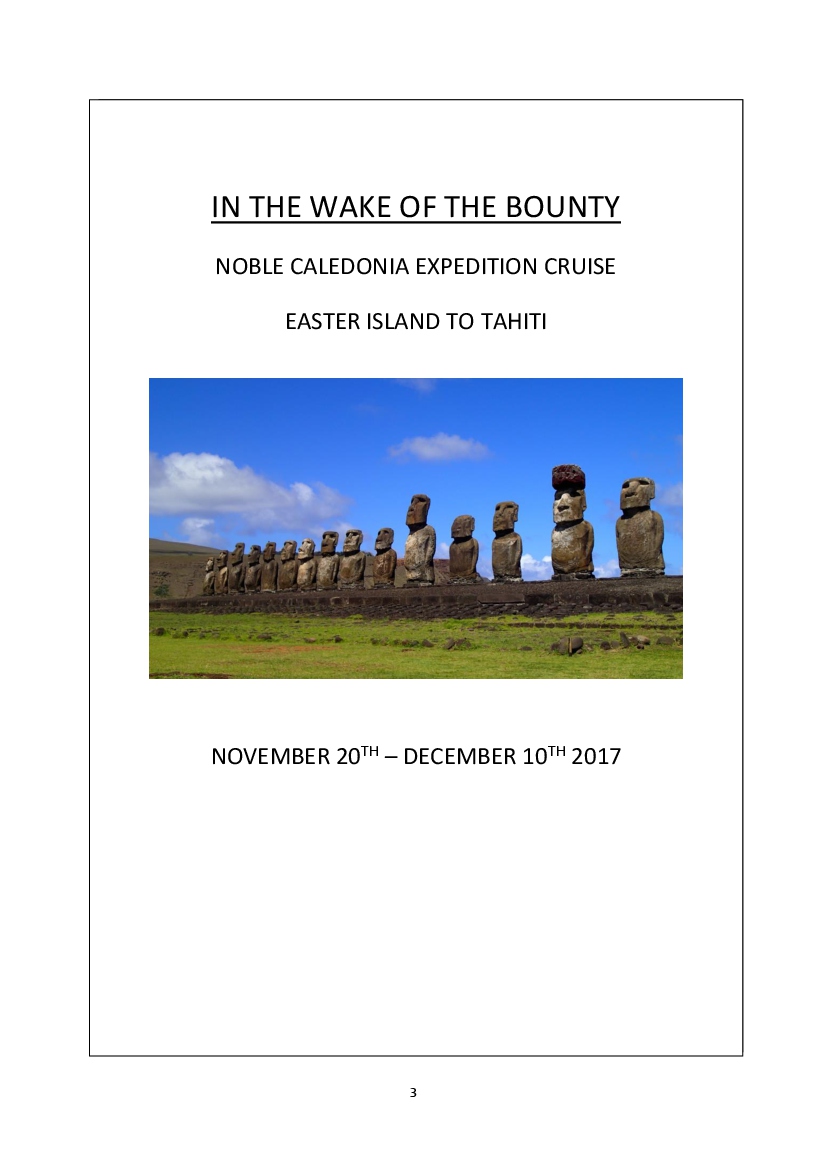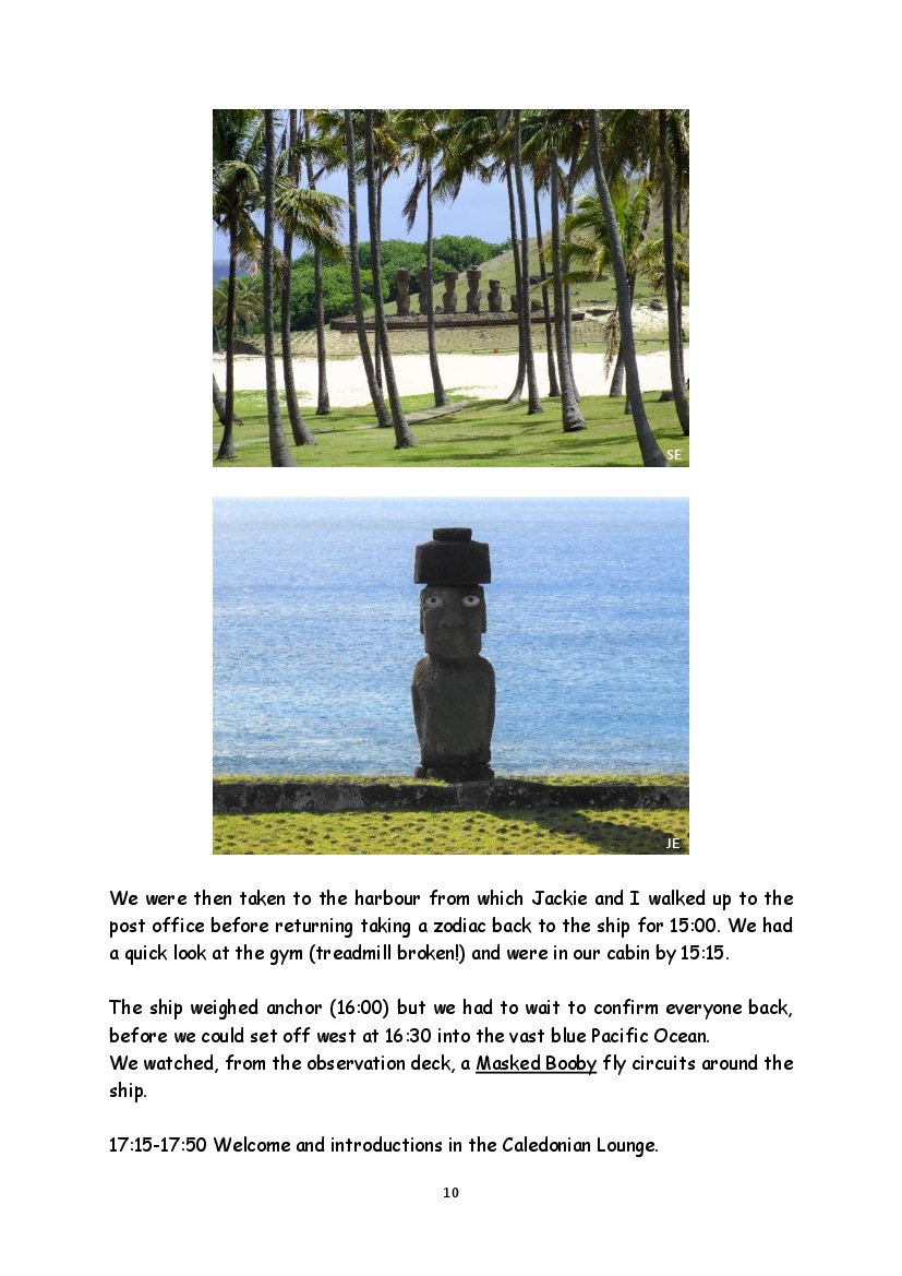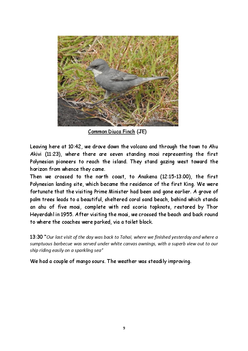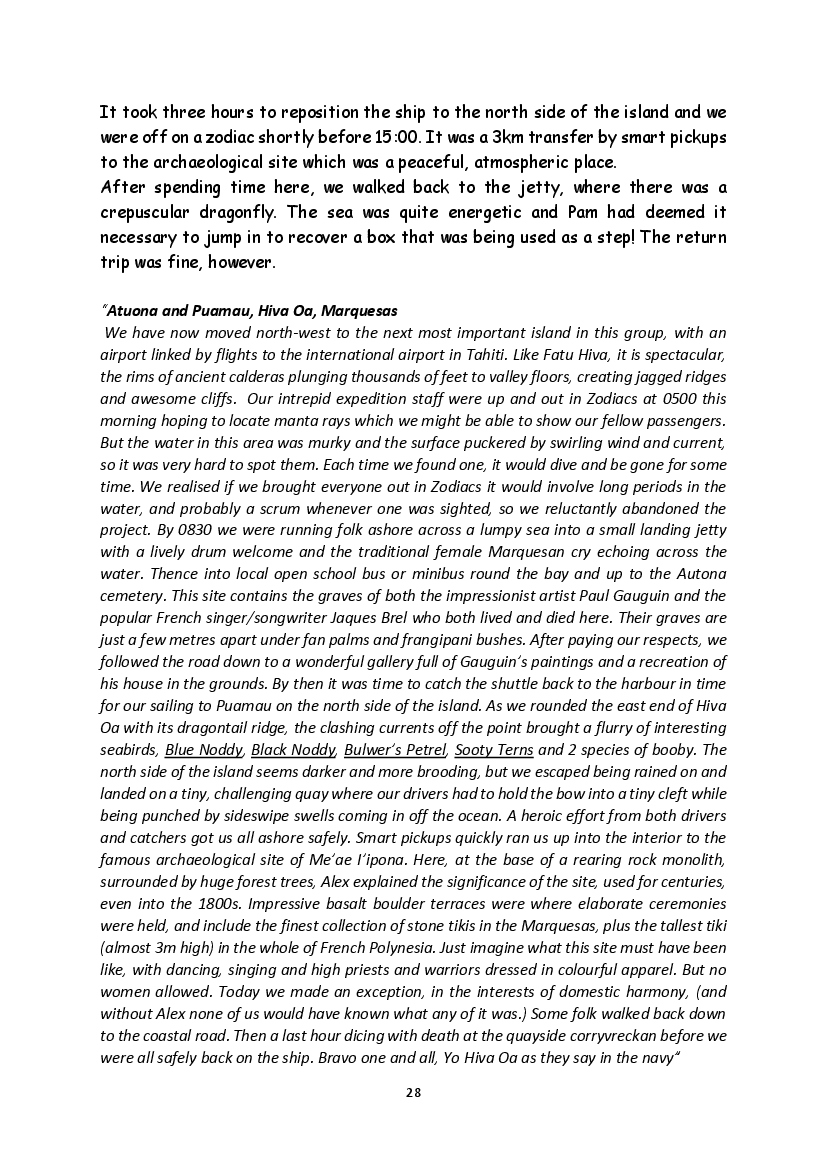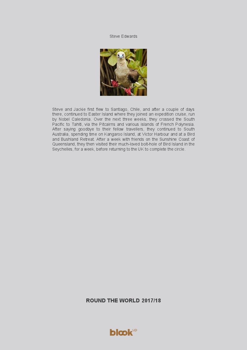 Steve and Jackie first flew to Santiago, Chile, and after a couple of days there, continued to Easter Island where they joined an expedition cruise, run by Nobel Caledonia. Over the next three weeks, they crossed the South Pacific to Tahiti, via the Pitcairns and various islands of French Polynesia. After saying goodbye to their fellow travellers, they continued to South Australia, spending time on Kangaroo Island, at Victor Harbour and at a Bird and Bushland Retreat. After a week with friends on the Sunshine Coast of Queensland, they then visited their much-loved bolt-hole of Bird Island in the Seychelles, for a week, before returning to the UK to complete the circle.