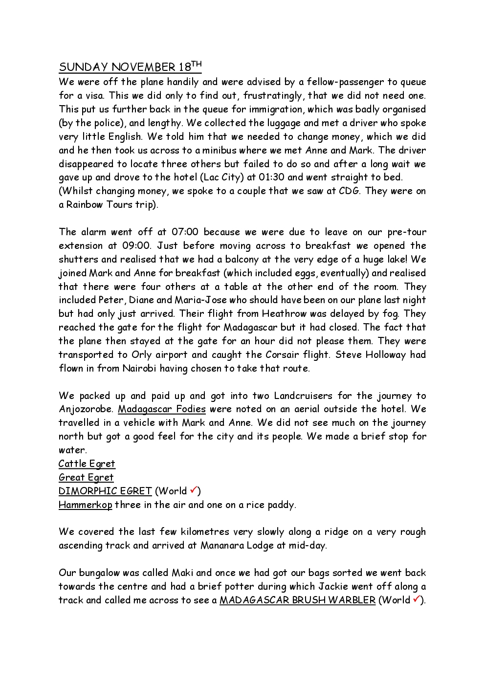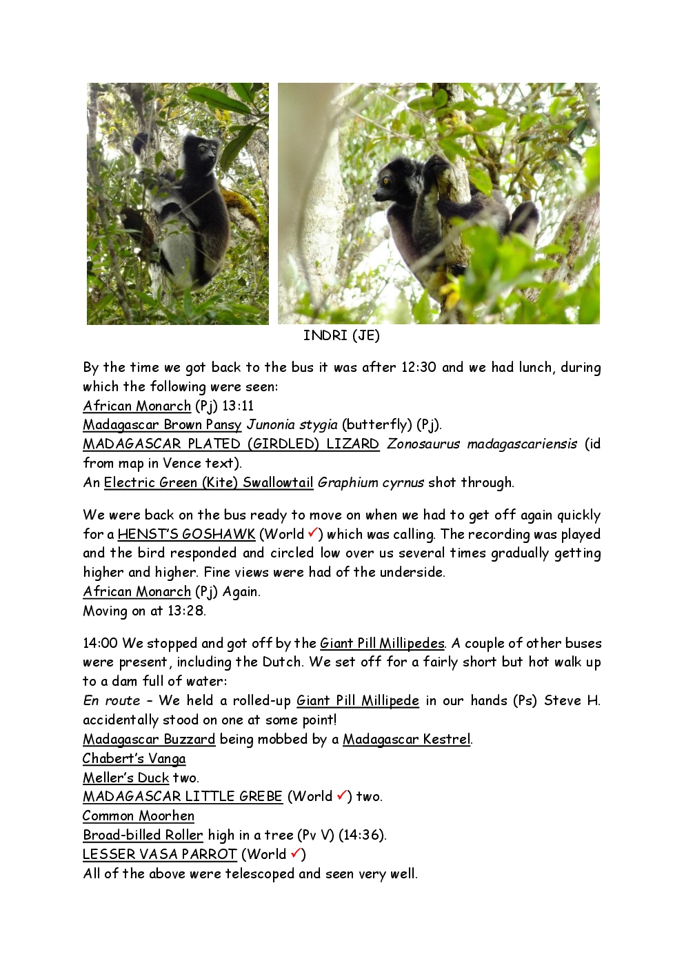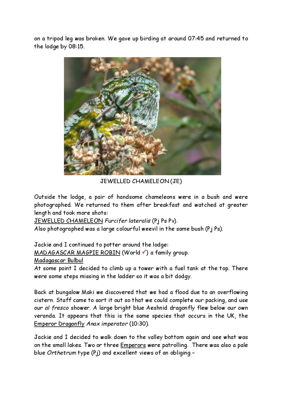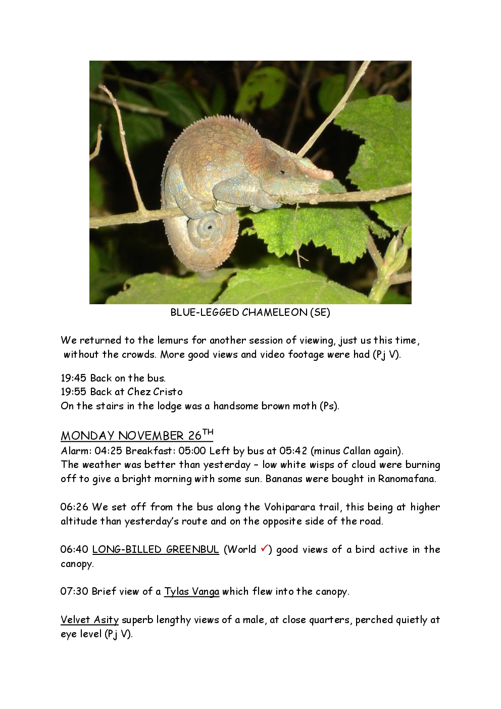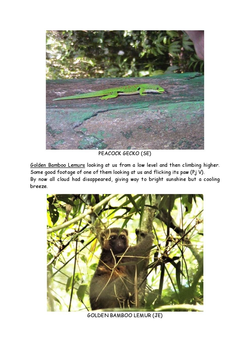 In 2012, Steve and Jackie visited Madagascar on a group expedition with Birding Africa to seek out as much as possible of the largely unique fauna and flora of the island. Their superb guides, Callan and Deirdre are the owners of the company and ensured that an excellent trip was had by all. Most of the remaining native animals and plants are confined to widely separated National Parks so the group used the domestic airline as well as overland travel. Lemurs and chameleons featured highly as did several families of birds which are endemic to the island. It was one of the most successful and memorable trips that Steve and Jackie had been on thus far.