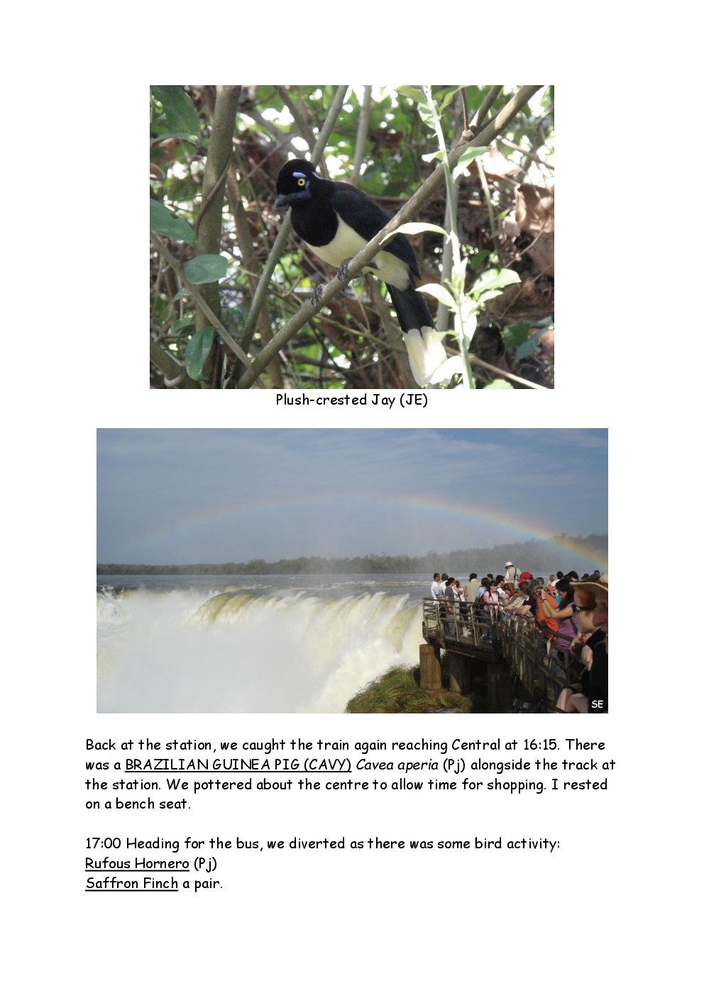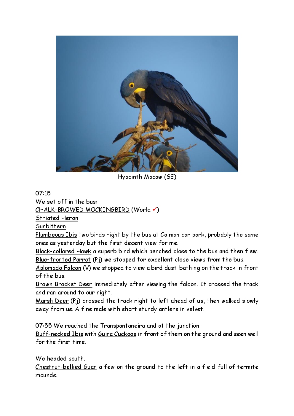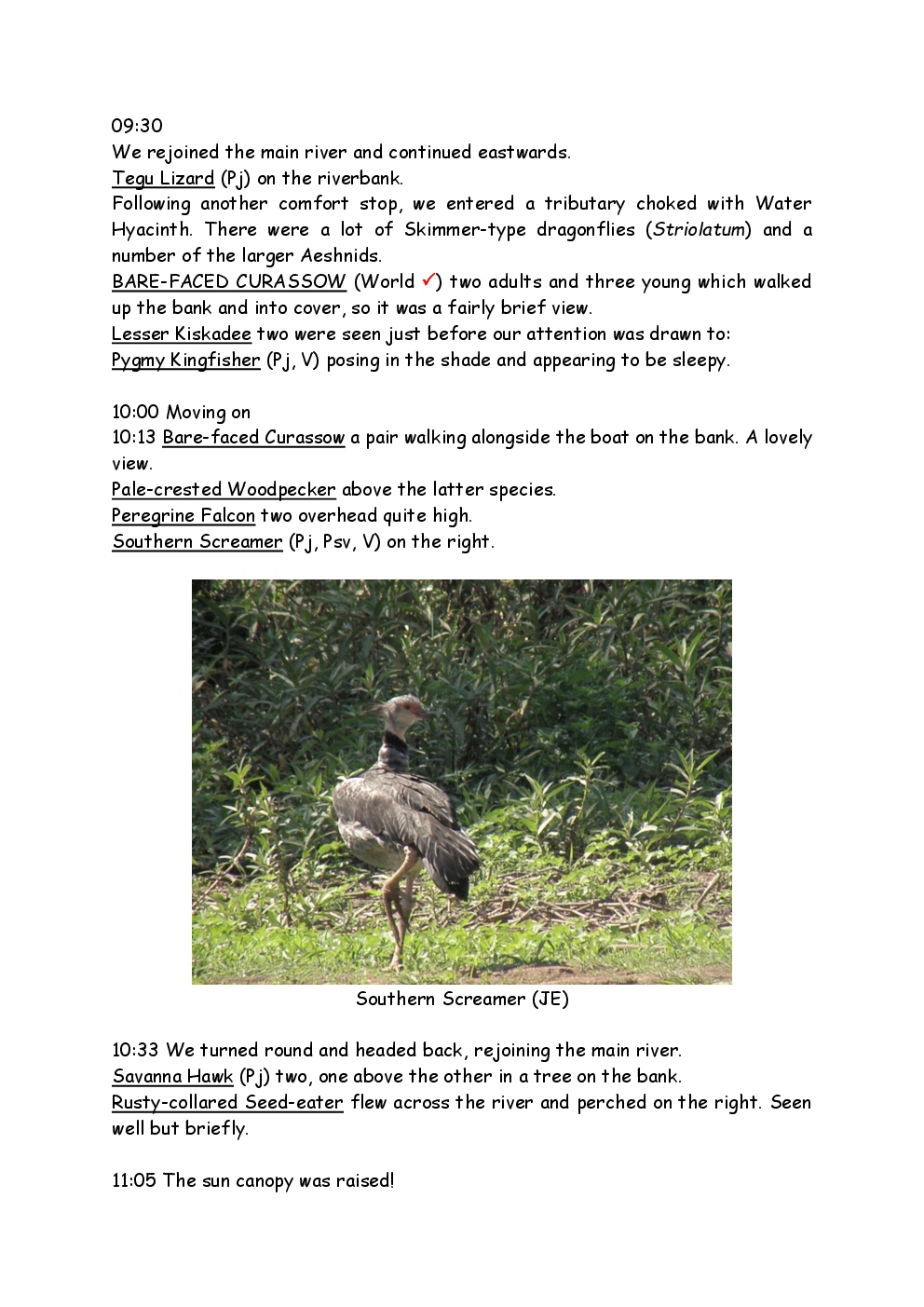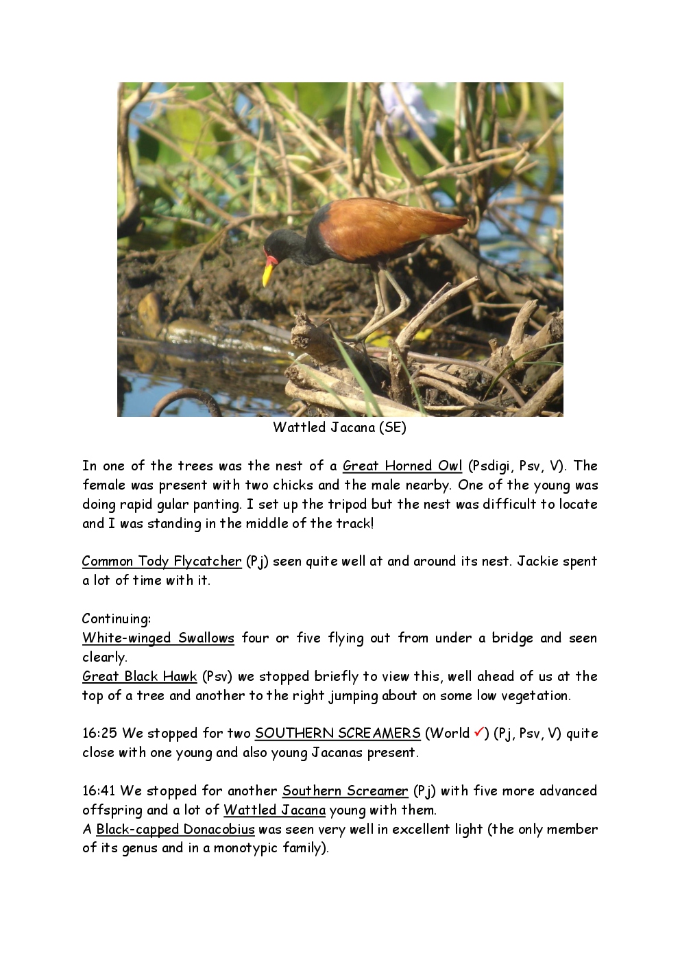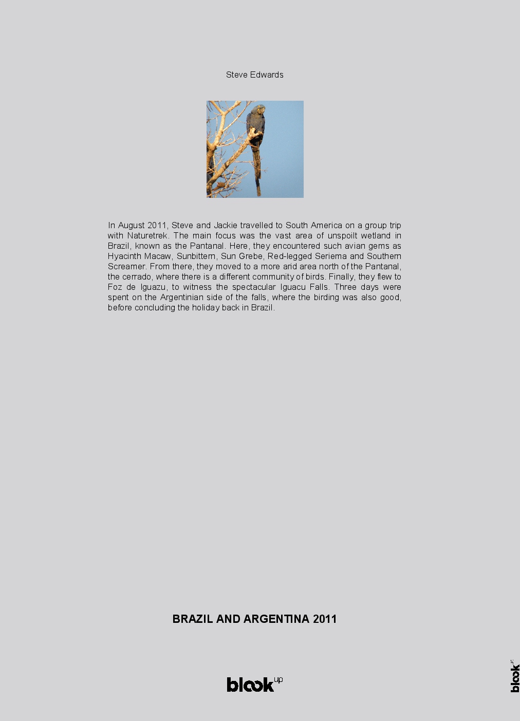 In August 2011, Steve and Jackie travelled to South America on a group trip with Naturetrek. The main focus was the vast area of unspoilt wetland in Brazil, known as the Pantanal. Here, they encountered such avian gems as Hyacinth Macaw, Sunbittern, Sun Grebe, Red-legged Seriema and Southern Screamer. From there, they moved to a more arid area north of the Pantanal, the cerrado, where there is a different community of birds. Finally, they flew to Foz de Iguazu, to witness the spectacular Iguacu Falls. Three days were spent on the Argentinian side of the falls, where the birding was also good, before concluding the holiday back in Brazil.