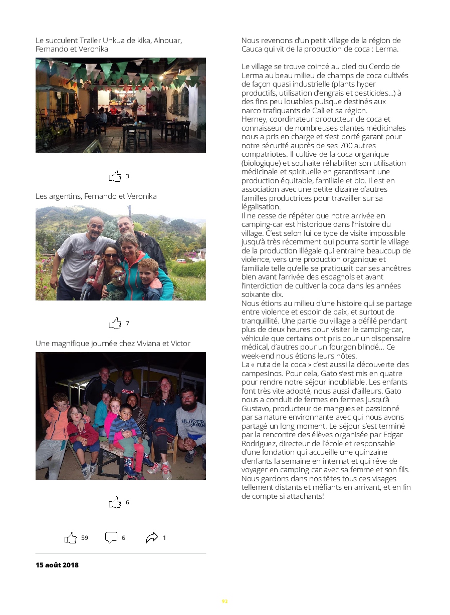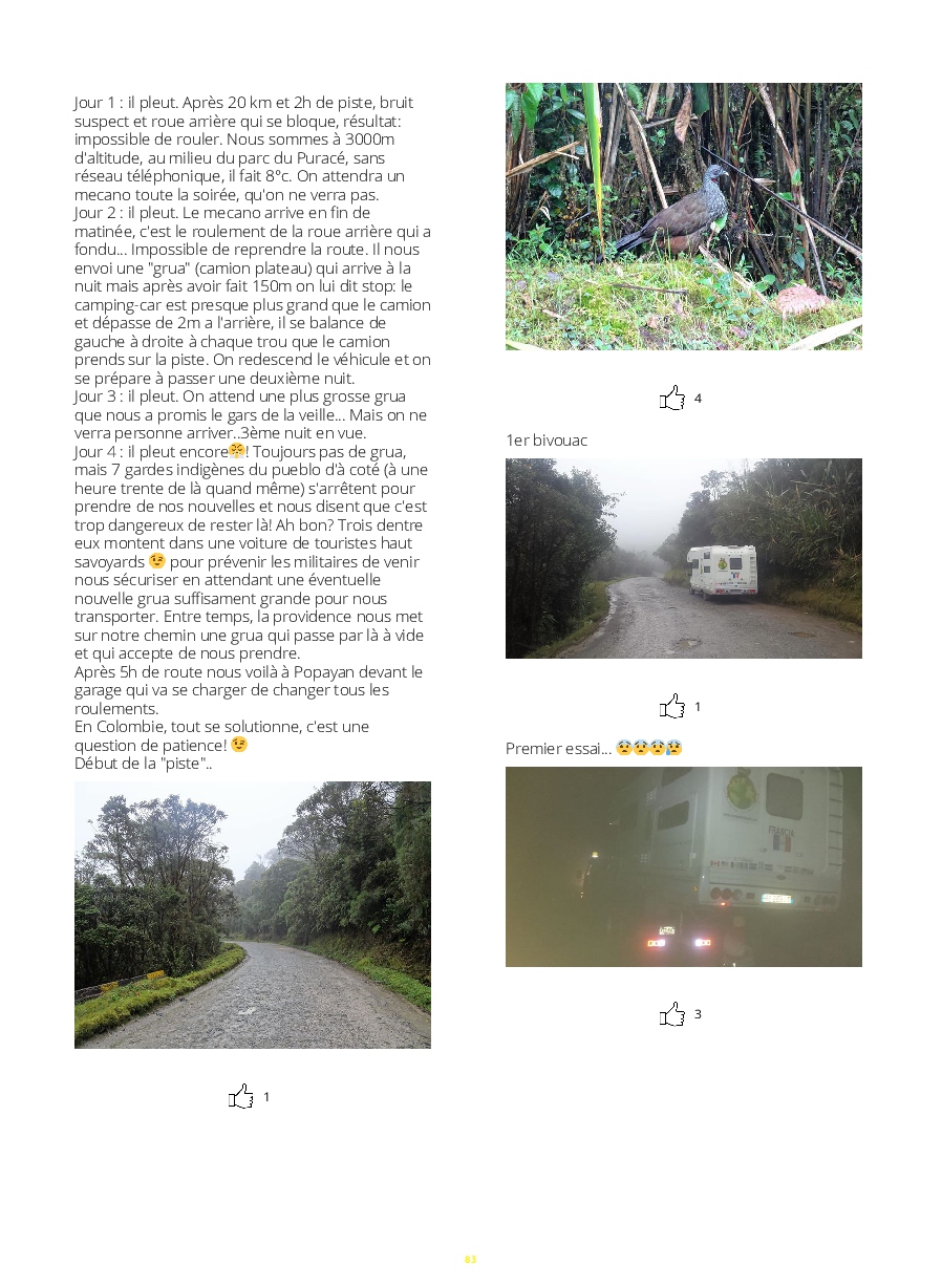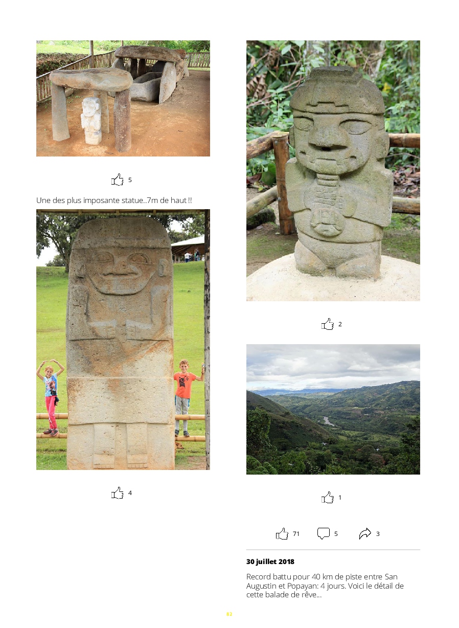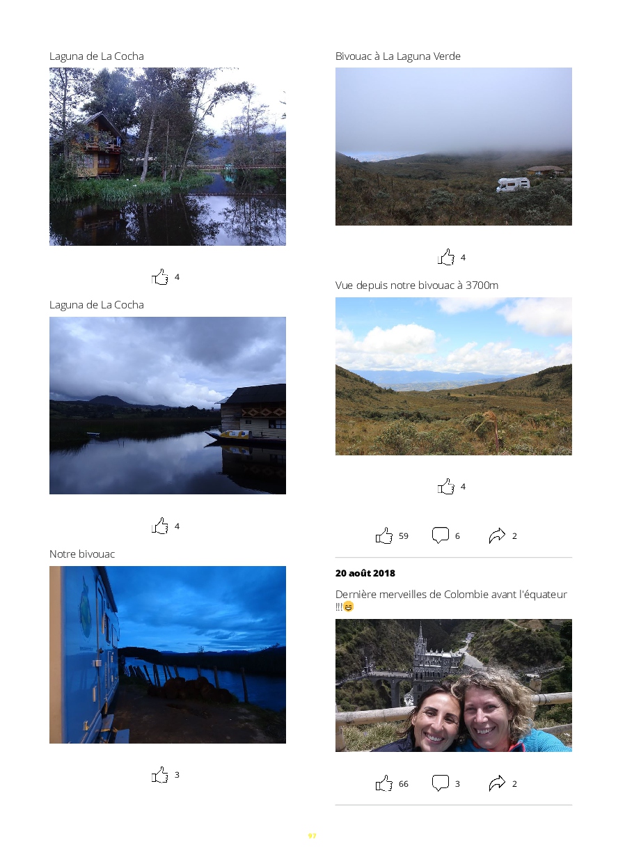 Arrivée en Amérique du sud par Carthagène des Indes. Découverte de la Colombie au fil des rencontres qui marqueront définitivement le cours de notre voyage. Jardin, Guatape, Silvia, Manizales et Lerma sont autant de noms de villes et villages qui résonnent dans nos coeurs, riches en paysages et rencontres innoubliables.