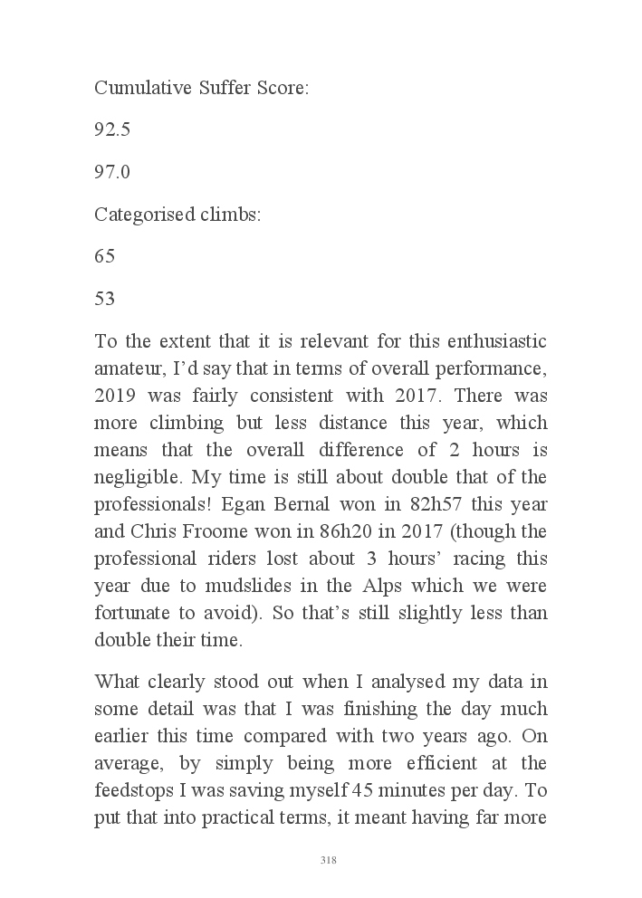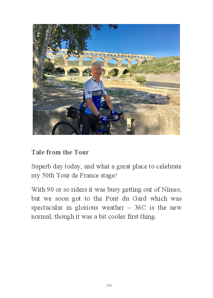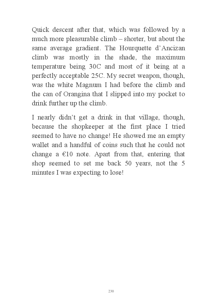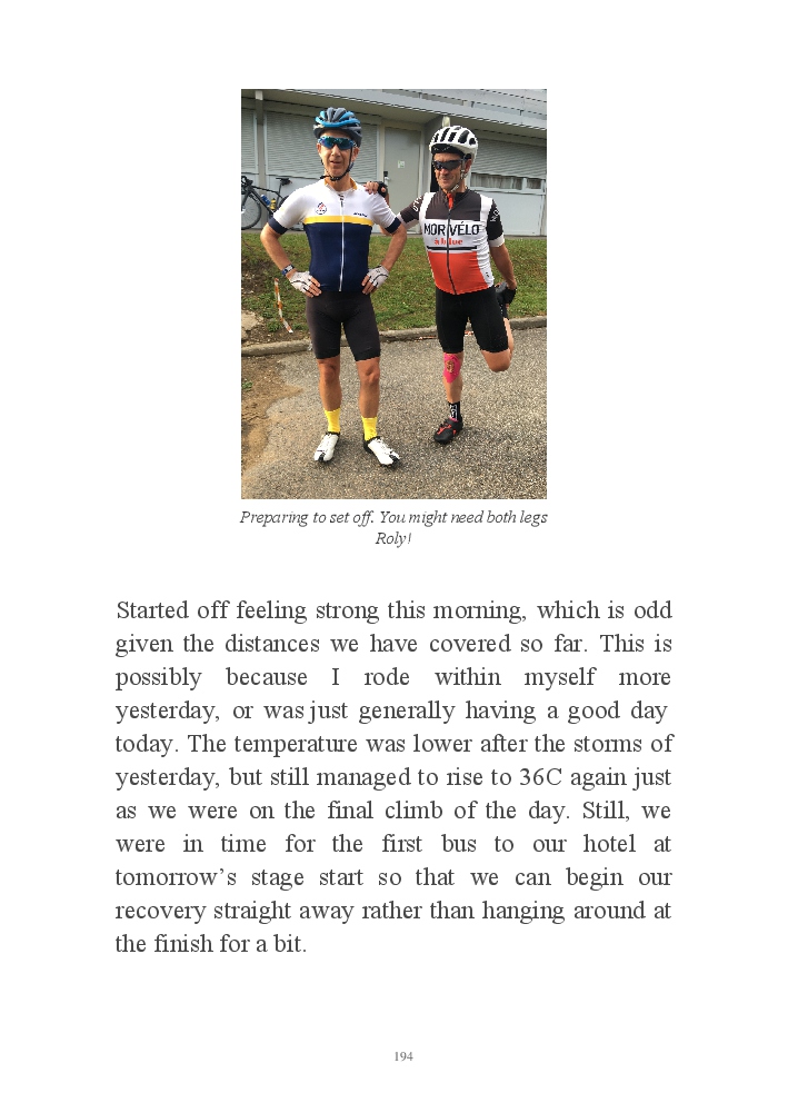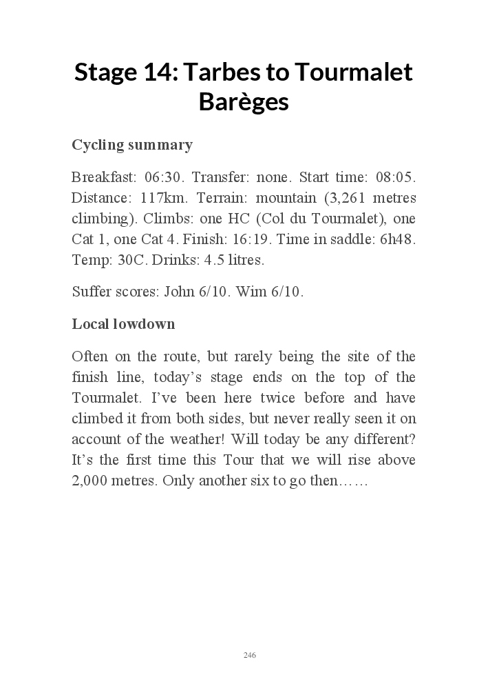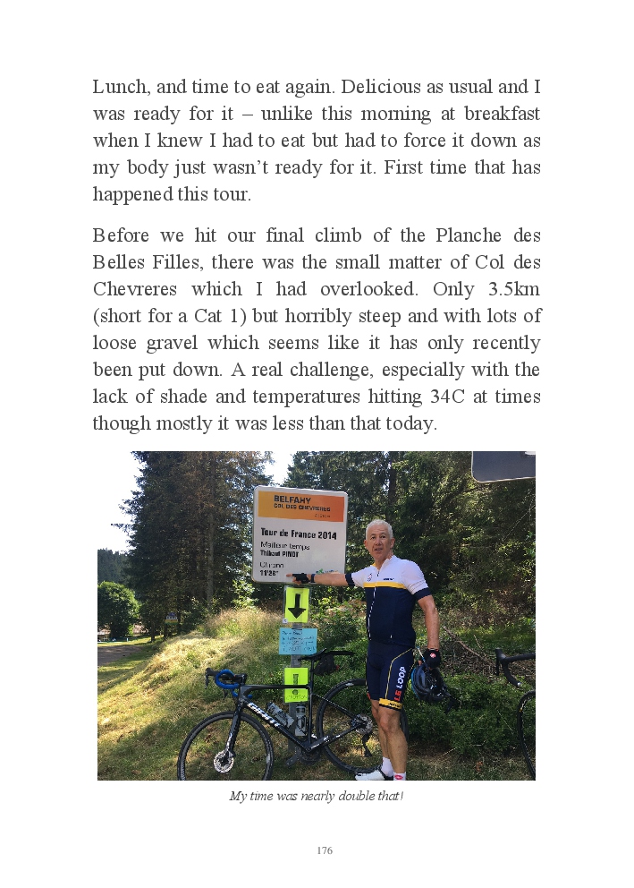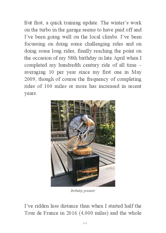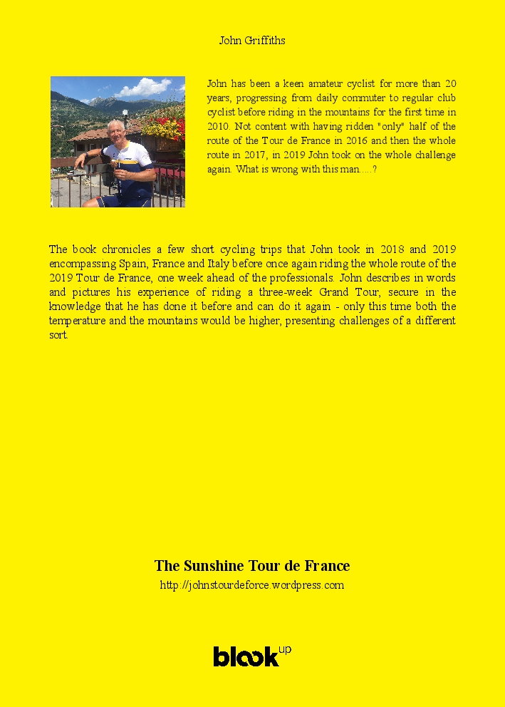 The book chronicles a few short cycling trips that John took in 2018 and 2019 encompassing Spain, France and Italy before once again riding the whole route of the 2019 Tour de France, one week ahead of the professionals. John describes in words and pictures his experience of riding a three-week Grand Tour, secure in the knowledge that he has done it before and can do it again - only this time both the temperature and the mountains would be higher, presenting challenges of a different sort.
