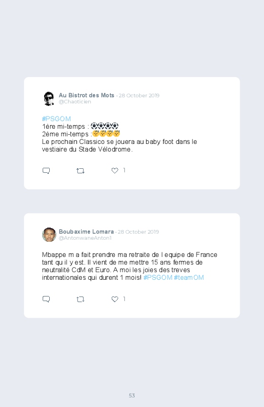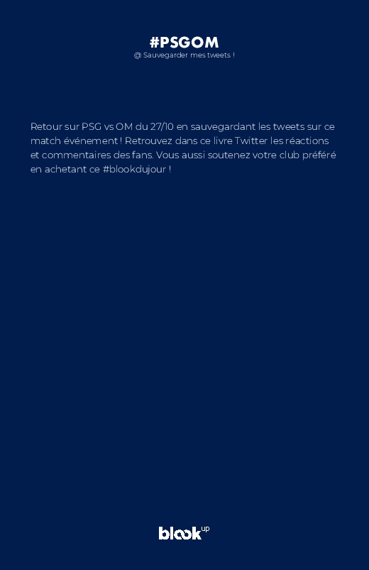 Retour sur PSG vs OM du 27/10 en sauvegardant les tweets sur ce match événement ! Retrouvez dans ce livre Twitter les réactions et commentaires des fans. Vous aussi soutenez votre club préféré en achetant ce #blookdujour !