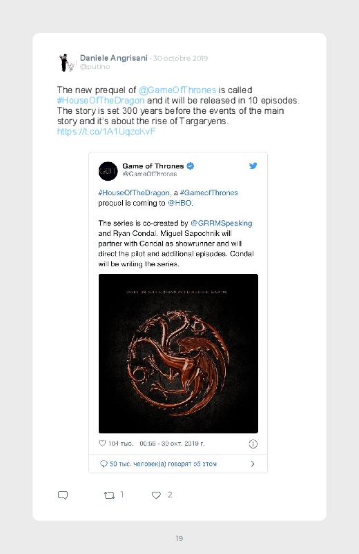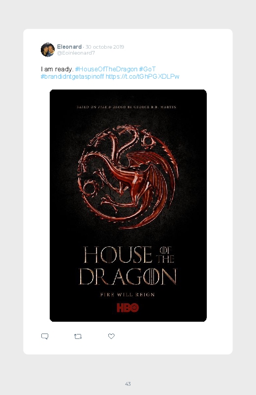 La célèbre série mondialement reconnue Game Of Thrones revient dans un prequel autour du personnage de Daenerys de quoi aider les fans à se remettre de la fin de la série ! Découvrez les premières réactions des internautes face à cette annonce dans ce livre Twitter. Vous aussi sauvegardez les tweets de votre film ou série préféré !