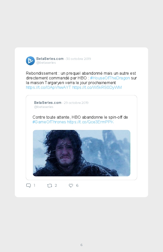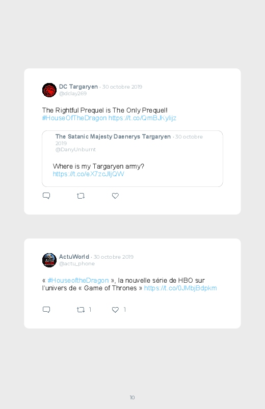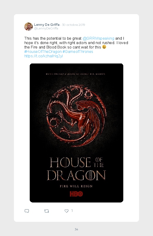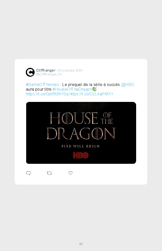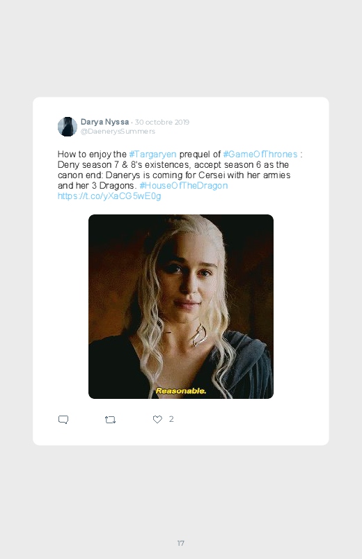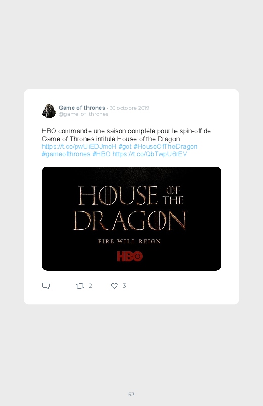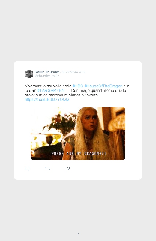 La célèbre série mondialement reconnue Game Of Thrones revient dans un prequel autour du personnage de Daenerys de quoi aider les fans à se remettre de la fin de la série ! Découvrez les premières réactions des internautes face à cette annonce dans ce livre Twitter. Vous aussi sauvegardez les tweets de votre film ou série préféré !