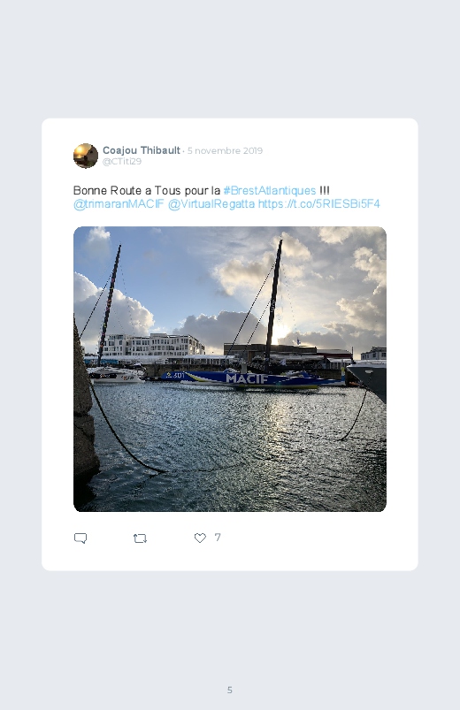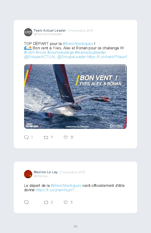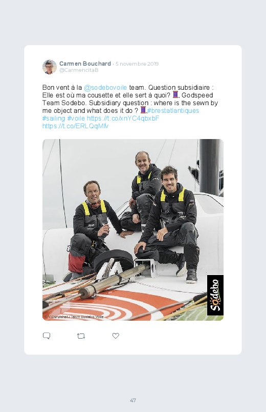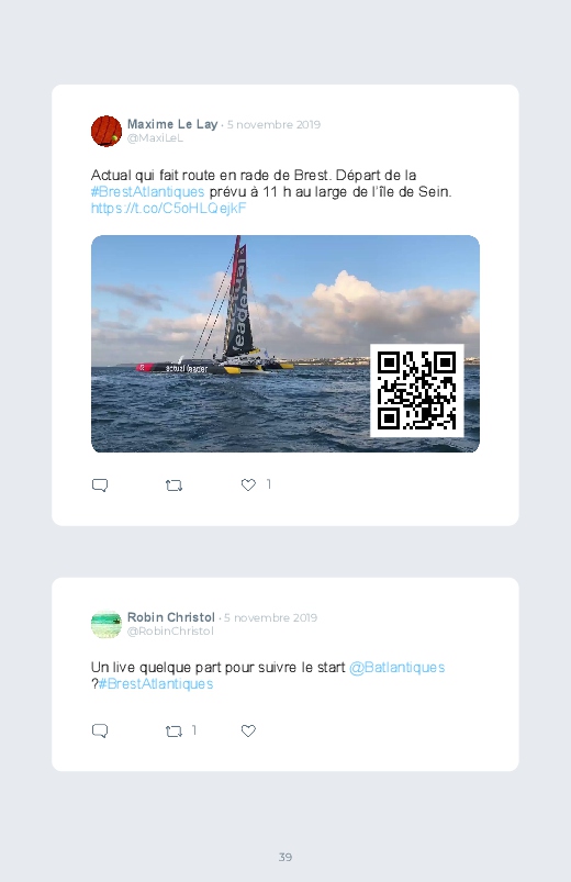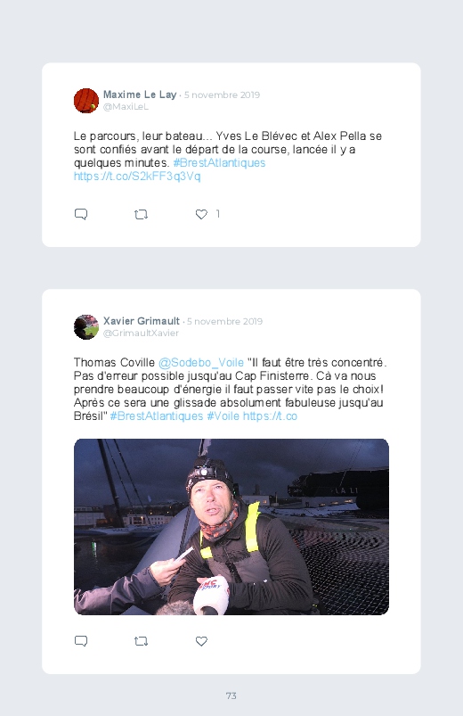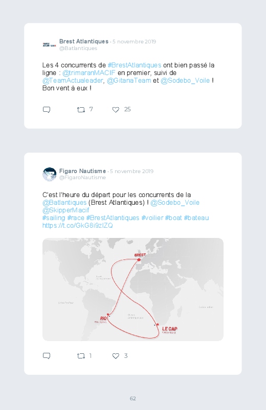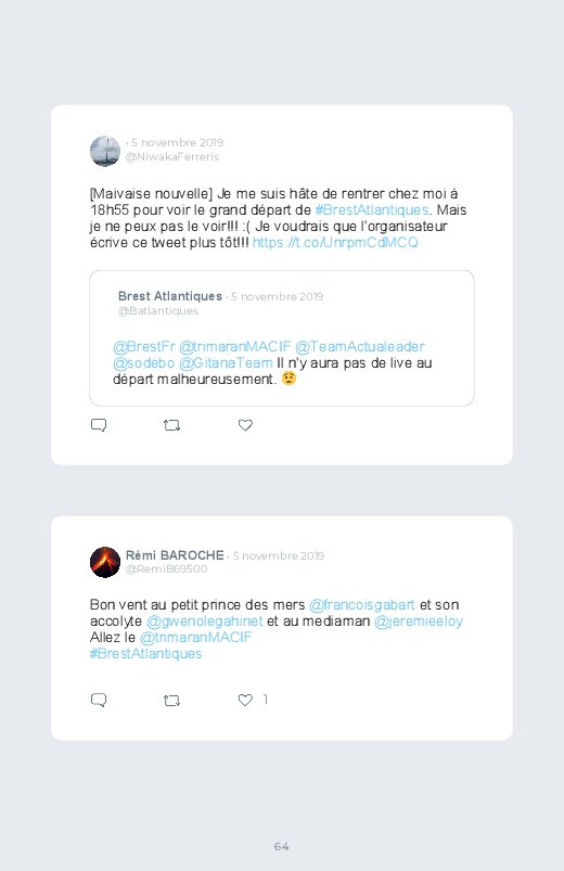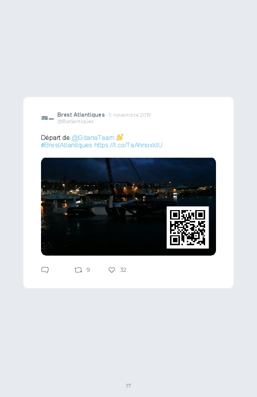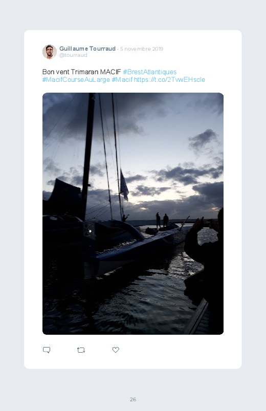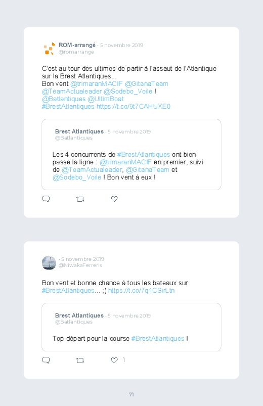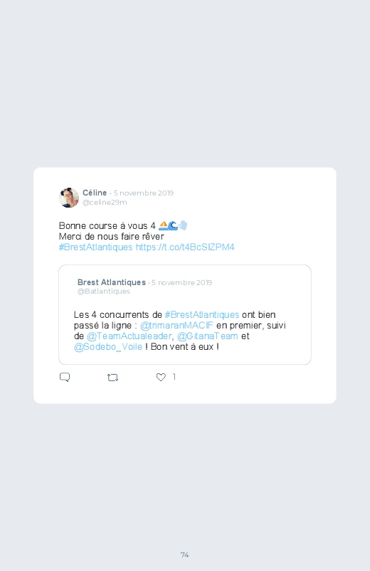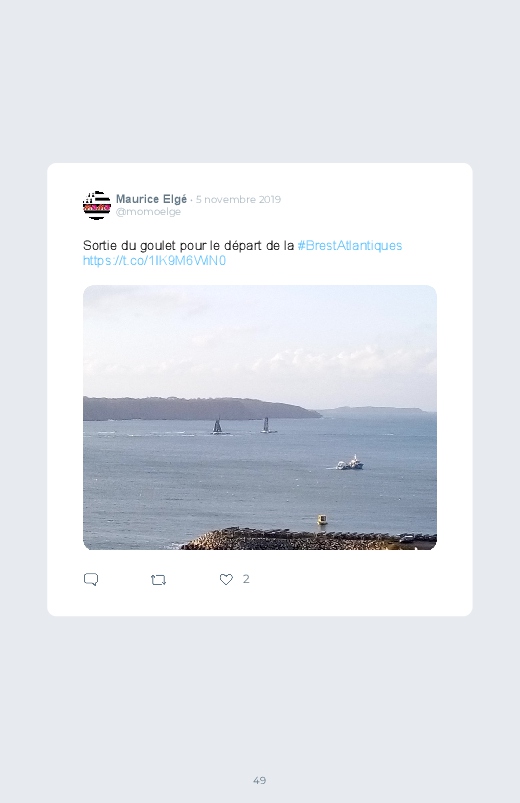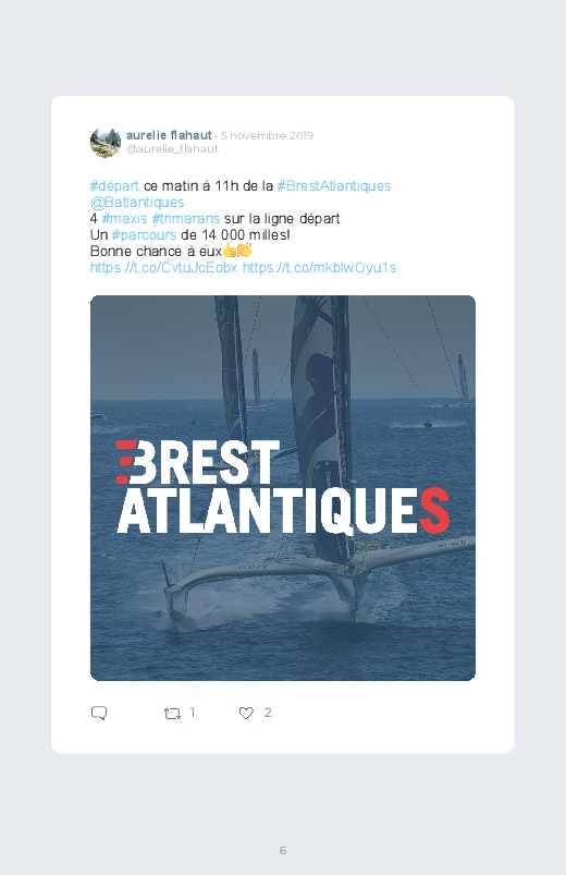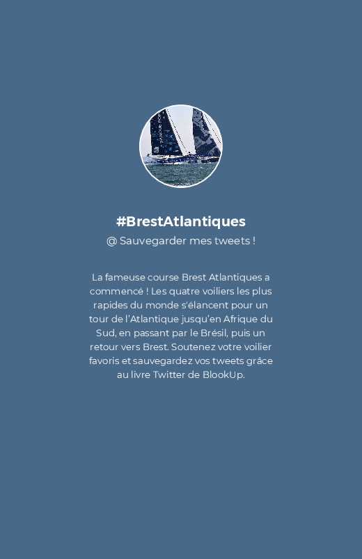 La fameuse course Brest Atlantiques a commencé ! Top départ ce mardi à 11h les quatre voiliers les plus rapides du monde à s’élancer pour un tour de l’Atlantique jusqu’en Afrique du Sud, en passant par le Brésil, puis un retour vers Brest. Soutenez votre voilier favoris et sauvegardez vos tweets grâce au livre Twitter de BlookUp.