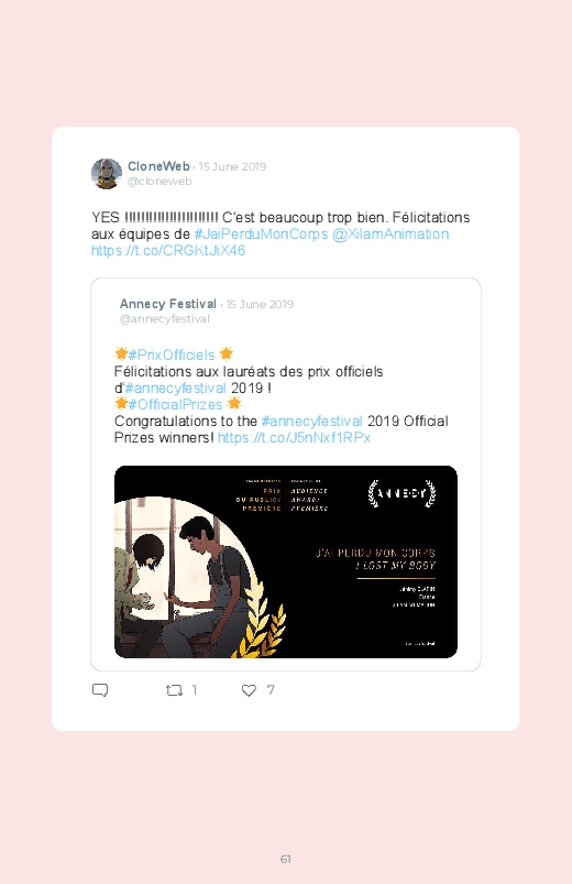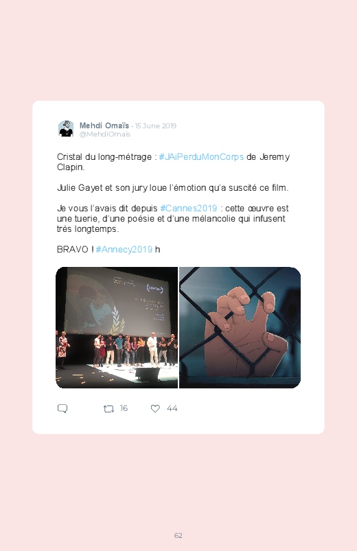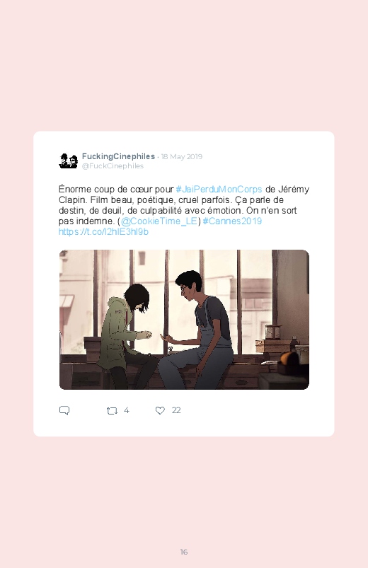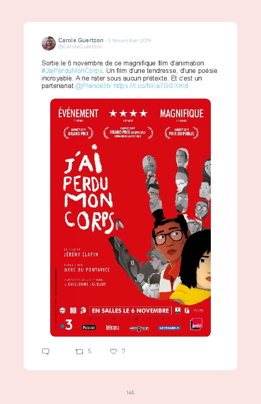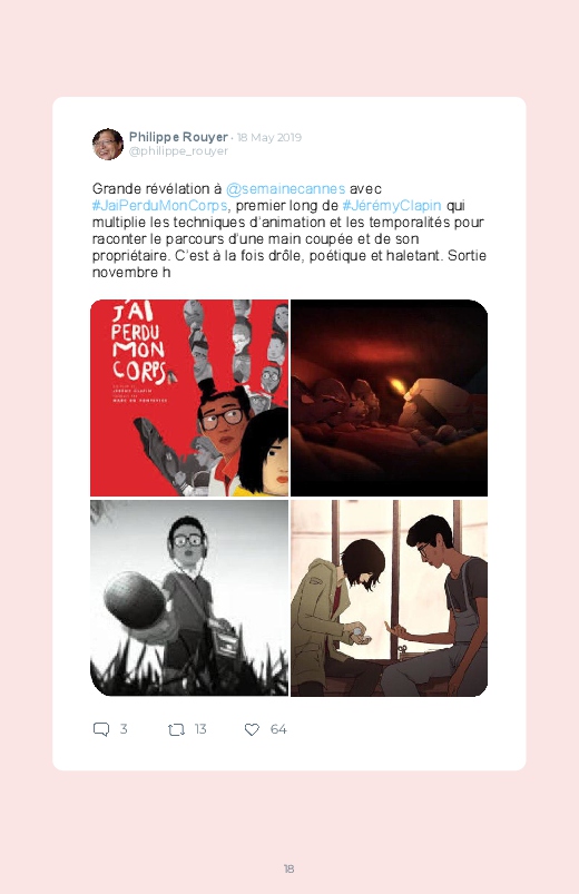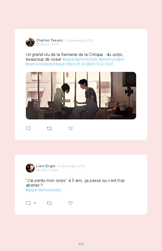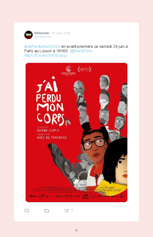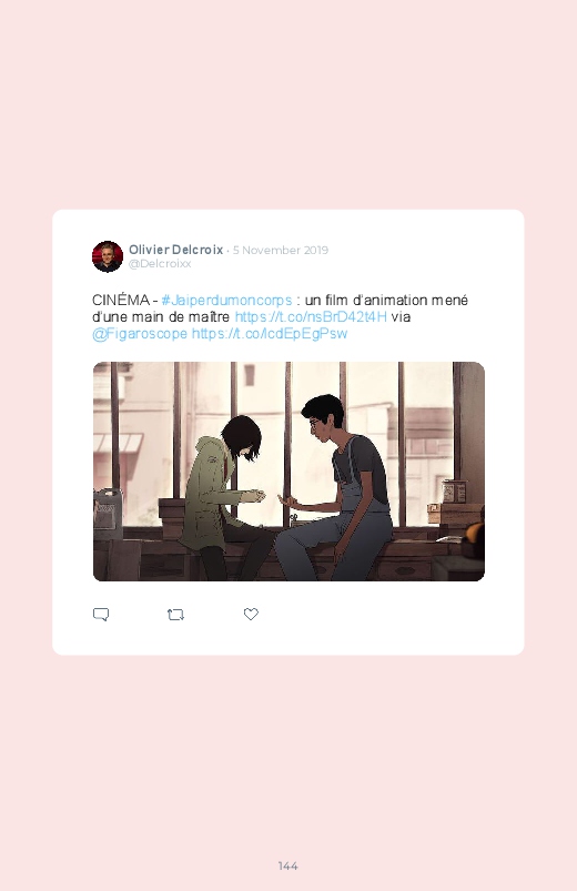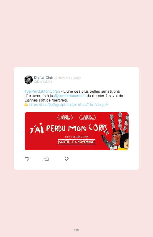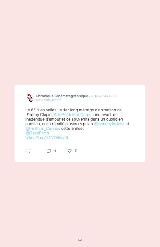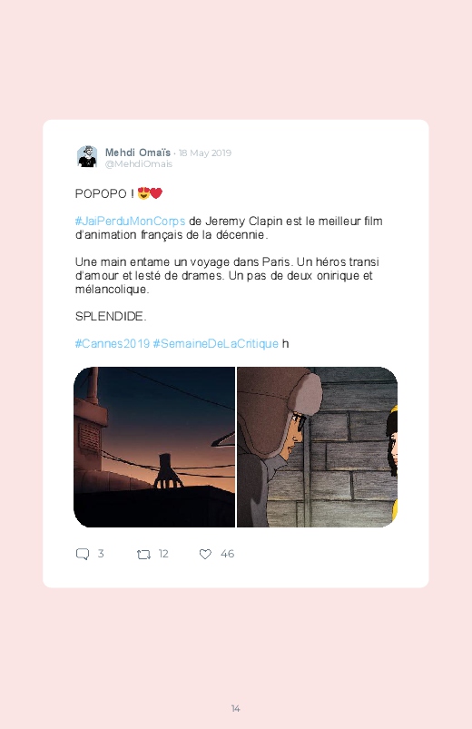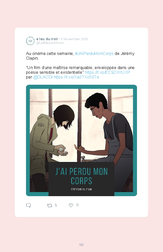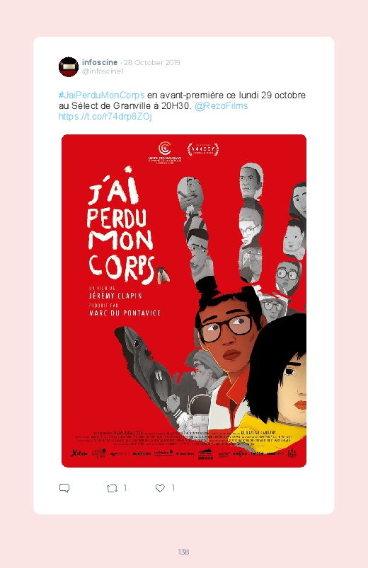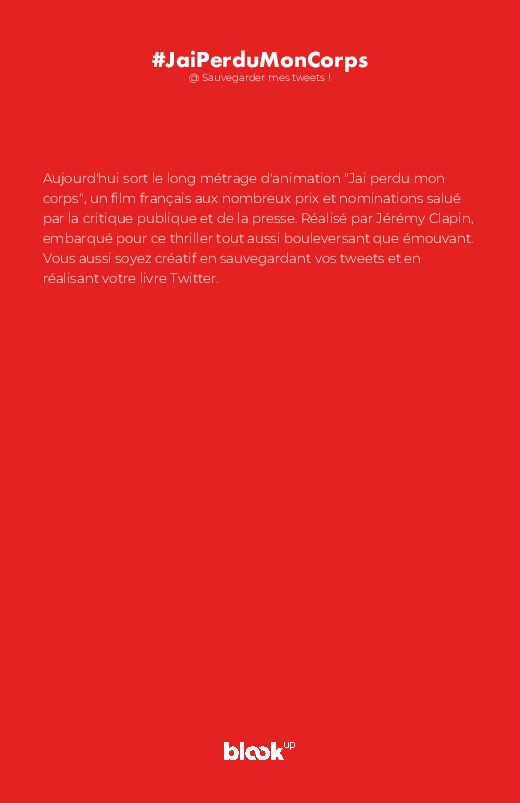 Aujourd'hui sort le long métrage d’animation "Jai perdu mon corps", un film français aux nombreux prix et nominations salué par la critique publique et de la presse. Réalisé par Jérémy Clapin, embarqué pour ce thriller tout aussi bouleversant que émouvant. Vous aussi soyez créatif en sauvegardant vos tweets et en réalisant votre livre Twitter.