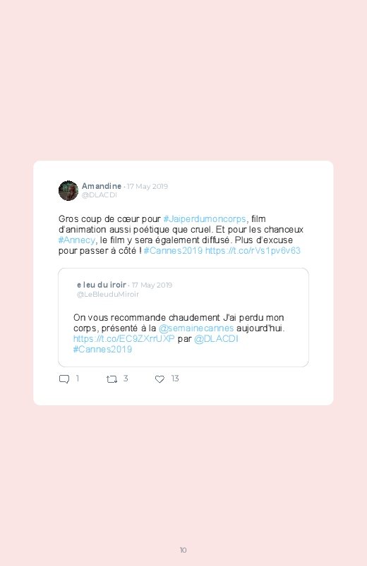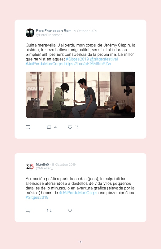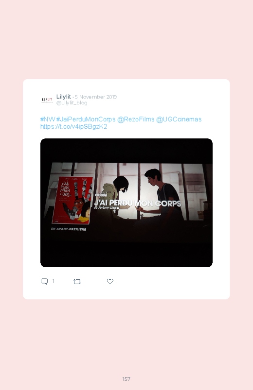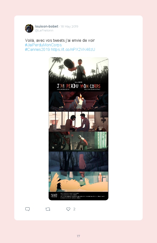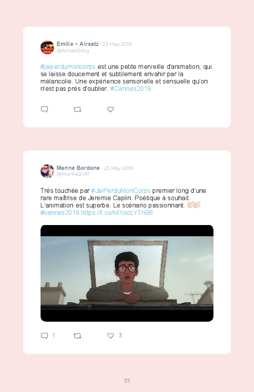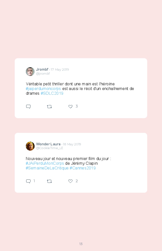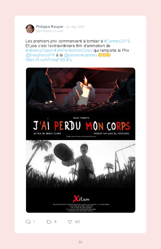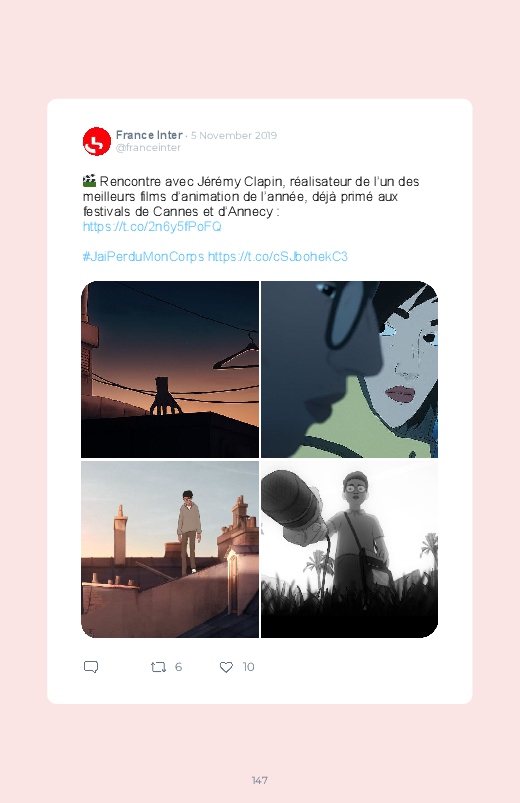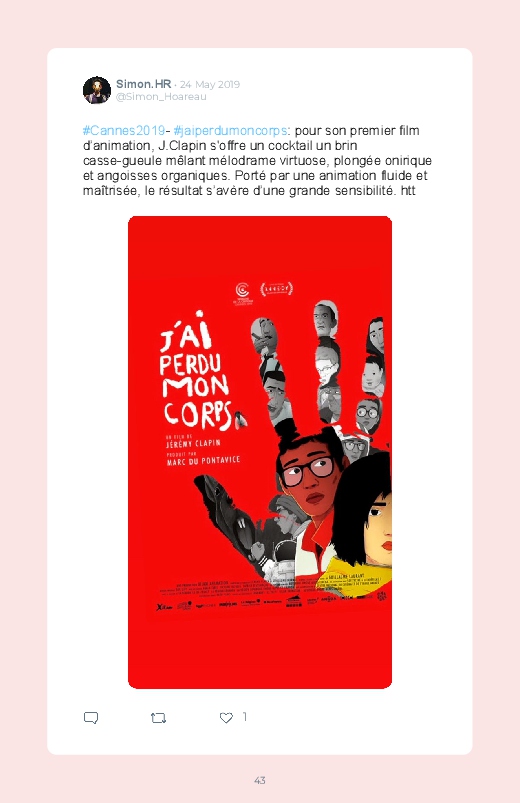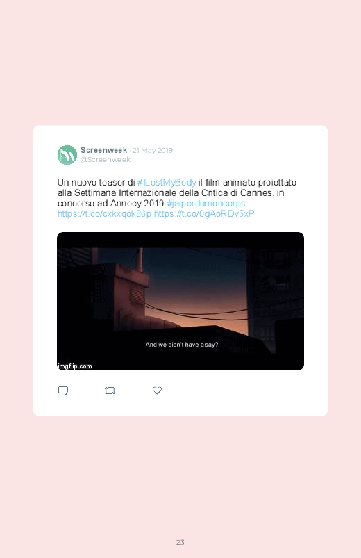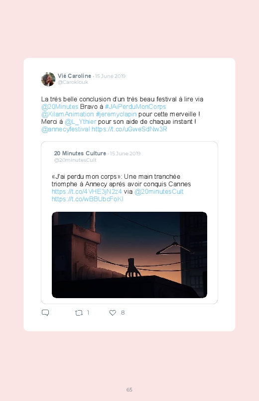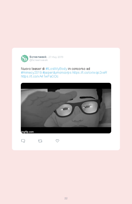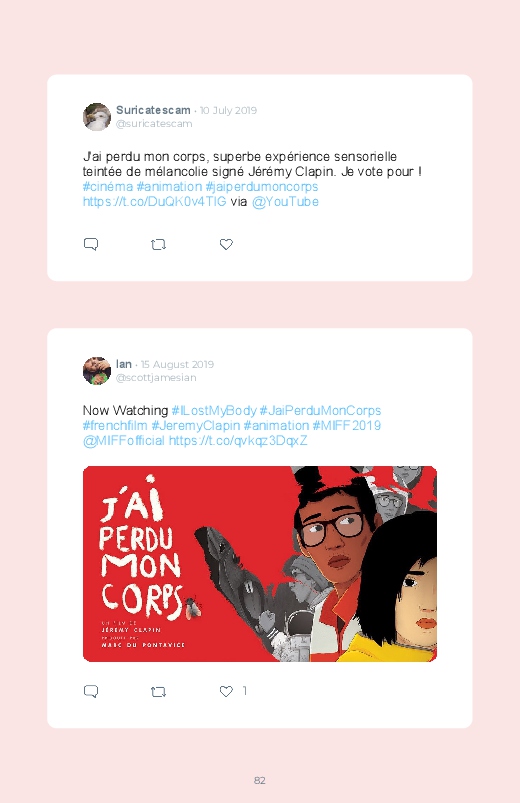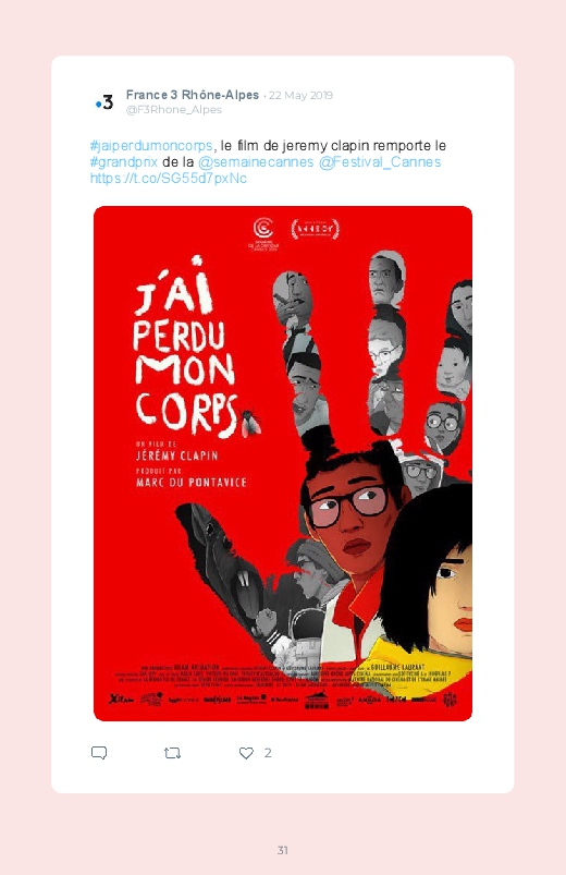 Aujourd'hui sort le long métrage d’animation "Jai perdu mon corps", un film français aux nombreux prix et nominations salué par la critique publique et de la presse. Réalisé par Jérémy Clapin, embarqué pour ce thriller tout aussi bouleversant que émouvant. Vous aussi soyez créatif en sauvegardant vos tweets et en réalisant votre livre Twitter.