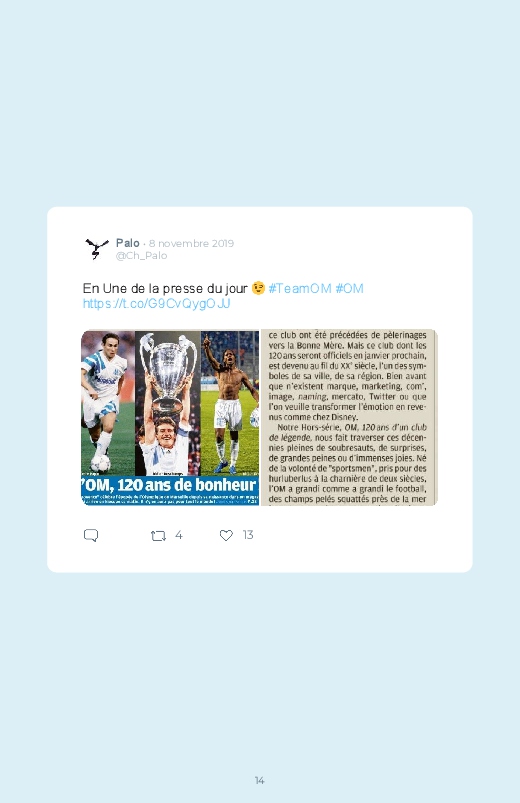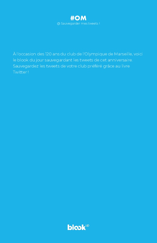À l'occasion des 120 ans du club de l'Olympique de Marseille, voici le blook du jour sauvegardant les tweets de cet anniversaire. Sauvegardez les tweets de votre club préféré grâce au livre Twitter !