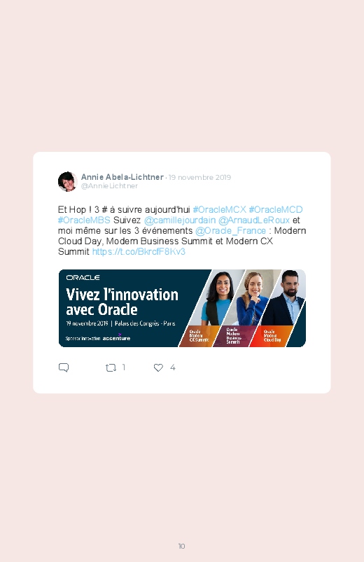 L'Oracle Modern Cloud Day, Un moment unique d’échanges avec les clients, influenceurs et experts passionnés par l’expérience client. Découvrez dans ce livre Twitter les temps forts de l’événement pour l’innovation et optimiser l’engagement client autant que l’expérience de marque !