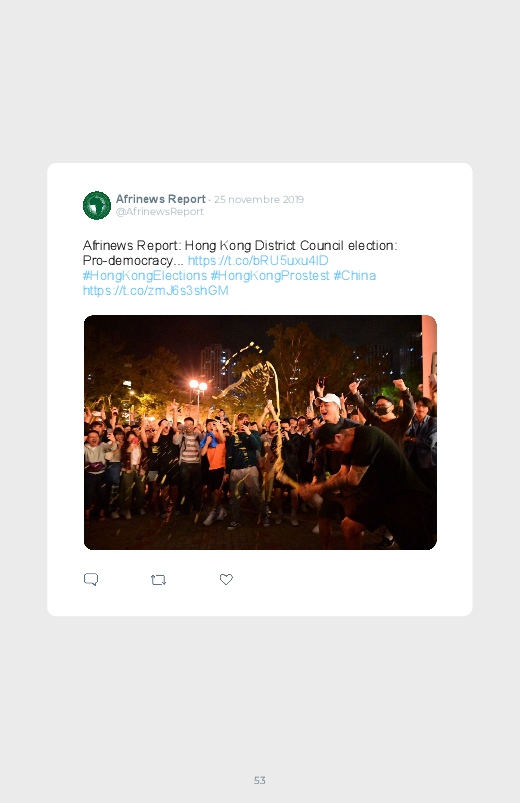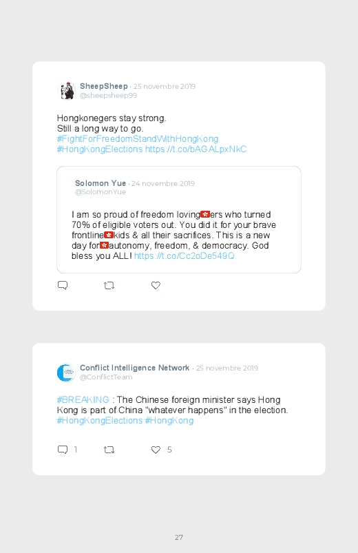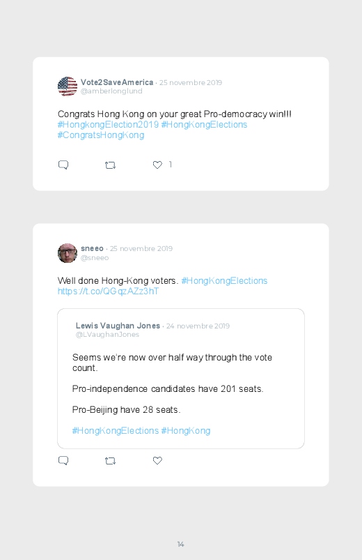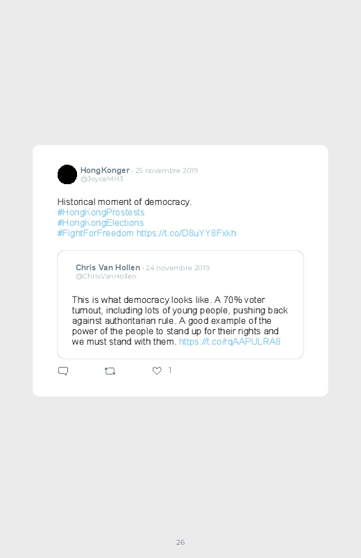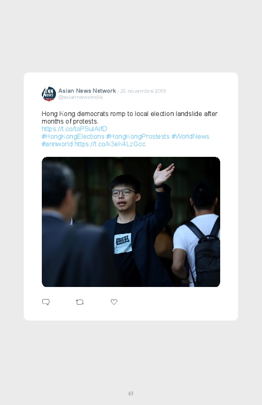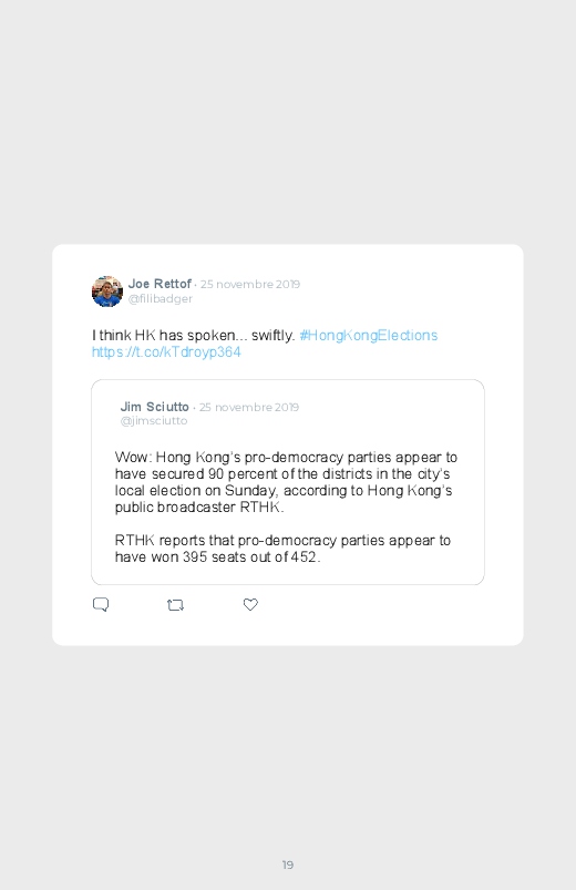 Victoire écrasante des pro- démocratie aux élections locales d'Hong-Kong. Ils remportent trois quarts des 452 sièges en jeu dans les 18 conseils de district. Un résultat qui n'a fait que rappeler le conflit entre Pékin et Hong Kong, un climat de tension présent depuis plus de 6 mois.