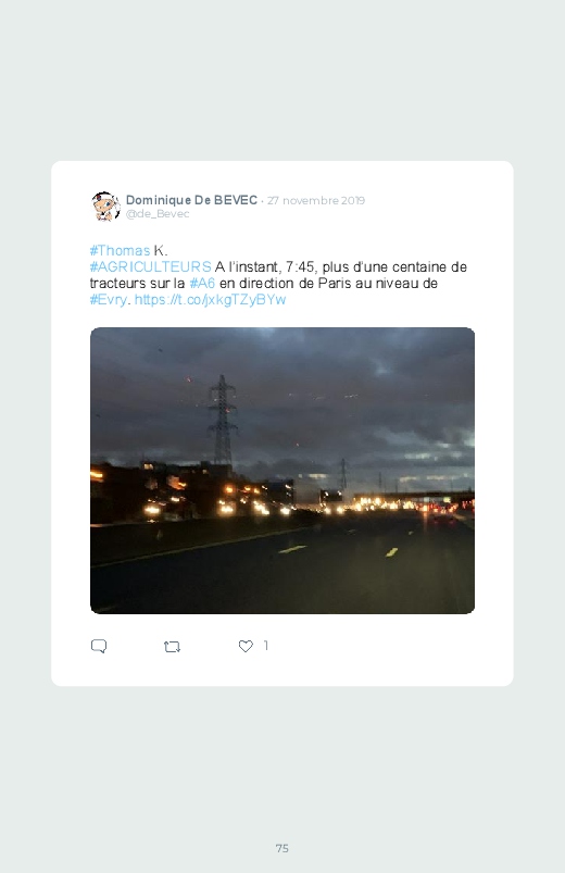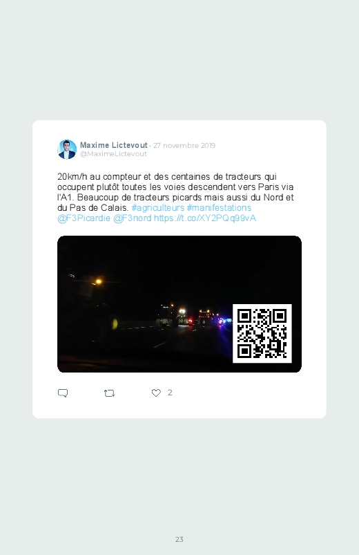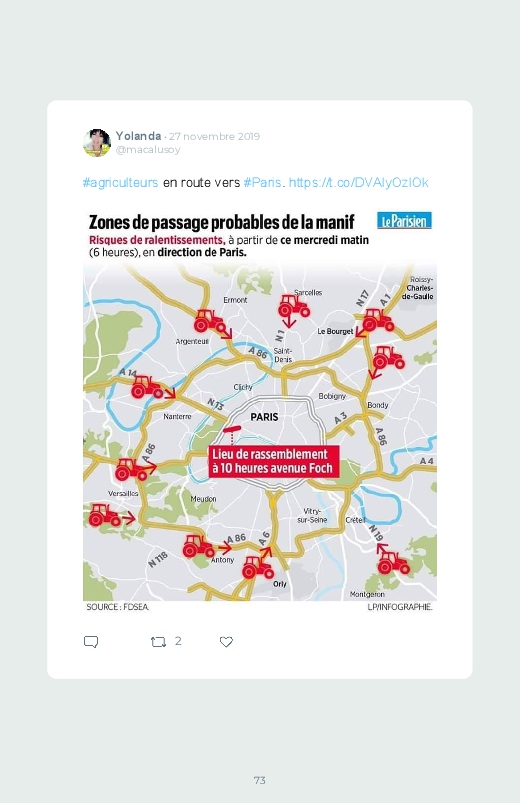 Sauvegardez l'actualité du jour dans un livre Twitter ! Aujourd'hui les agriculteurs sont en colère et manifestent avec leur tracteurs sur les routes de Paris. Plus d’un millier d’agriculteurs sont mobilisés pour l'opération et bloquent la ville à coup de revendication !