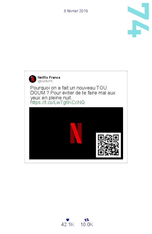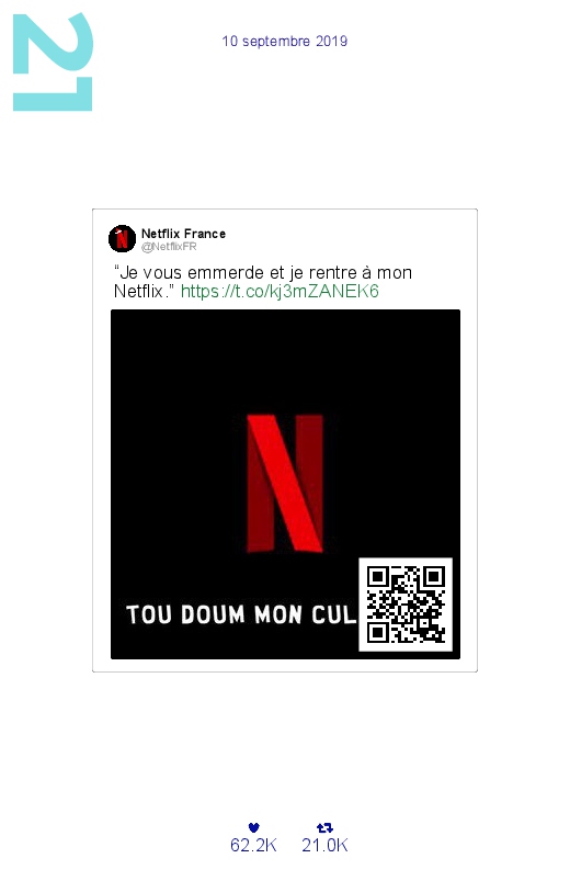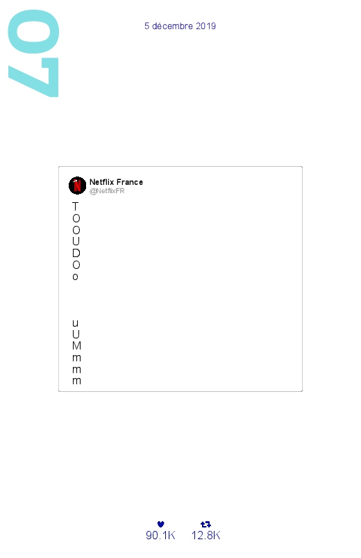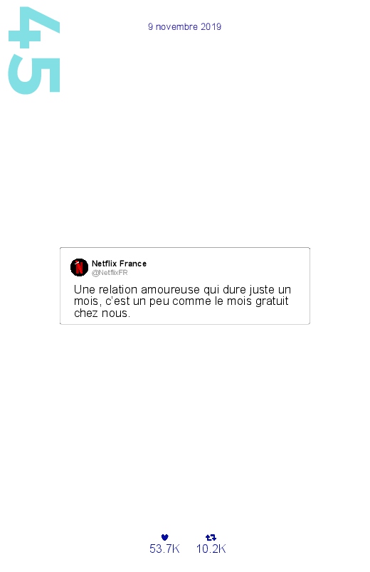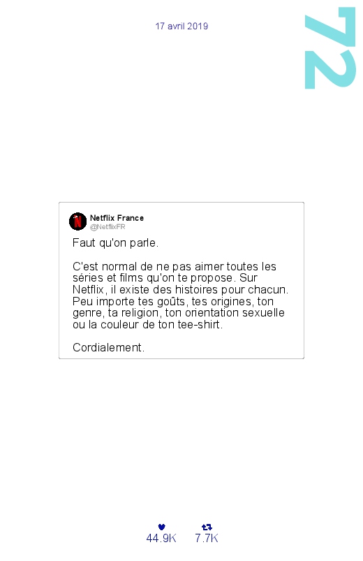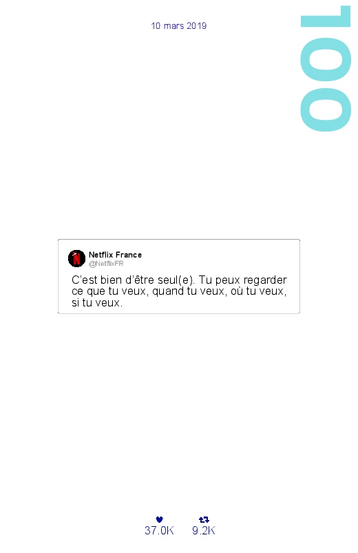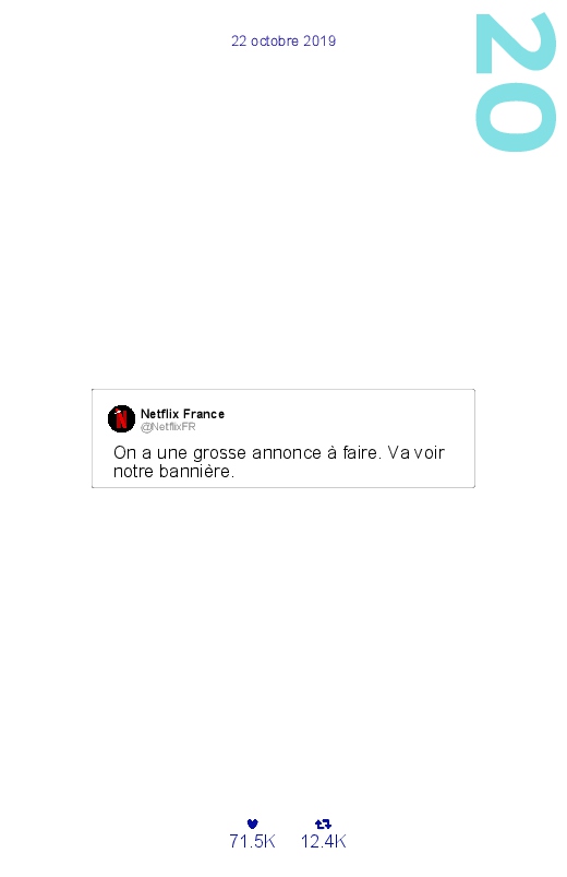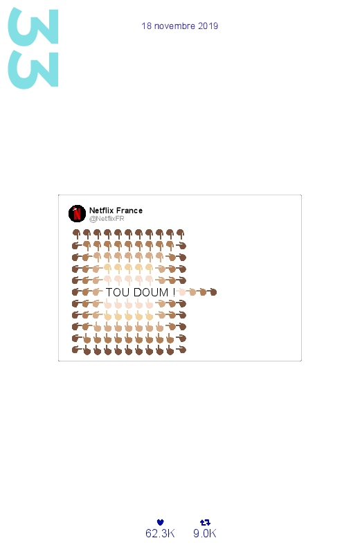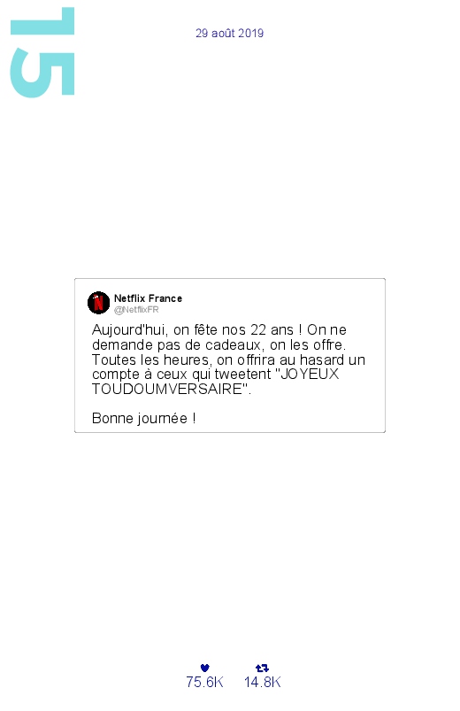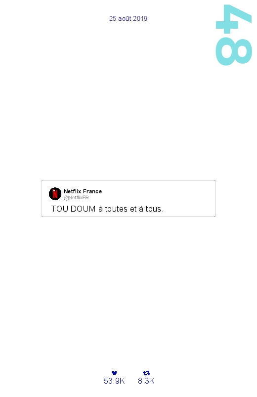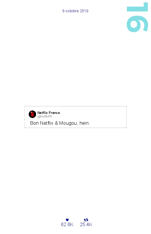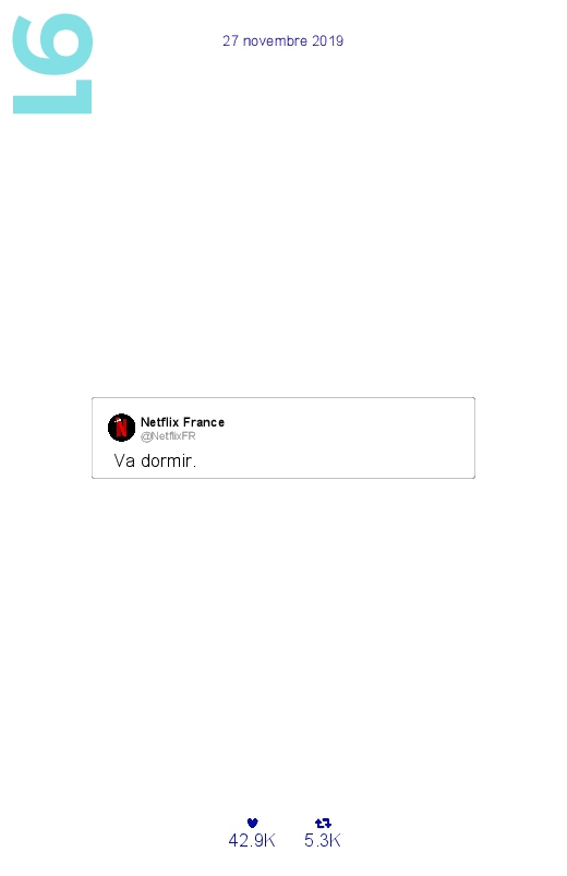 Netflix France a récemment été promu le compte Twitter le plus mentionné de France de l'année 2019 ! On les félicite (avec un peu de jalousie aussi 🤫) et on leur offre le fameux livre de leur Top 100 tweets de l'année 2019 ! TOU DOUM !