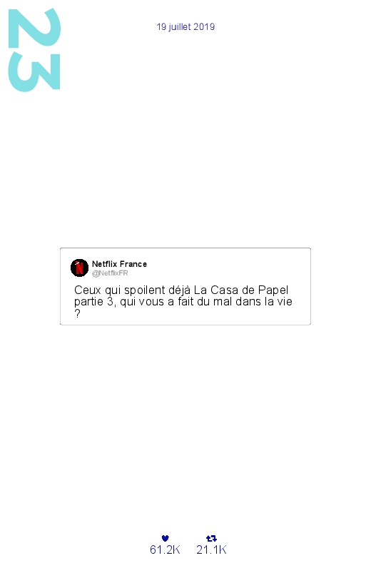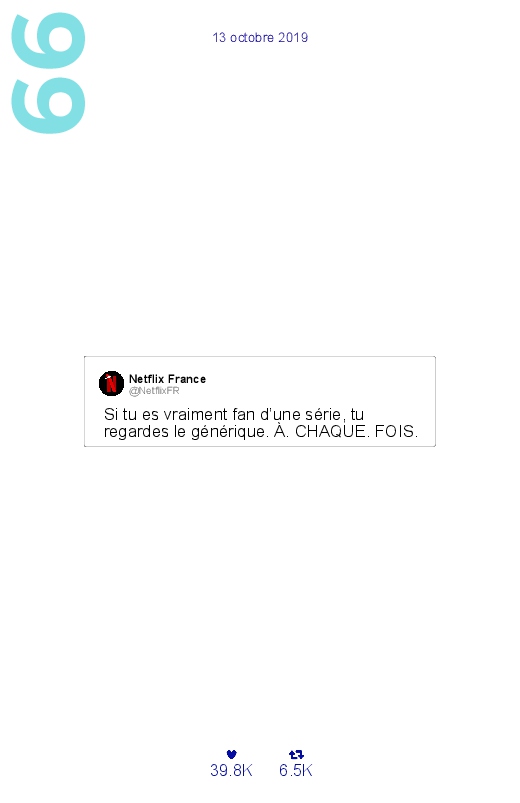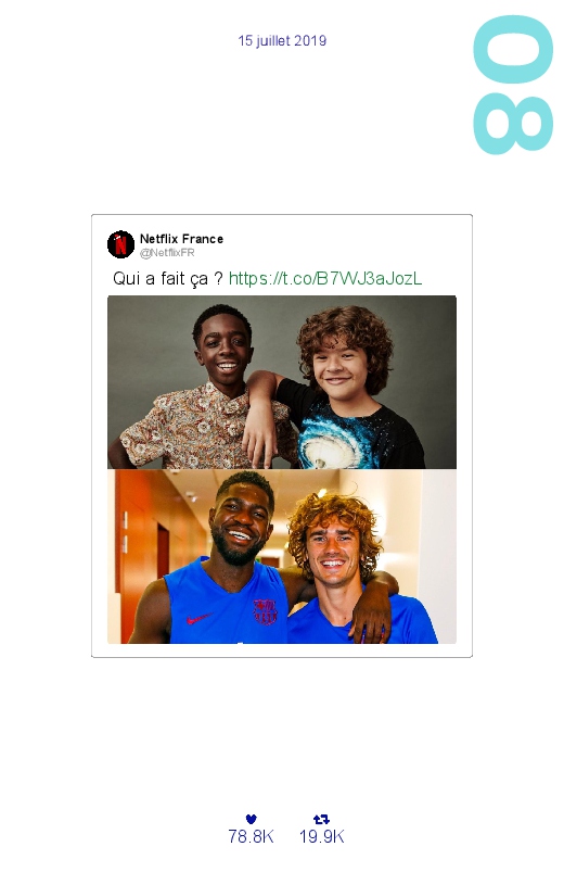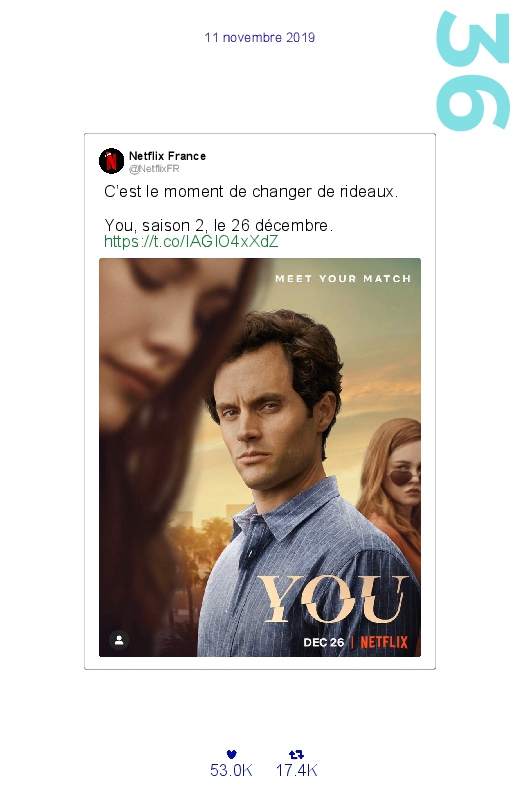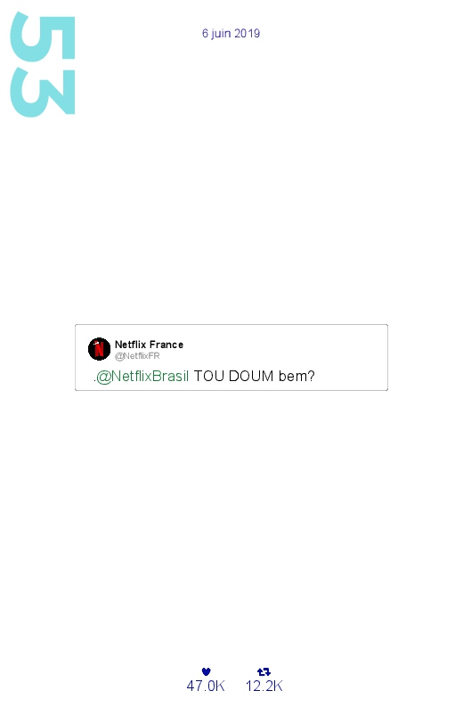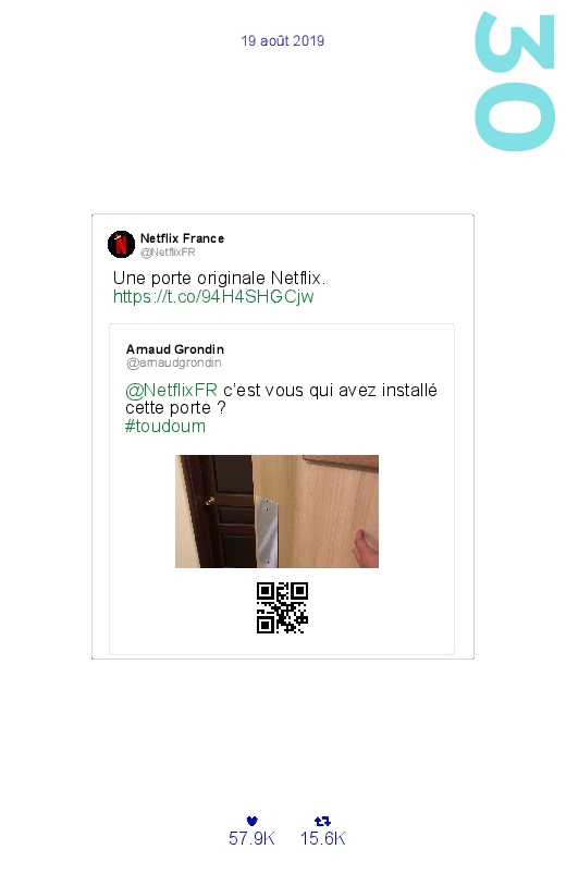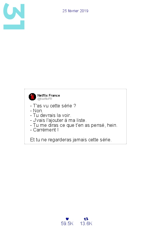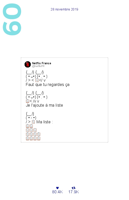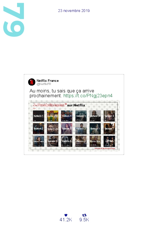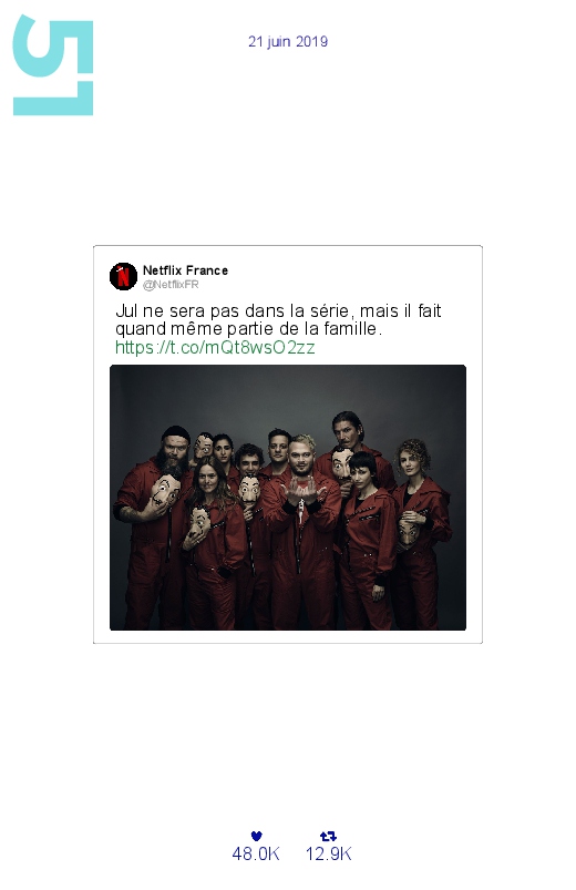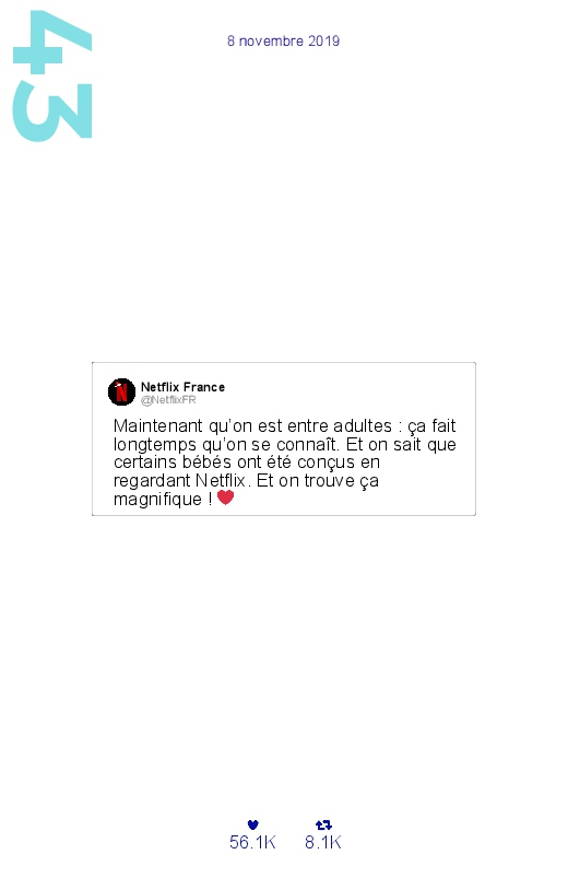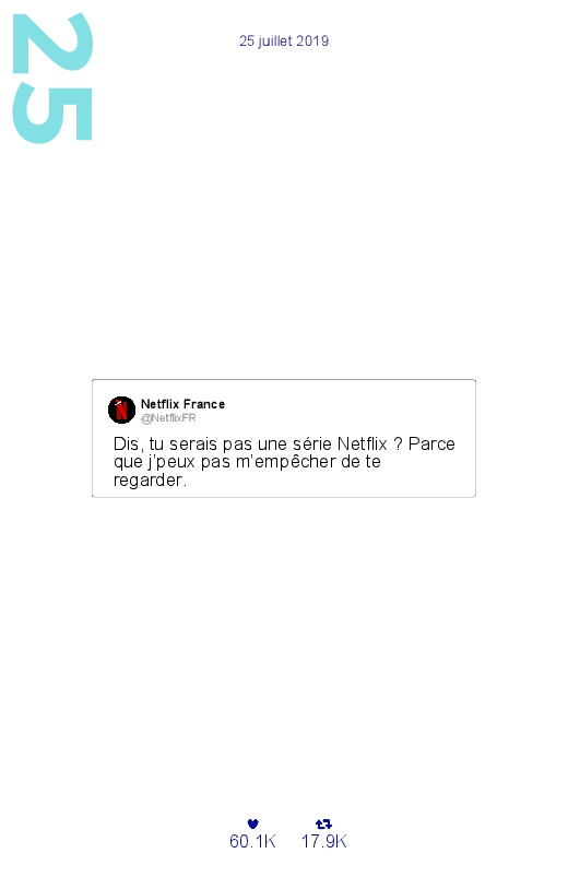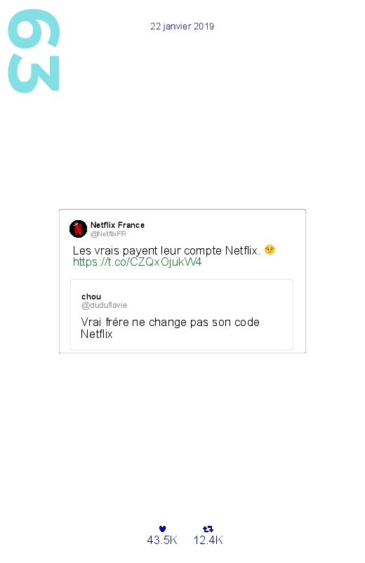 Netflix France a récemment été promu le compte Twitter le plus mentionné de France de l'année 2019 ! On les félicite (avec un peu de jalousie aussi 🤫) et on leur offre le fameux livre de leur Top 100 tweets de l'année 2019 ! TOU DOUM !