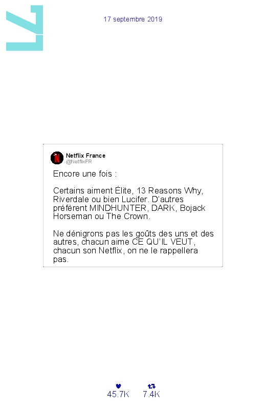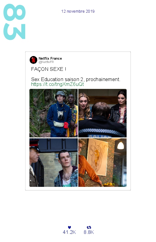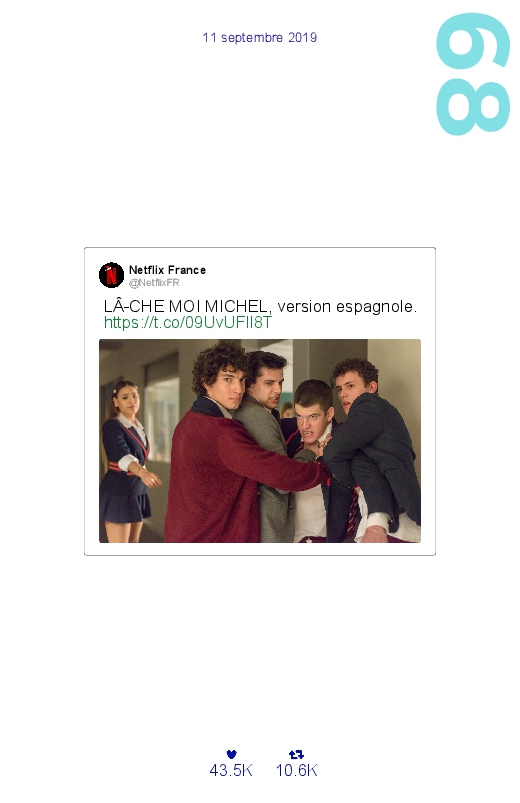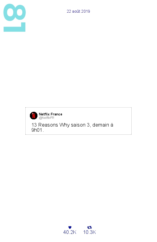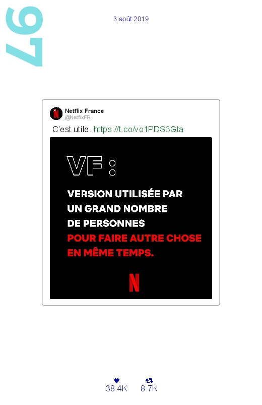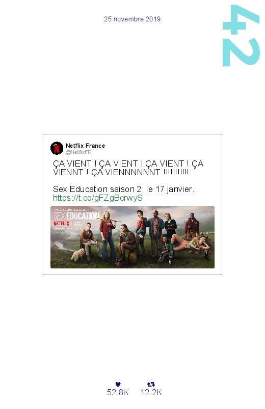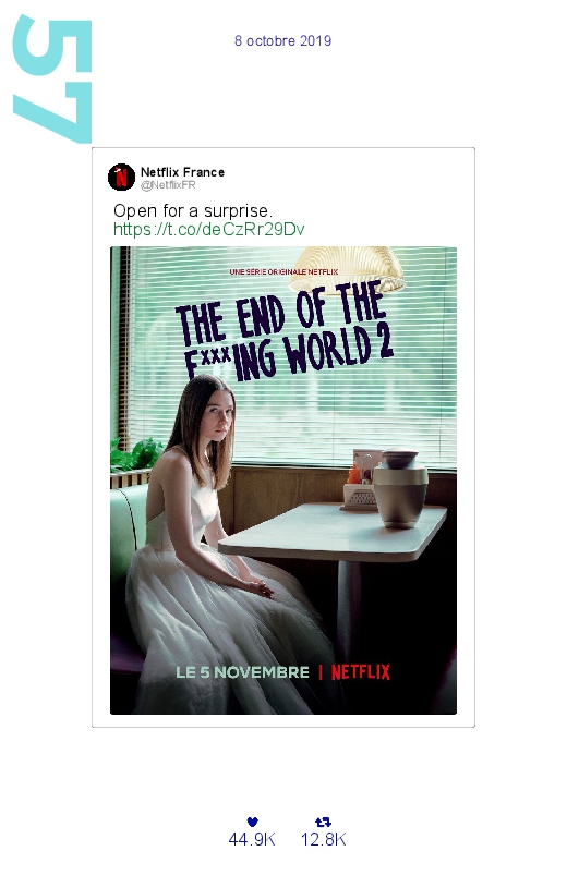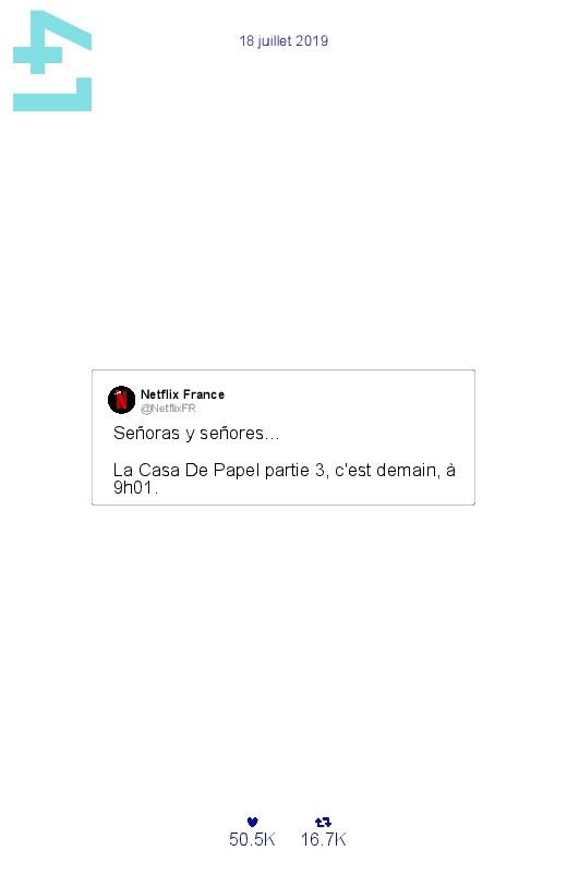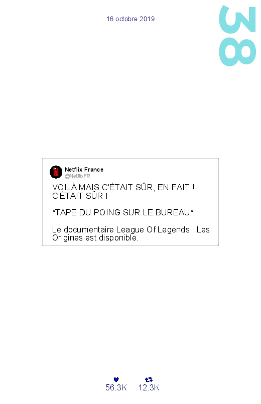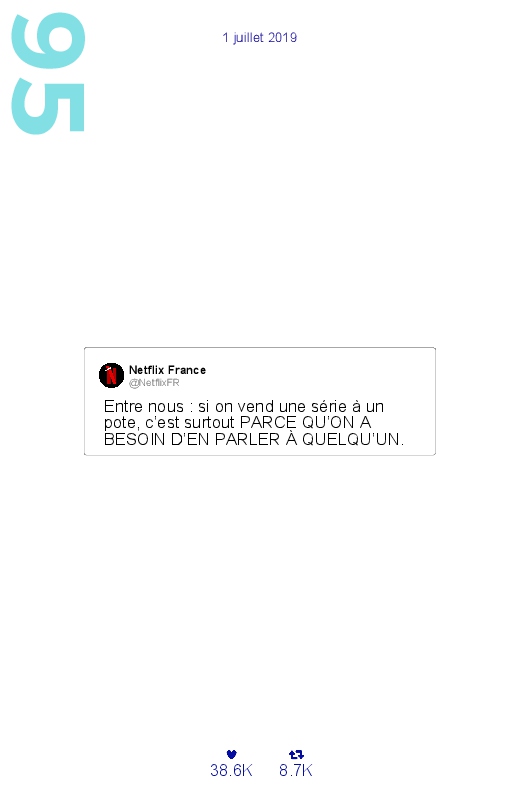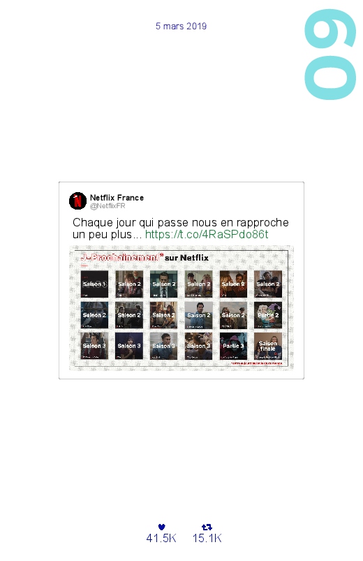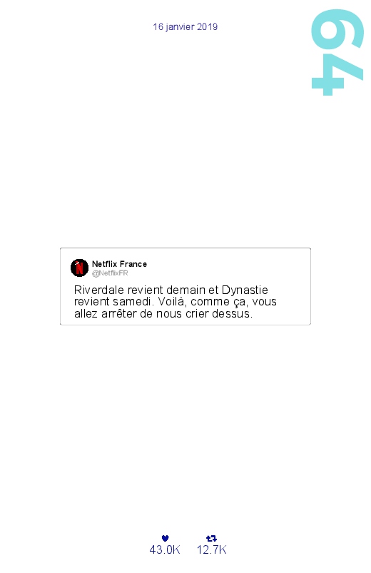 Netflix France a récemment été promu le compte Twitter le plus mentionné de France de l'année 2019 ! On les félicite (avec un peu de jalousie aussi 🤫) et on leur offre le fameux livre de leur Top 100 tweets de l'année 2019 ! TOU DOUM !