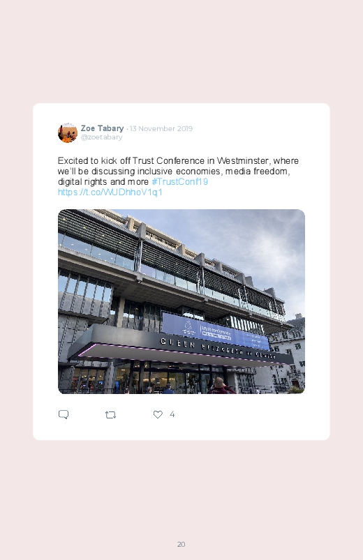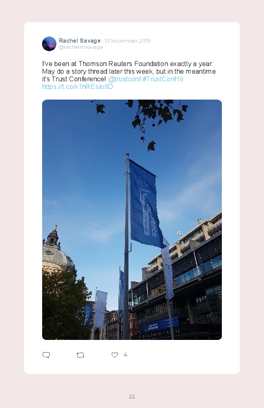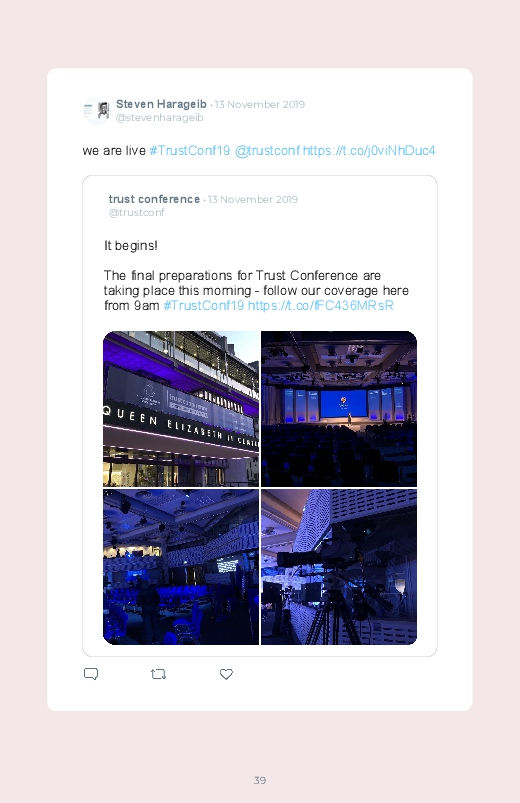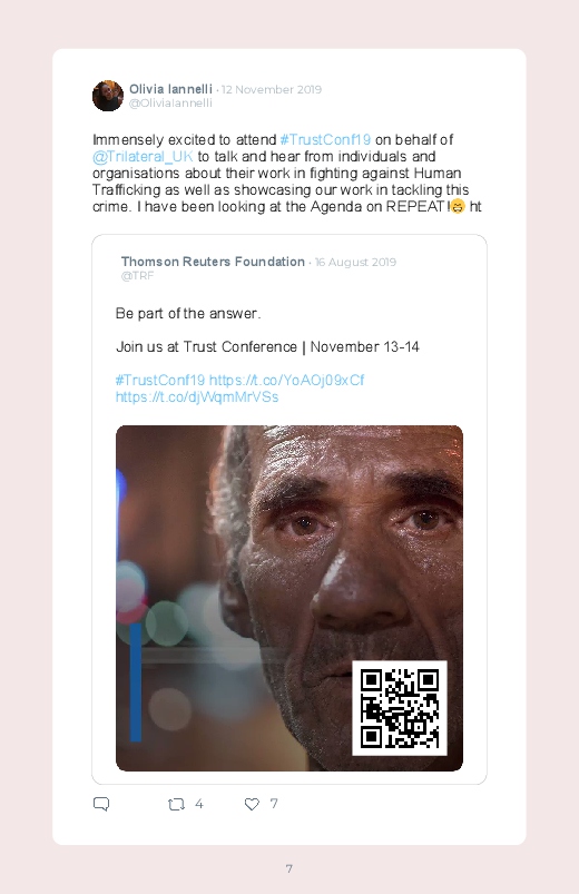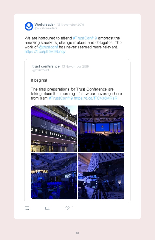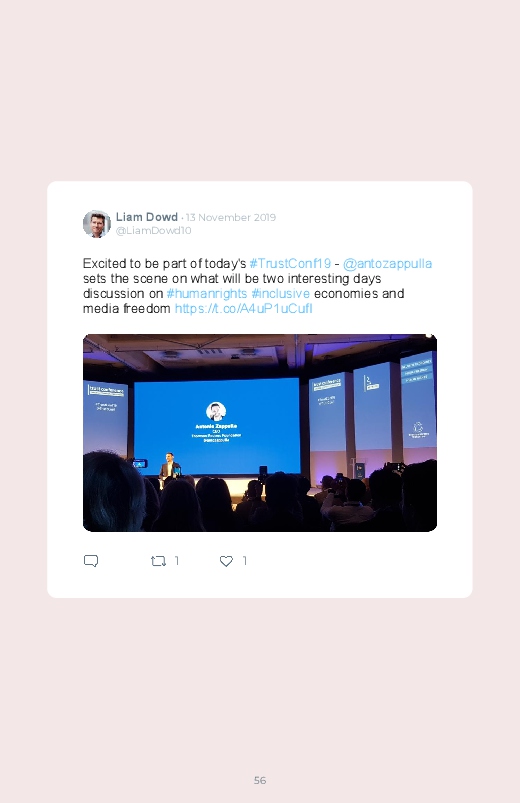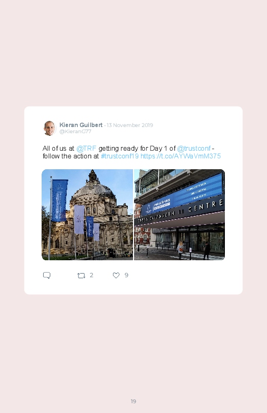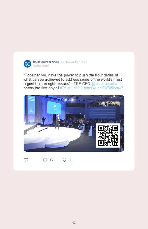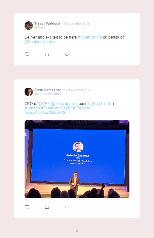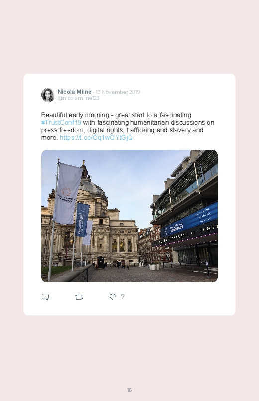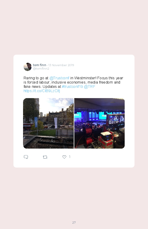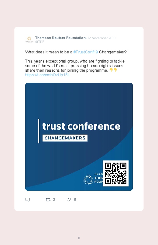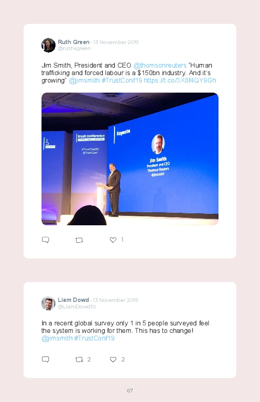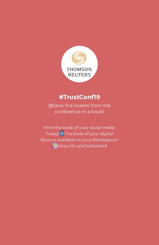 Save the tweets around the #Trust conf19 event in a Twitter book ! You also have the possibility to Print it afterward "Trust Conference is the Thomson Reuters Foundation’s flagship annual event and a world-leading human rights forum. Held in the heart of London each year, the conference brings together some 600 delegates from diverse sectors representing more than 60 countries."