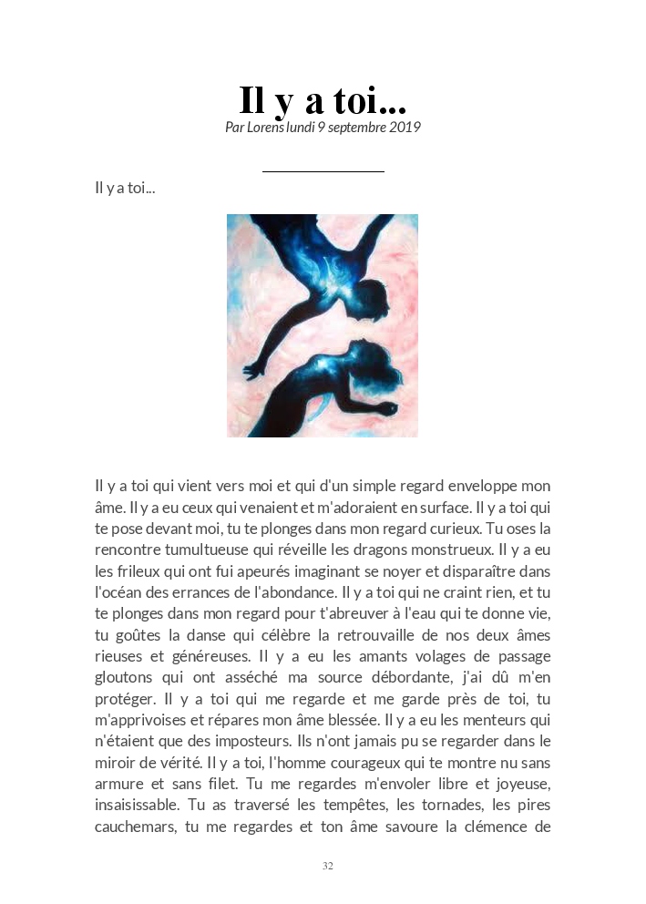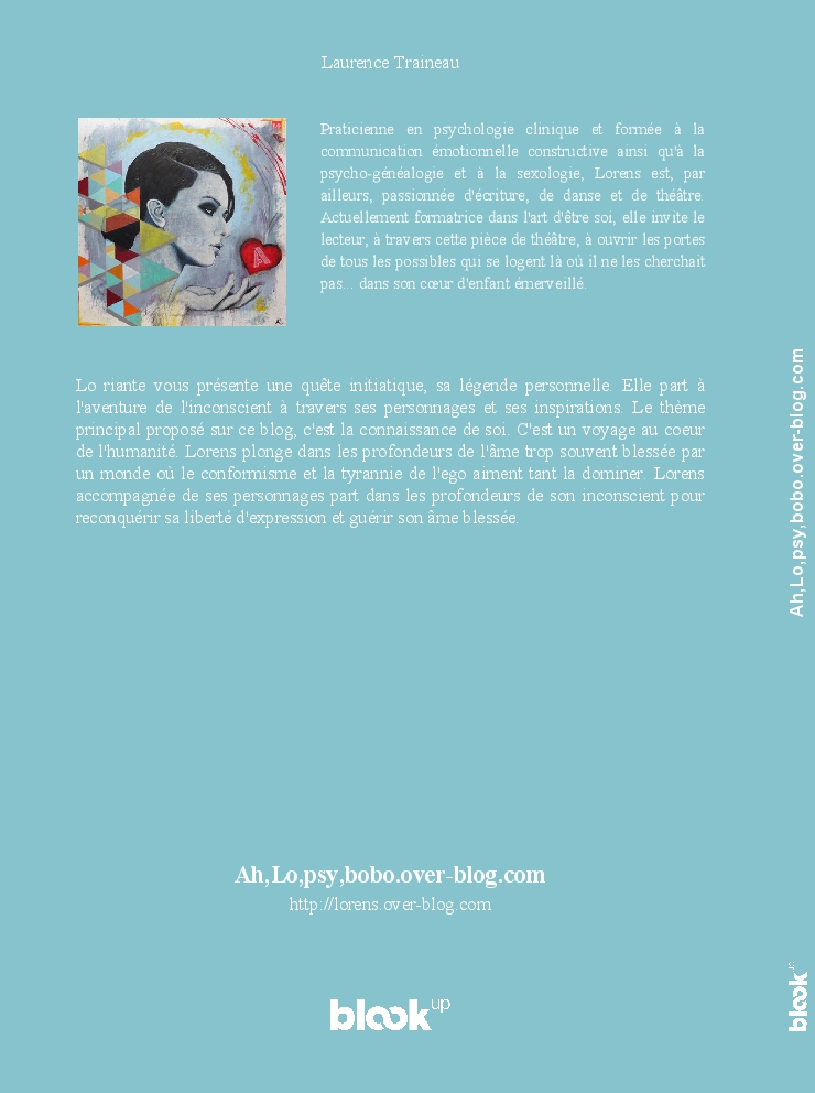 Lo riante vous présente une quête initiatique, sa légende personnelle. Elle part à l'aventure de l'inconscient à travers ses personnages et ses inspirations. Le thème principal proposé sur ce blog, c'est la connaissance de soi. C'est un voyage au coeur de l'humanité. Lorens plonge dans les profondeurs de l'âme trop souvent blessée par un monde où le conformisme et la tyrannie de l'ego aiment tant la dominer. Lorens accompagnée de ses personnages part dans les profondeurs de son inconscient pour reconquérir sa liberté d'expression et guérir son âme blessée.