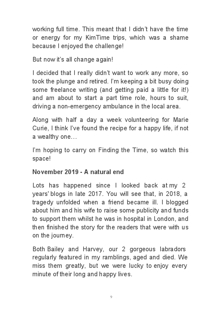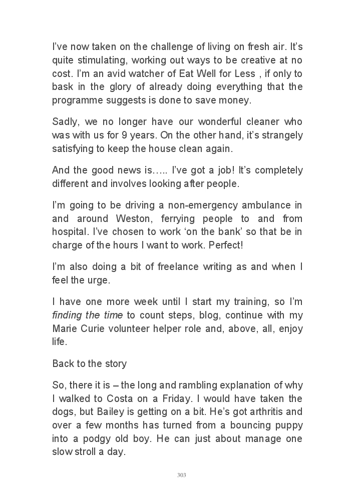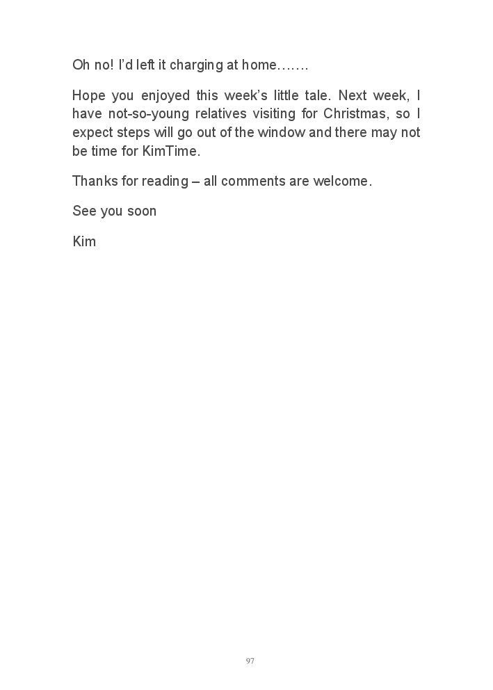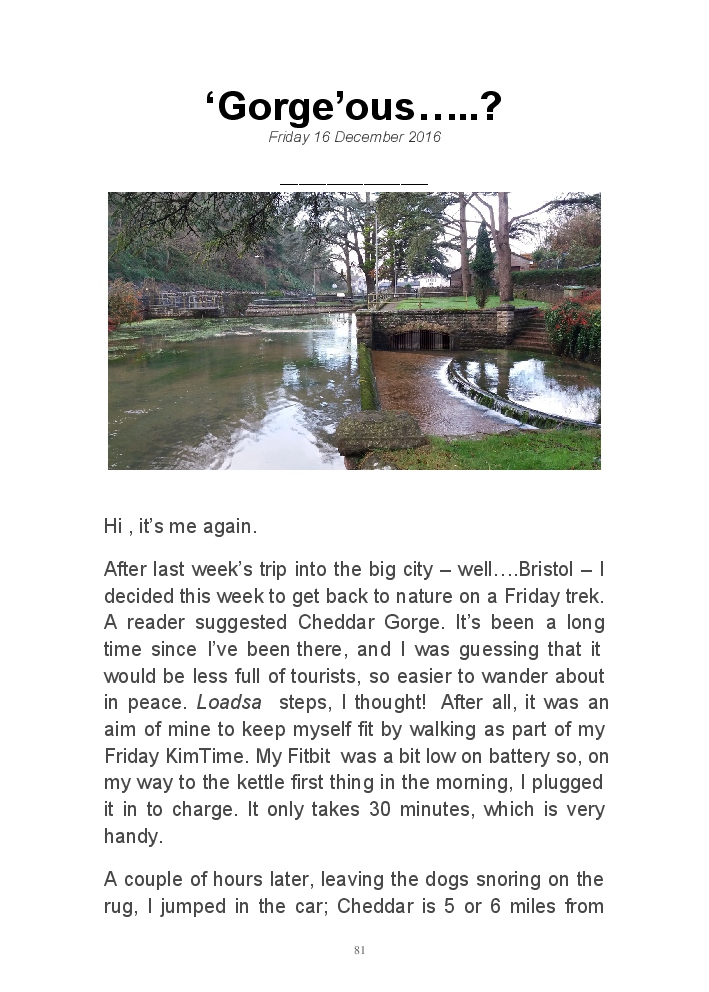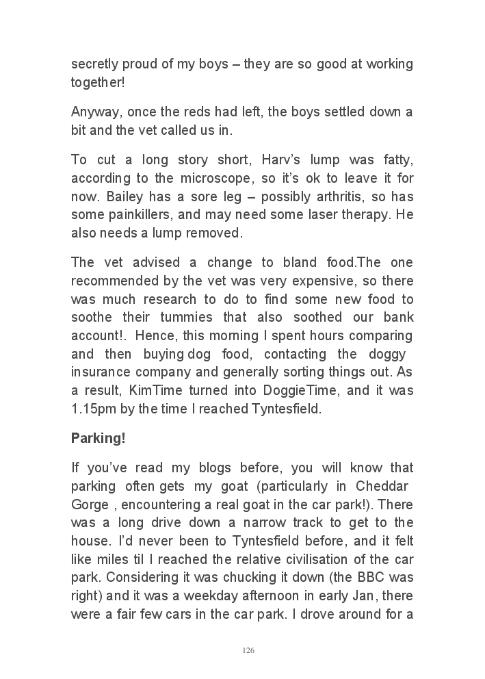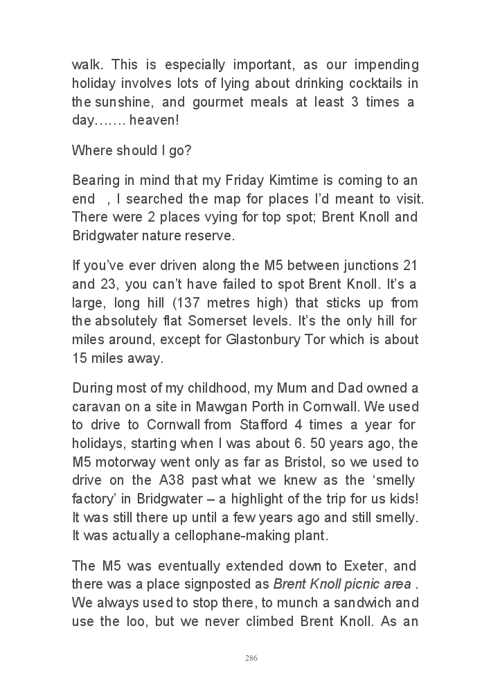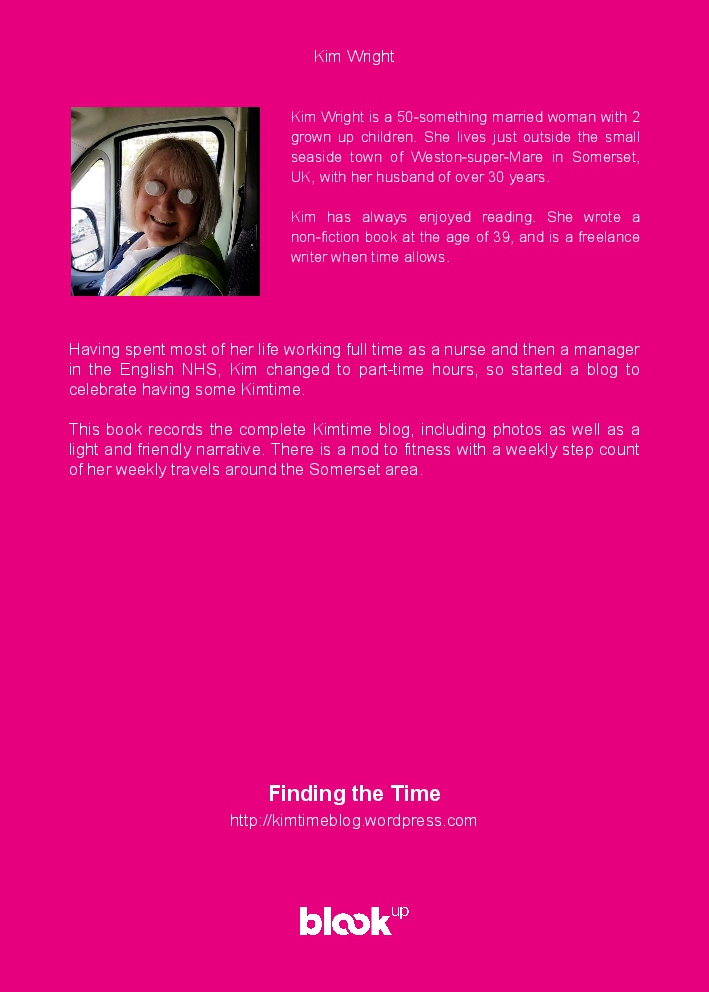 This book records the complete Kimtime blog, including photos as well as a light and friendly narrative. There is a nod to fitness with a weekly step count of her weekly travels around the Somerset area.