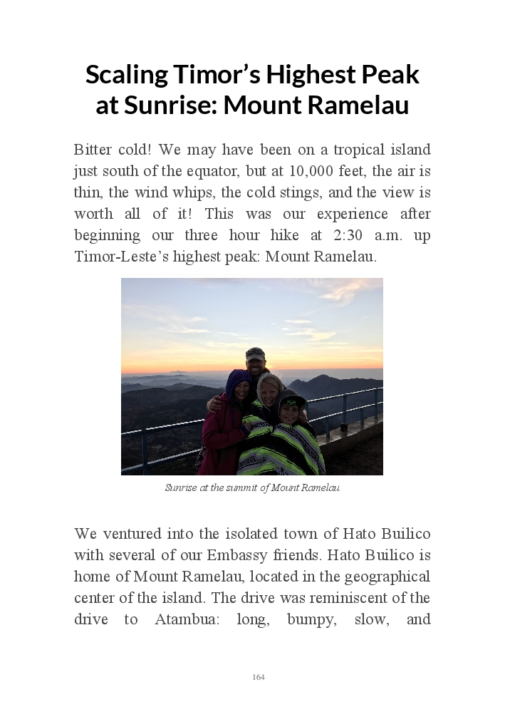 This book chronicles all of Madeline's blog posts and pictures that she took and published while in Dili in 2019. It includes vivid descriptions of life in Timor-Leste and exciting adventures within SE Asia.