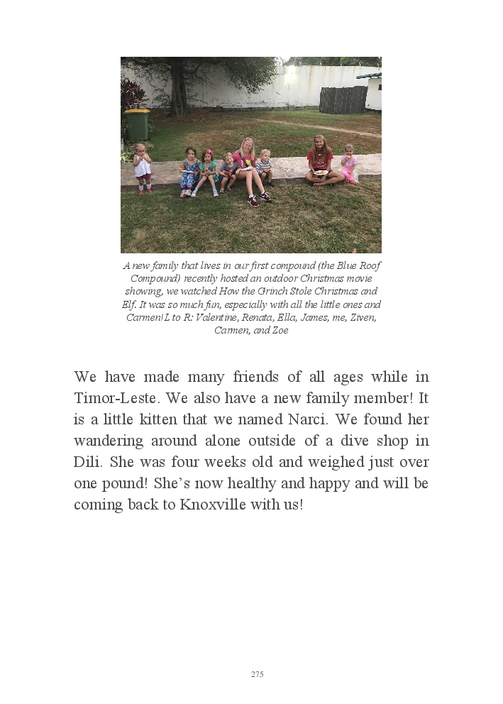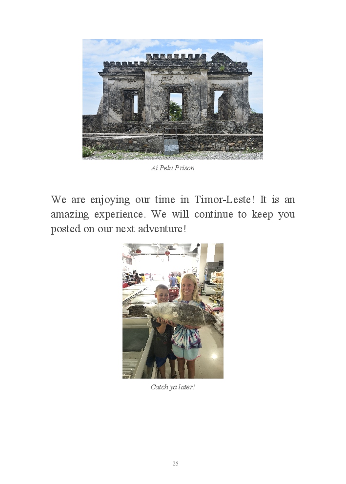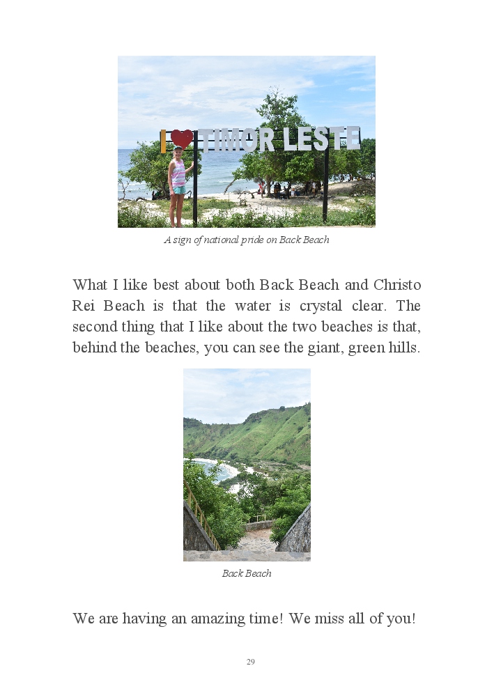 This book chronicles all of Madeline's blog posts and pictures that she took and published while in Dili in 2019. It includes vivid descriptions of life in Timor-Leste and exciting adventures within SE Asia.