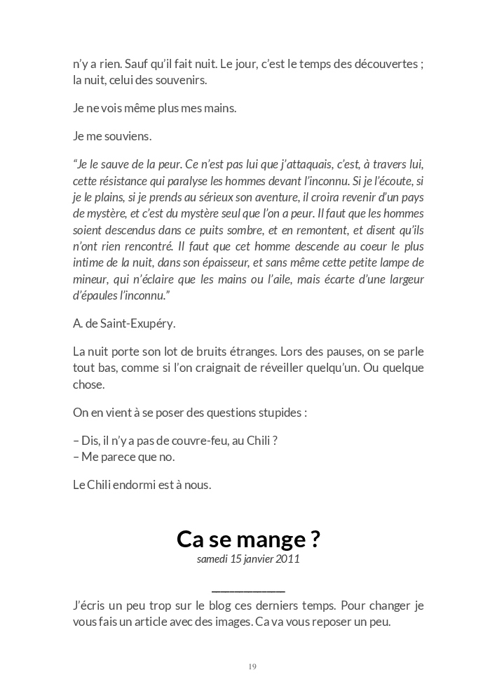 « Je le sauve de la peur. Ce n’est pas lui que j’attaquais, c’est, à travers lui, cette résistance qui paralyse les hommes devant l’inconnu. Si je l’écoute, si je le plains, si je prends au sérieux son aventure, il croira revenir d’un pays de mystère, et c’est du mystère seul que l’on a peur. Il faut que les hommes soient descendus dans ce puits sombre, et en remontent, et disent qu’ils n’ont rien rencontré. Il faut que cet homme descende au coeur le plus intime de la nuit, dans son épaisseur, et sans même cette petite lampe de mineur, qui n’éclaire que les mains ou l’aile, mais écarte d’une largeur d’épaules l’inconnu.» A. de Saint-Exupéry.