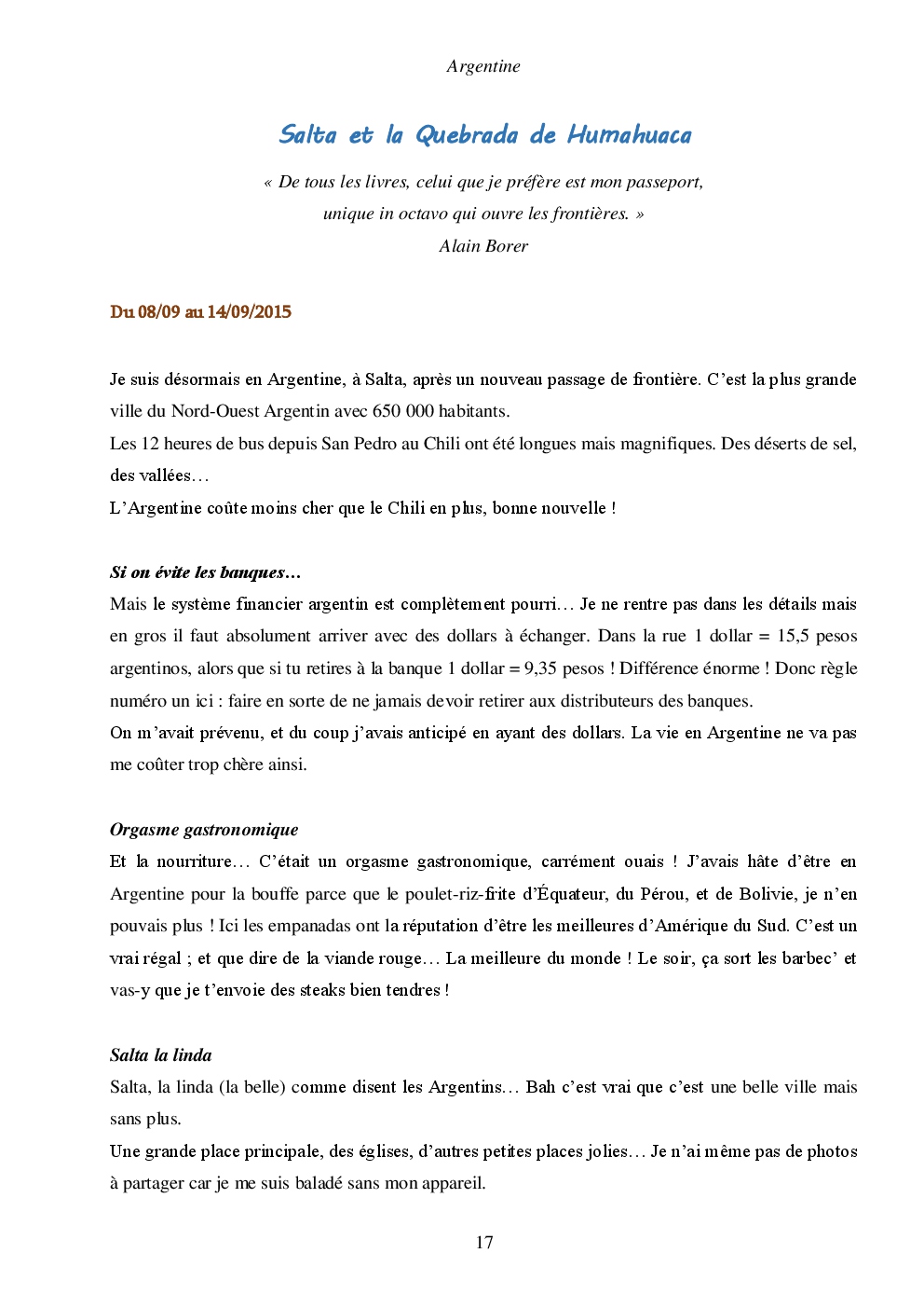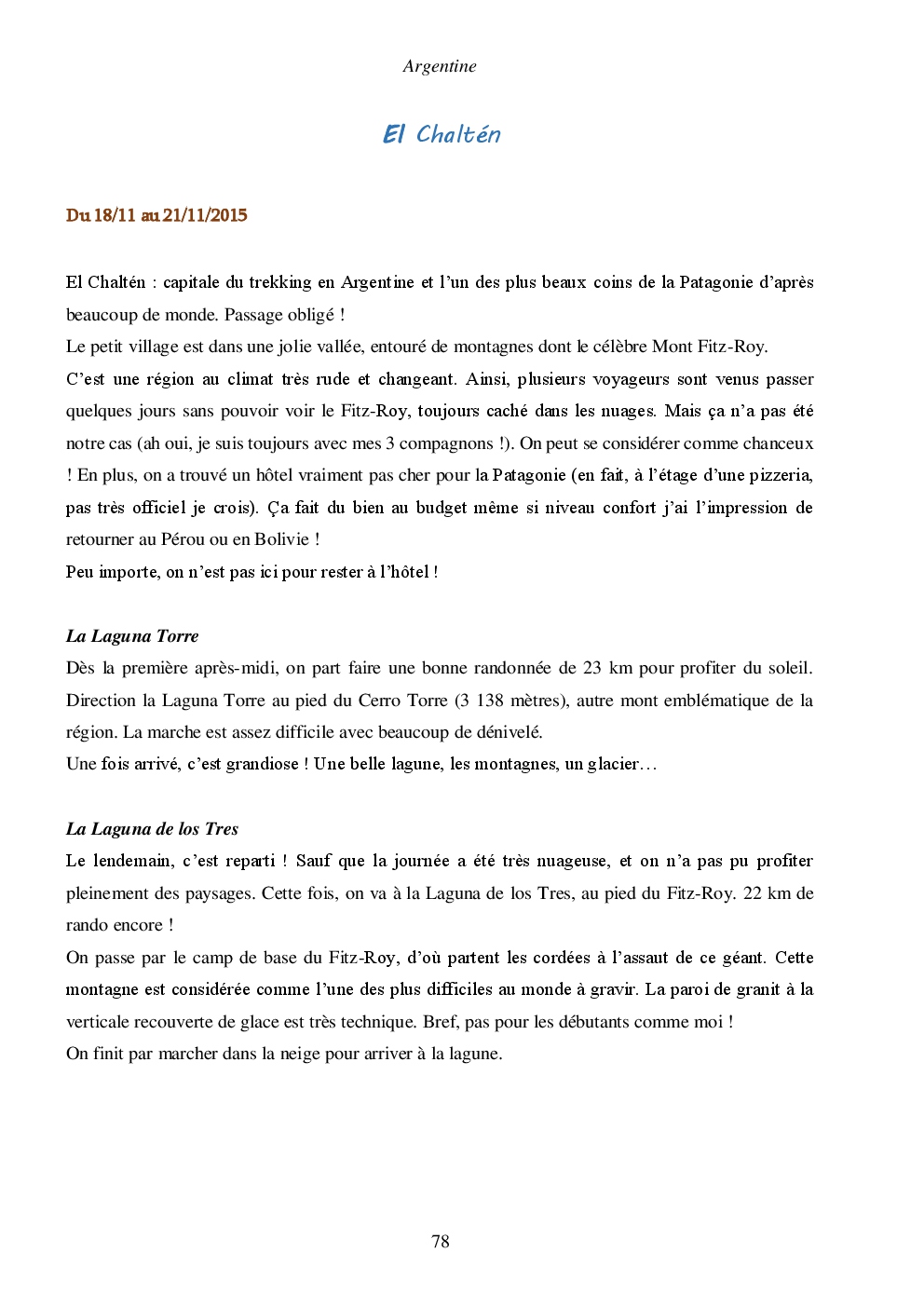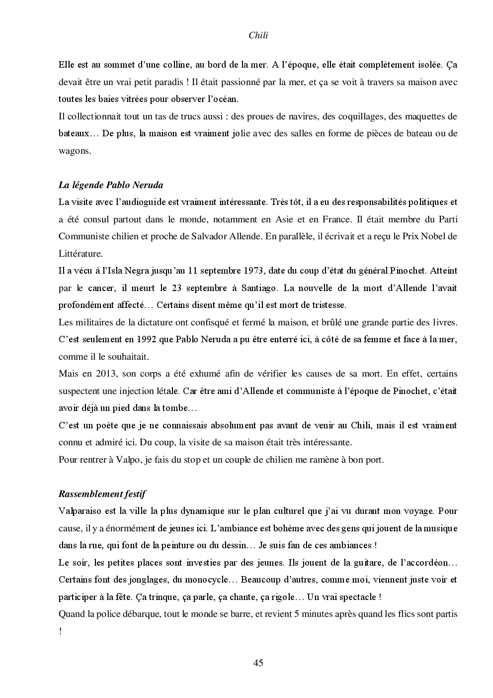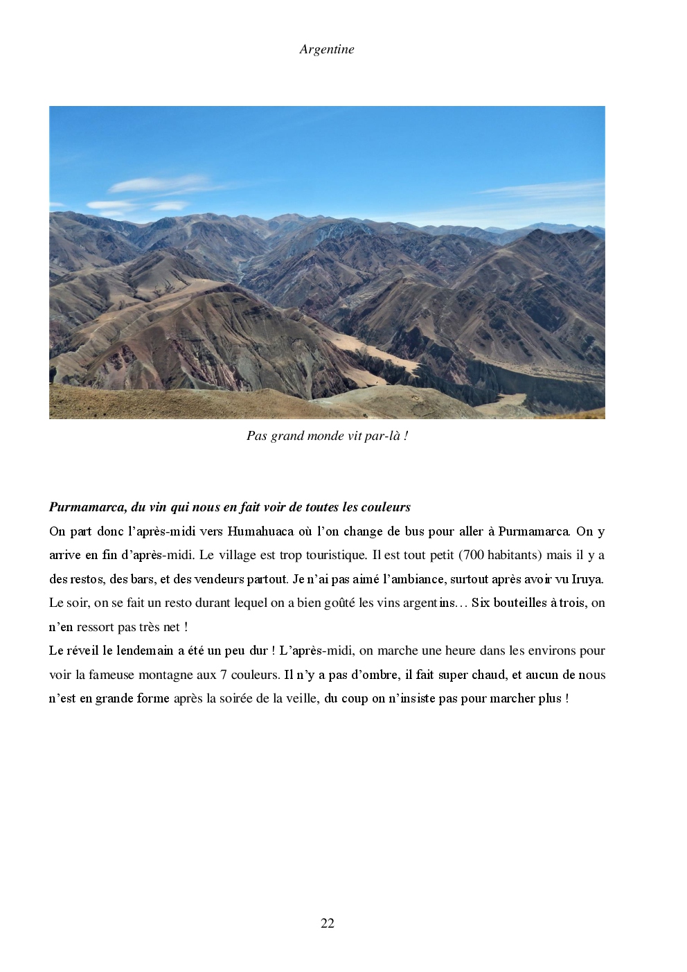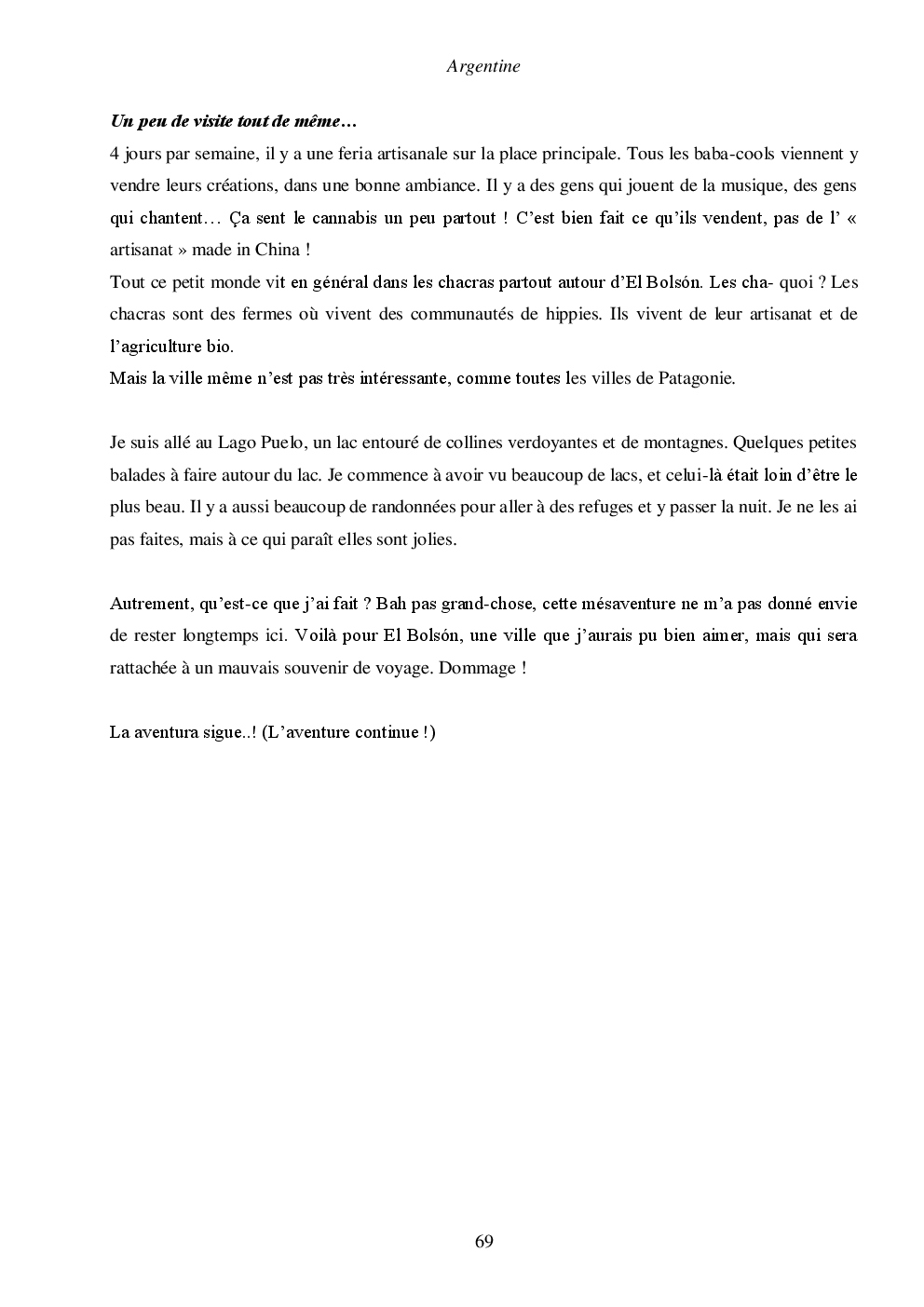 Dans ce livre se trouve la suite de mon voyage en Amérique du Sud : l'aventure continue ! Toujours entre mer et montagne, rencontre et partage, joie et galère... Le tout qui compose un souvenir inoubliable !
