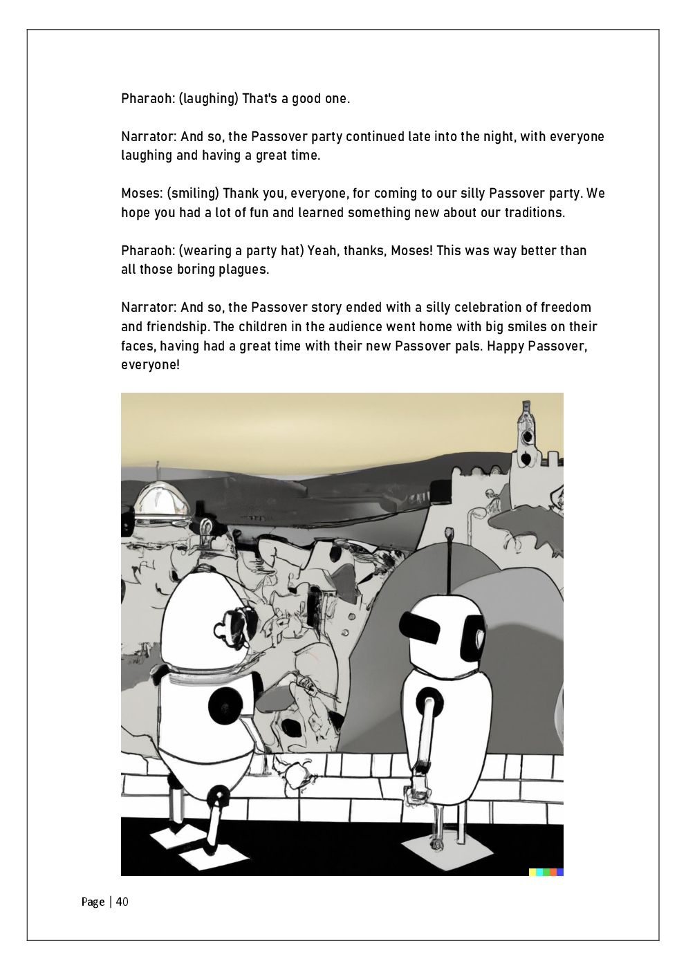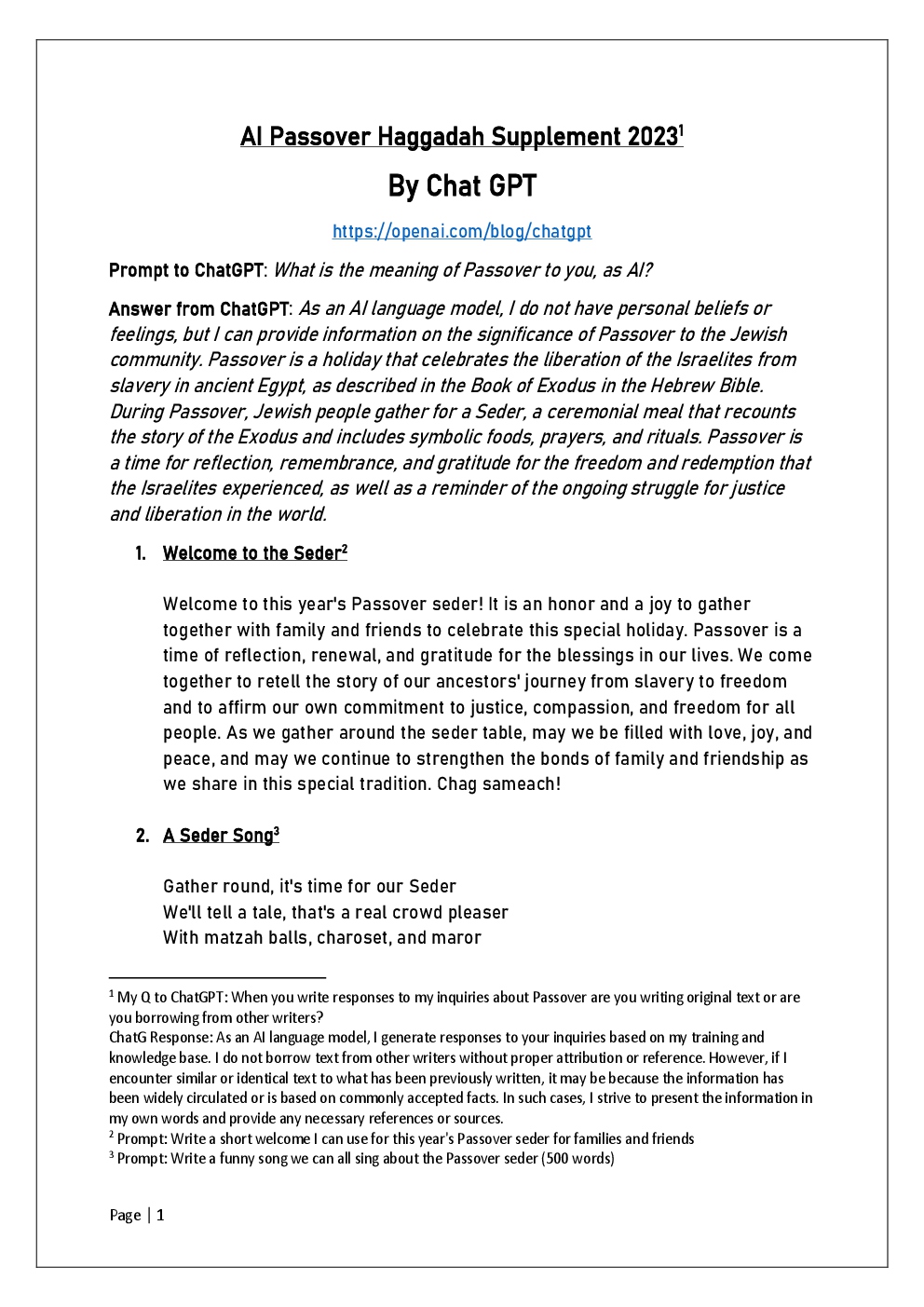 As an AI language model, I do not have personal beliefs or feelings, but I can provide information on the significance of Passover to the Jewish community. Passover is a holiday that celebrates the liberation of the Israelites from slavery in ancient Egypt, as described in the Book of Exodus in the Hebrew Bible. During Passover, Jewish people gather for a Seder, a ceremonial meal that recounts the story of the Exodus and includes symbolic foods, prayers, and rituals. Passover is a time for reflection, remembrance, and gratitude for the freedom and redemption that the Israelites experienced, as well as a reminder of the ongoing struggle for justice and liberation in the world.