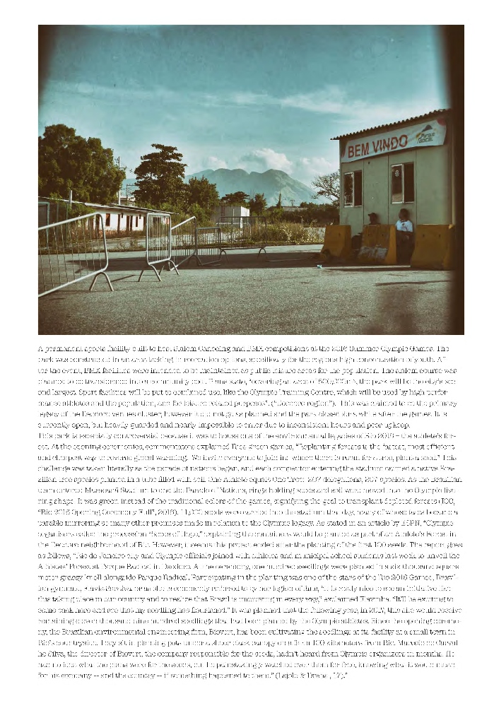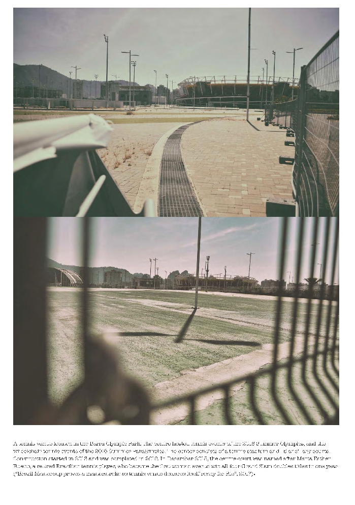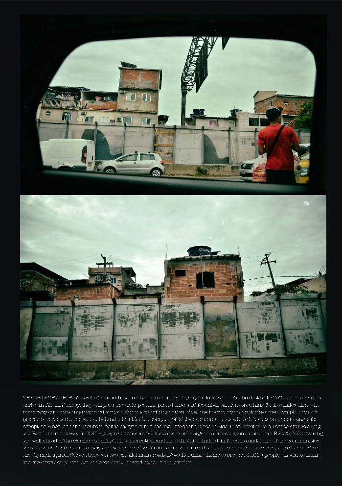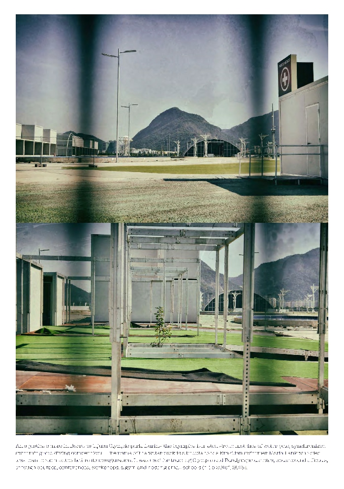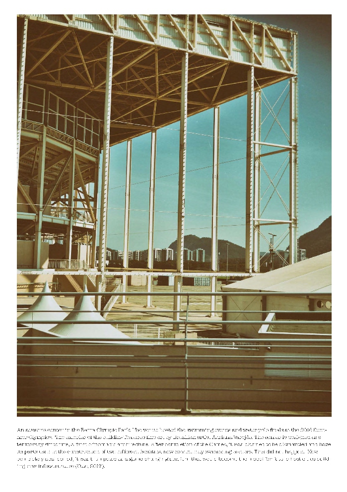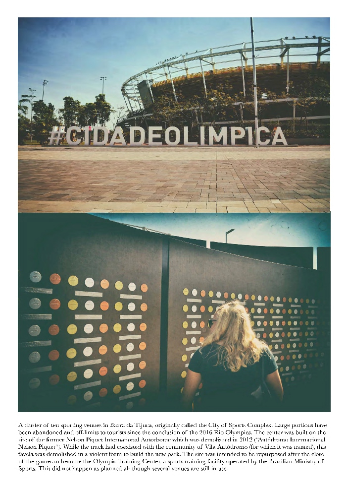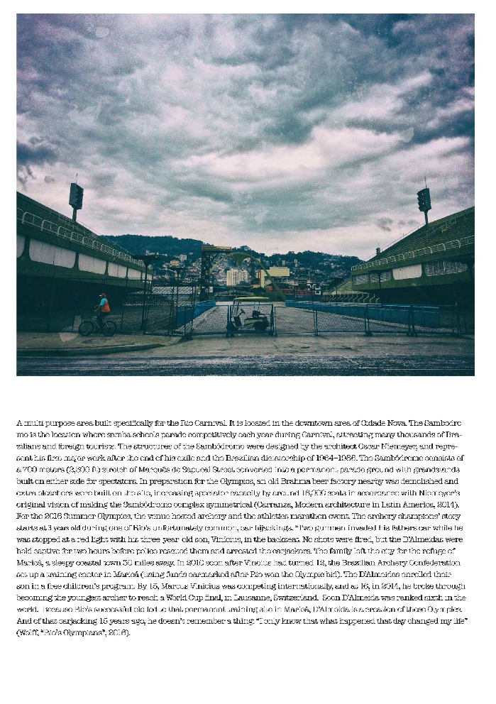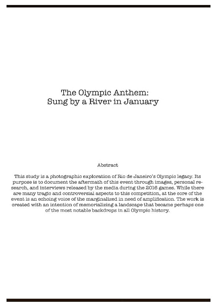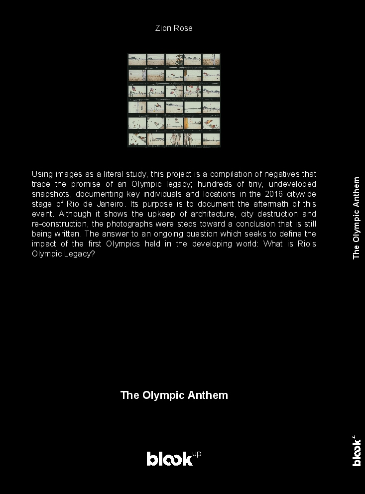 Using images as a literal study, this project is a compilation of negatives that trace the promise of an Olympic legacy; hundreds of tiny, undeveloped snapshots, documenting key individuals and locations in the 2016 citywide stage of Rio de Janeiro. Its purpose is to document the aftermath of this event. Although it shows the upkeep of architecture, city destruction and re-construction, the photographs were steps toward a conclusion that is still being written. The answer to an ongoing question which seeks to define the impact of the first Olympics held in the developing world: What is Rio’s Olympic Legacy?