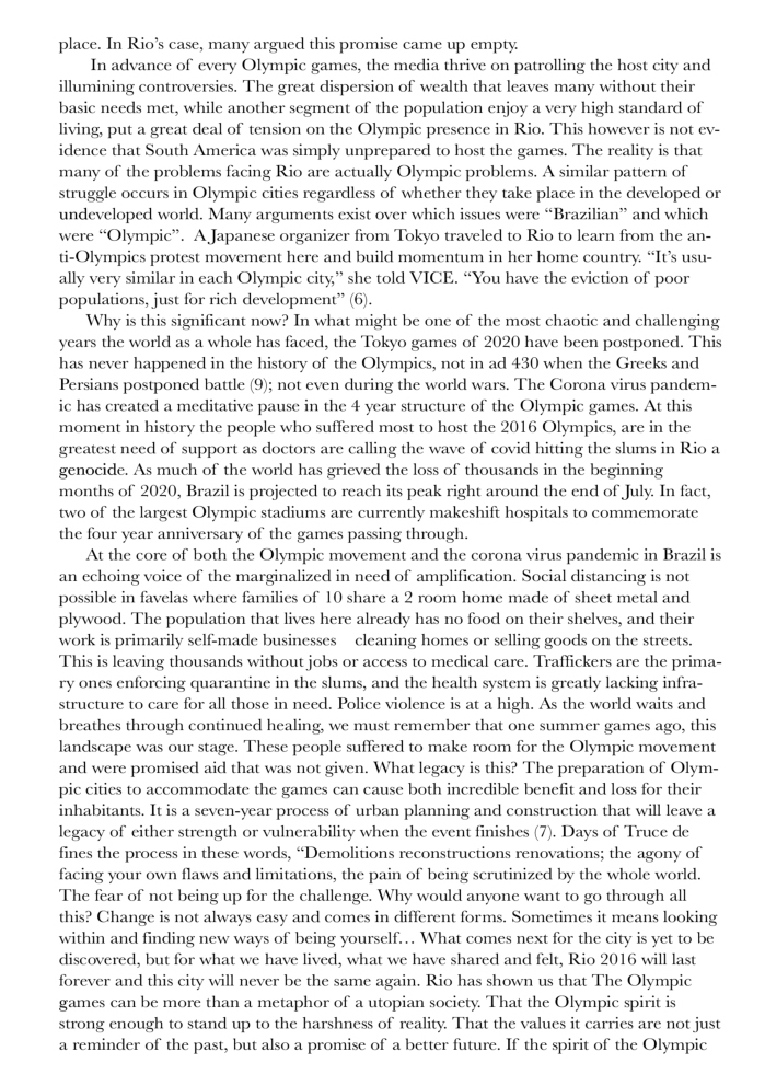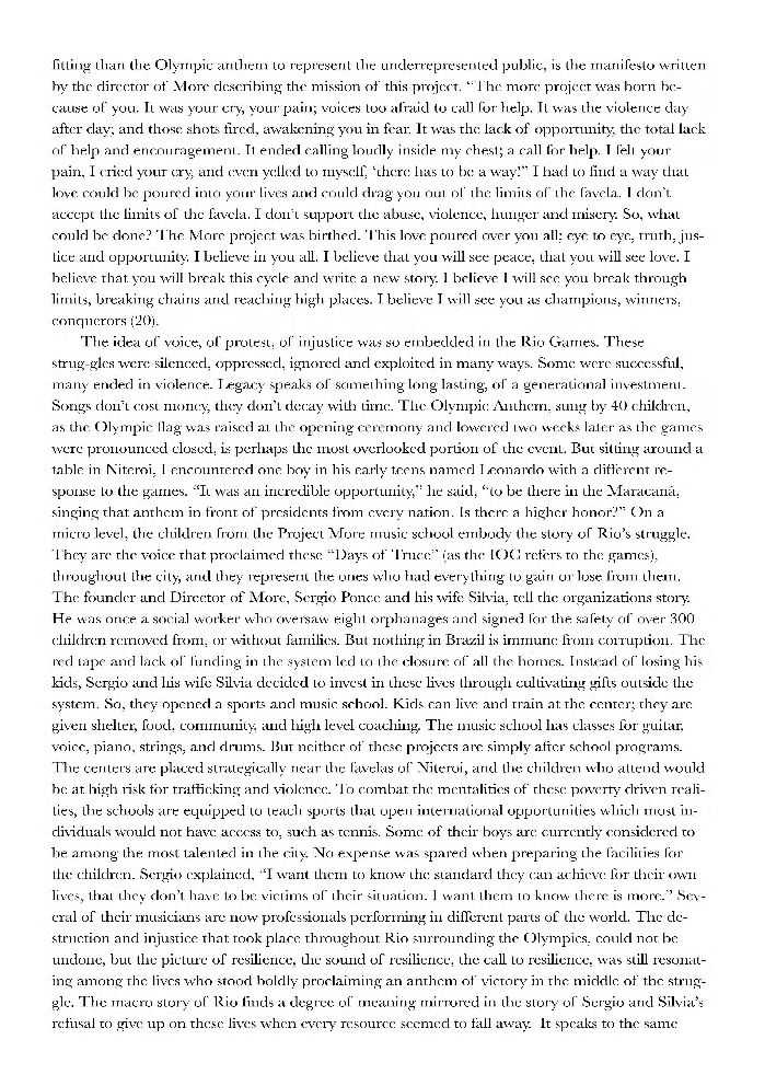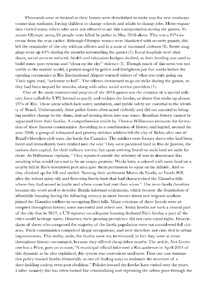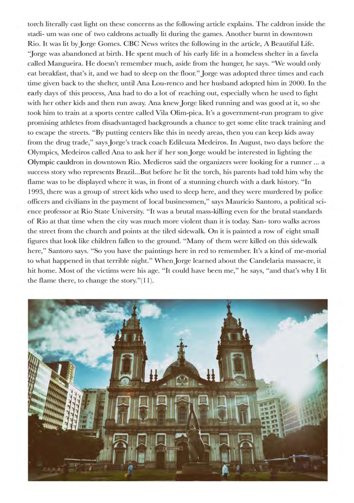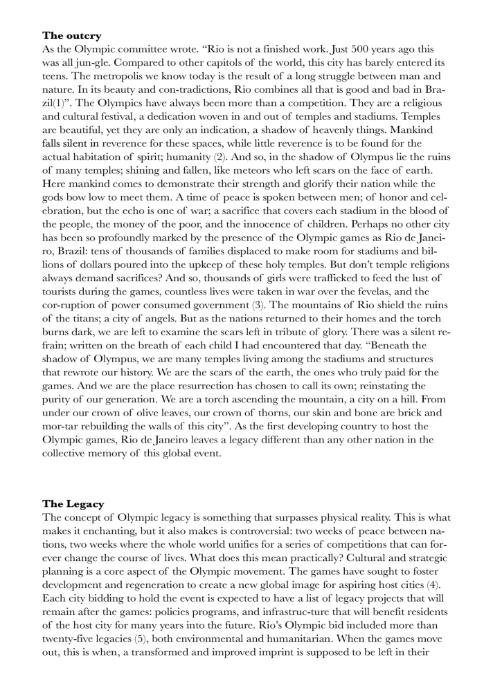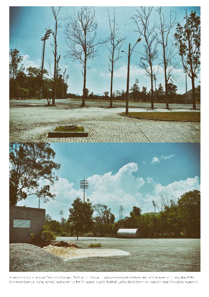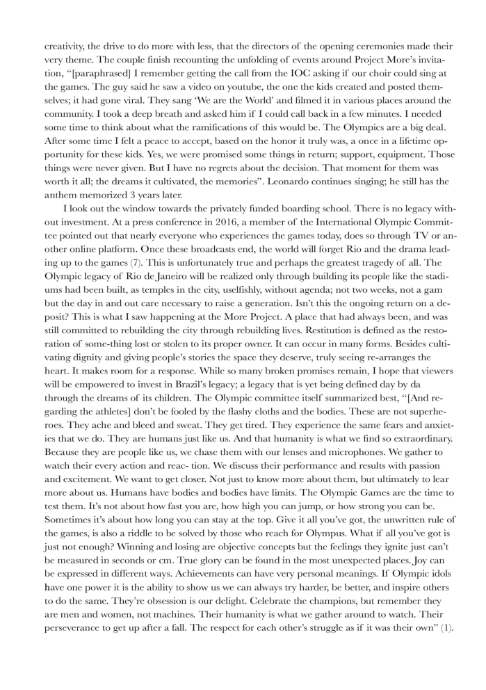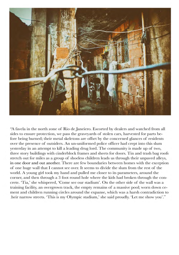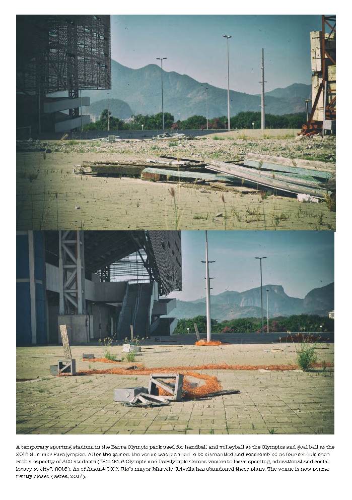 Using images as a literal study, this project is a compilation of negatives that trace the promise of an Olympic legacy; hundreds of tiny, undeveloped snapshots, documenting key individuals and locations in the 2016 citywide stage of Rio de Janeiro. Its purpose is to document the aftermath of this event. Although it shows the upkeep of architecture, city destruction and re-construction, the photographs were steps toward a conclusion that is still being written. The answer to an ongoing question which seeks to define the impact of the first Olympics held in the developing world: What is Rio’s Olympic Legacy?